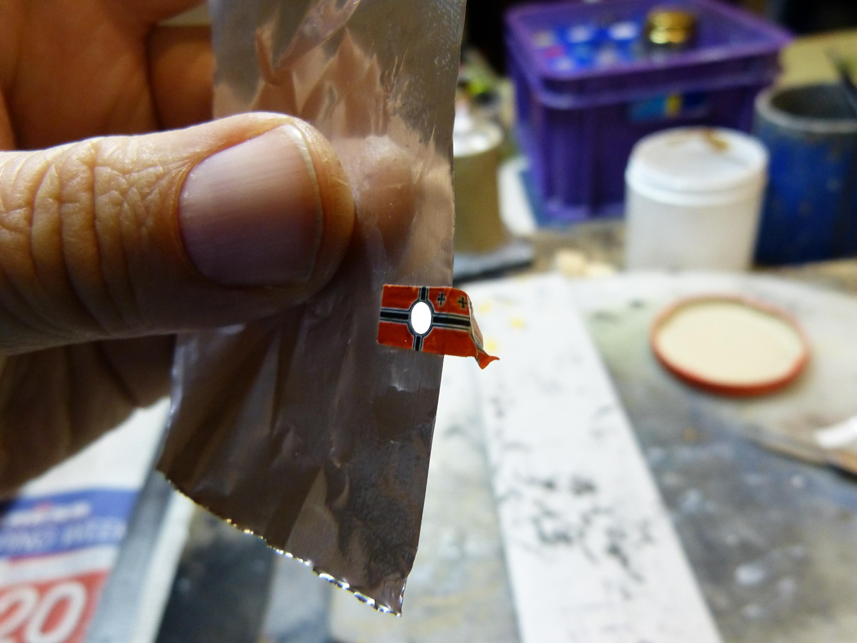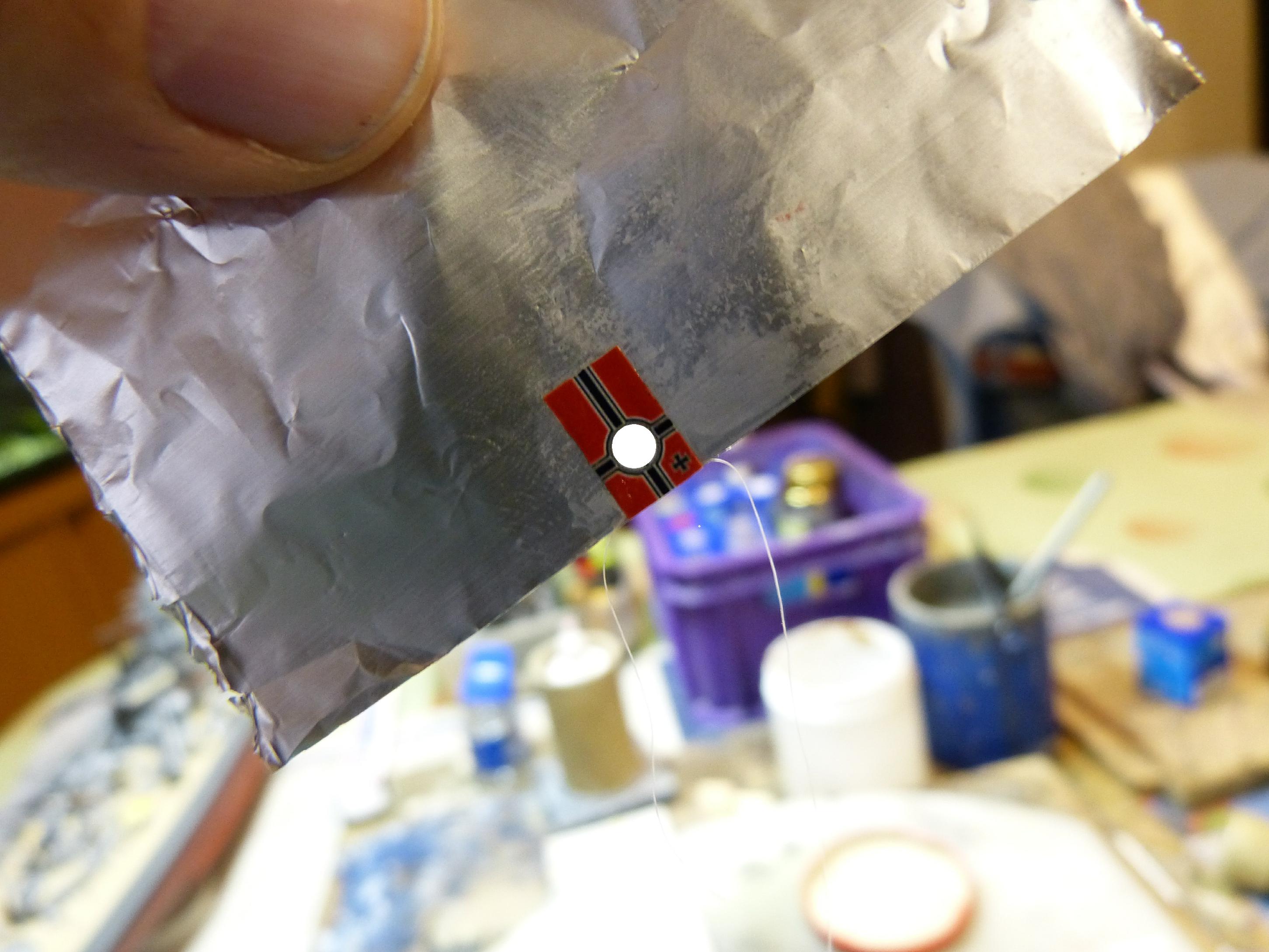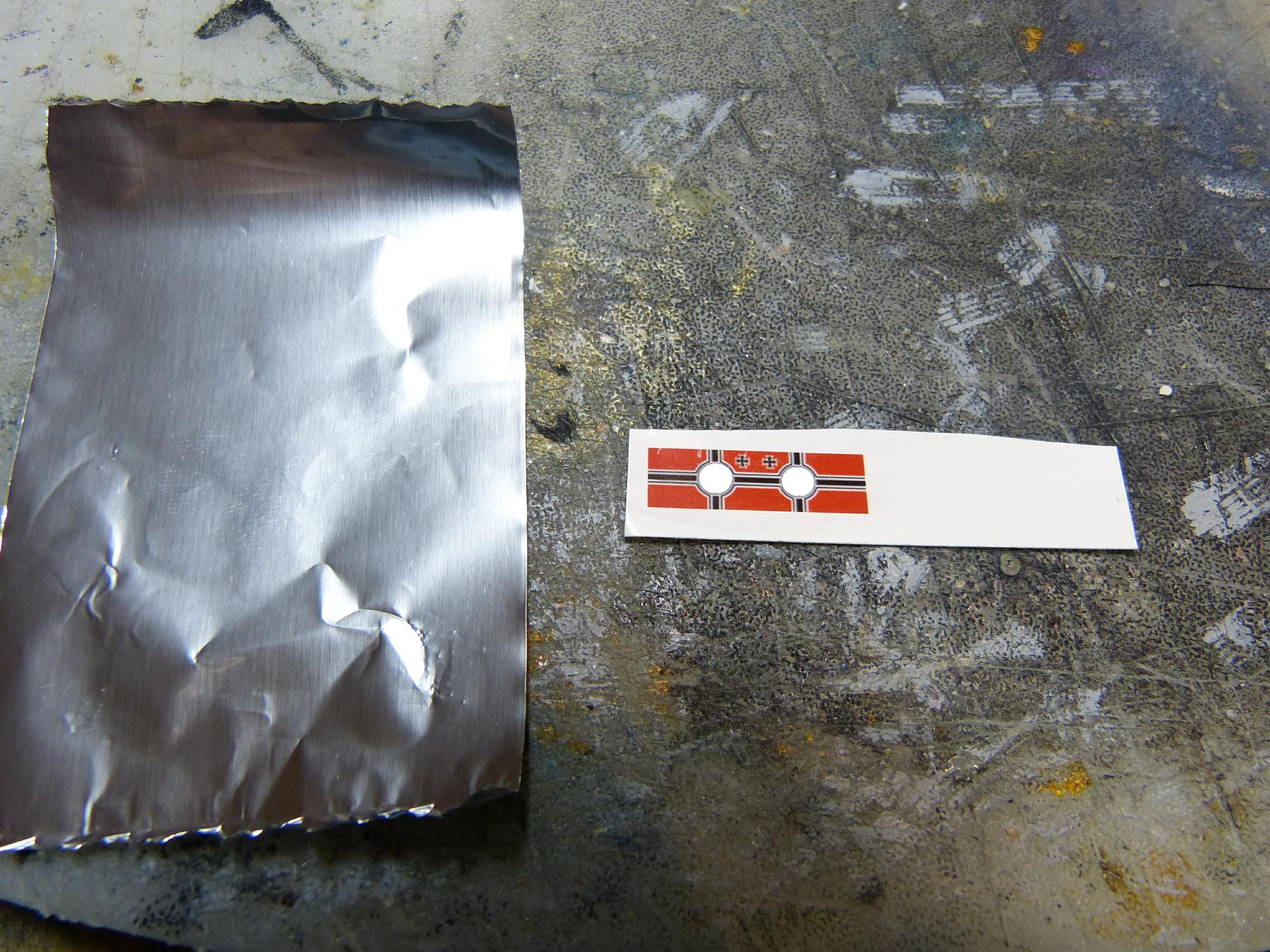 Benötigt wird zuerst ein entsprechendes Decal. Meins ist aus dem I-Net und auf weißer Decalfolie ausgedruckt. Fahnenbreite (einfach) hier ca. 10 mm. Dazu kommt ein Stück handelsübliche Alufolie. Diese dient dazu, das Fähnchen am Ende „zurechtbiegen“ zu können. Ferner wird ein Stück weißes Rigging-Material 70 denier benötigt.