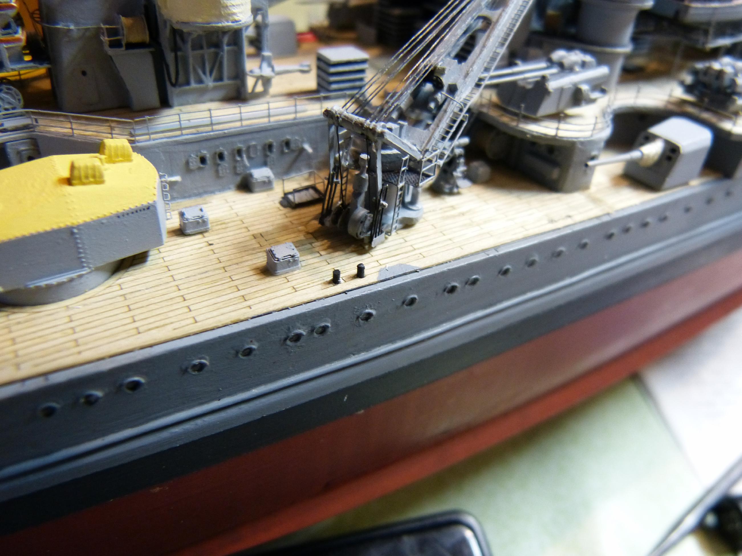 An den großen Bordkränen habe ich auch noch weitergetüftelt (Fullscratch), der Steuerbord-Kran ist am weitesten (aber noch nicht fertig). Hier steht er nur zur Probe. Vor dem festen Anbringen will ich noch die schwere Flak und die Reling in dem Bereich befestigen.