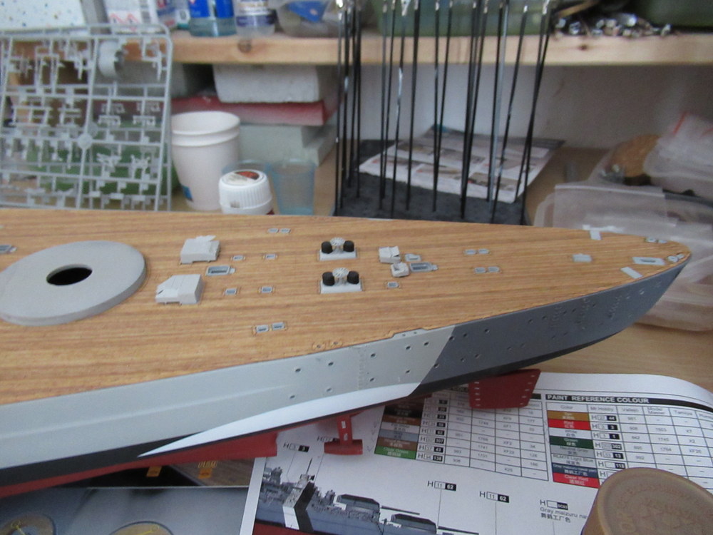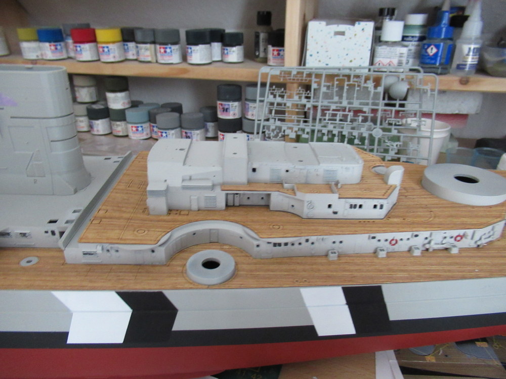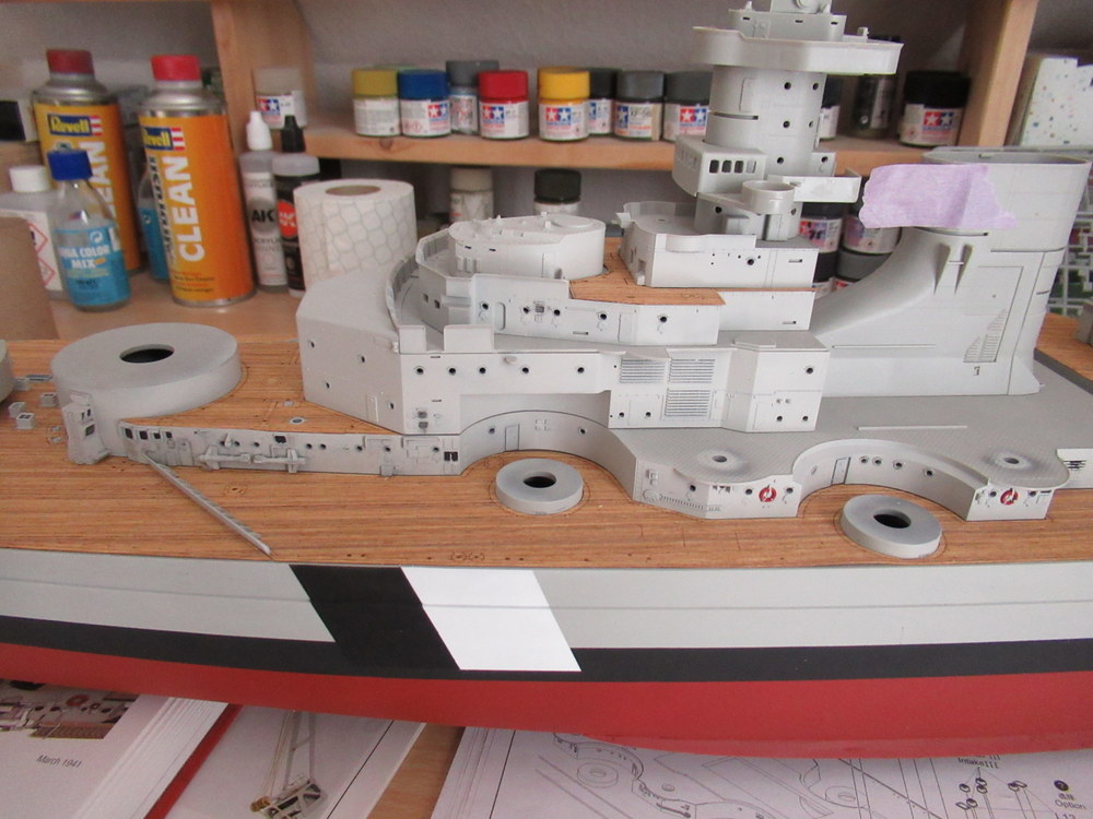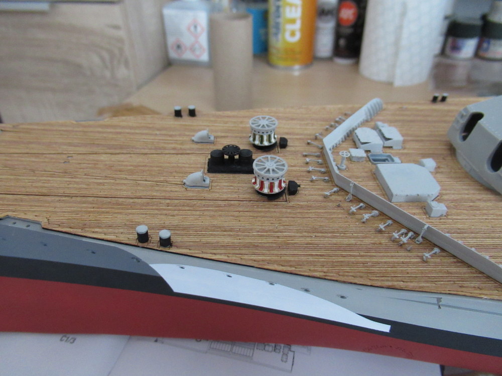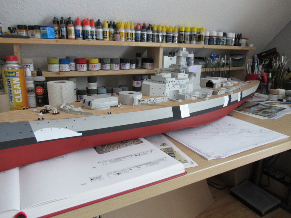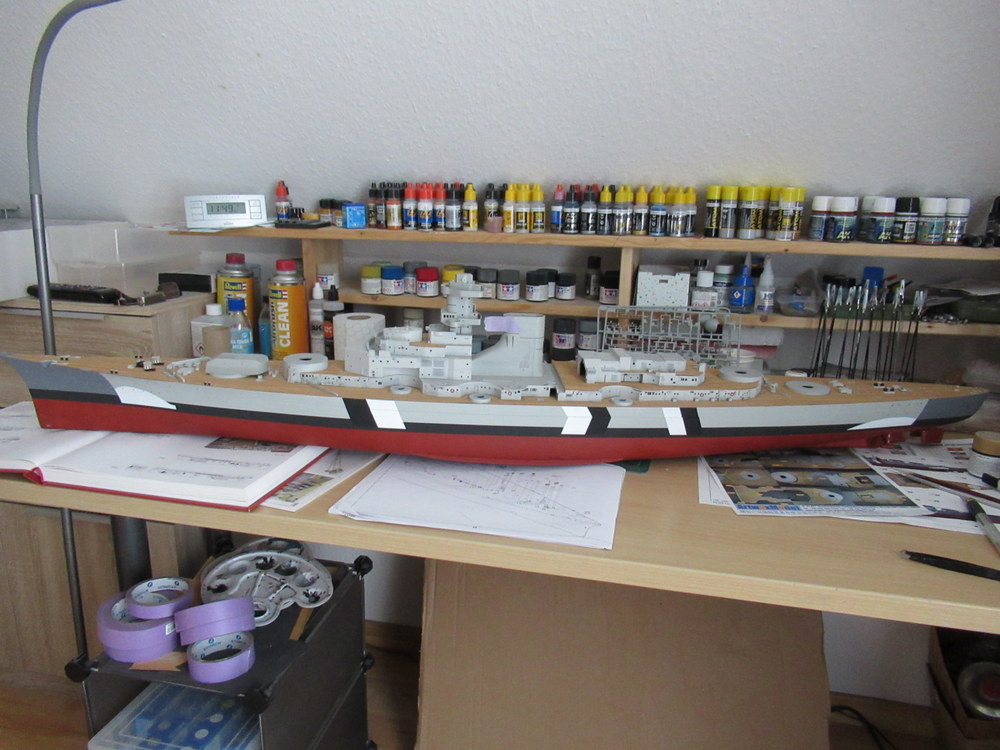 Dann wurden Schwarzweisse Streifen vom Rumpf über die Aufbauten gemacht , die Turmdecken A und D waren Rot