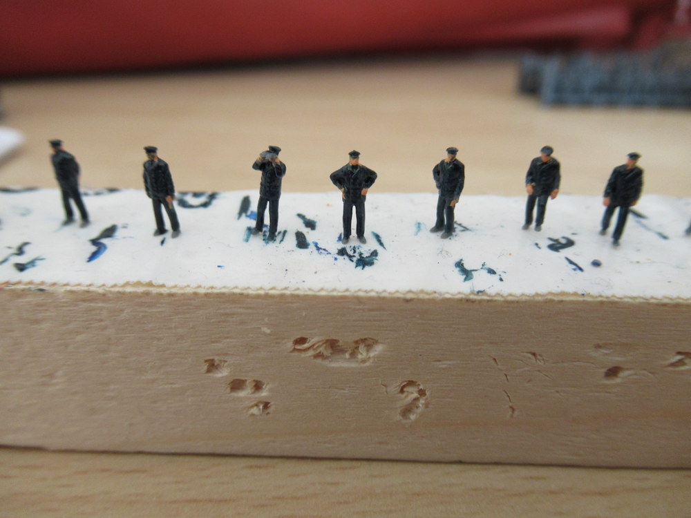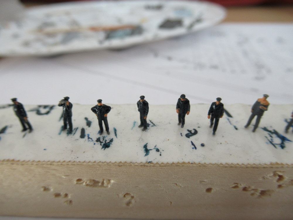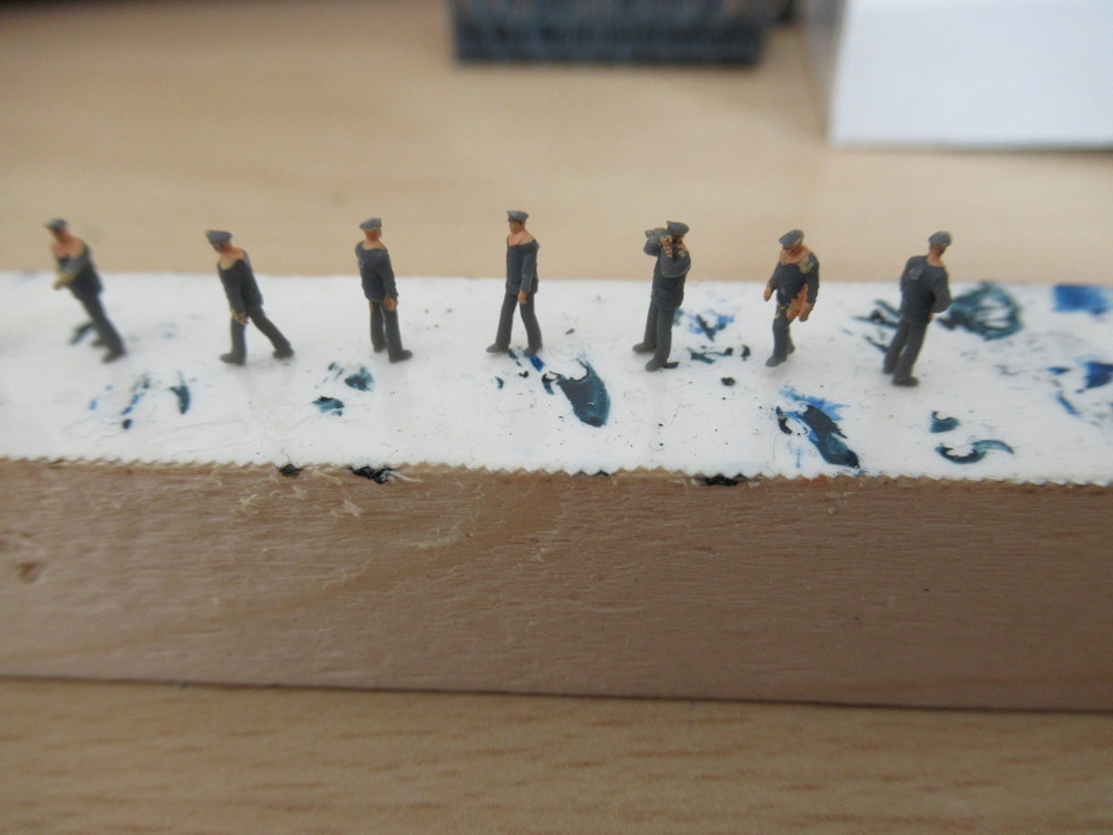Damit es aber auch was weiter geht hab ich mir mal die Manschaft vor genommen . Die frage nach den Uniformen bzw der Farbe ist soweit geklärt . Jacken wie Hosen waren in einem Schwarz Blau . Hier habe ich das DarkSeaBlue von Ak 2234 als passend gefunden. Auf orginal Bildern kann man erkennen , das die Matrosen Teils auch Grauweisse Hosen anhatten.