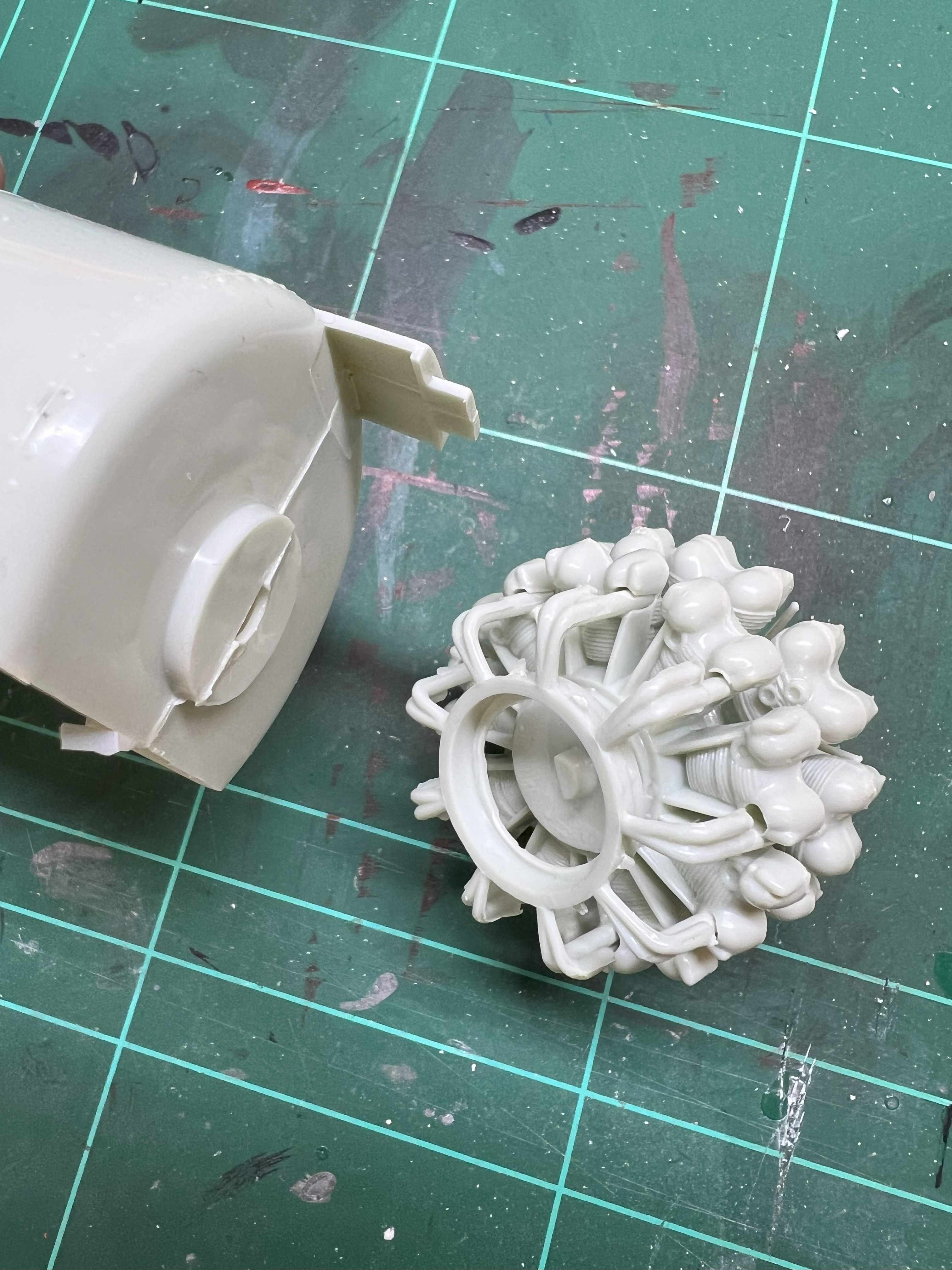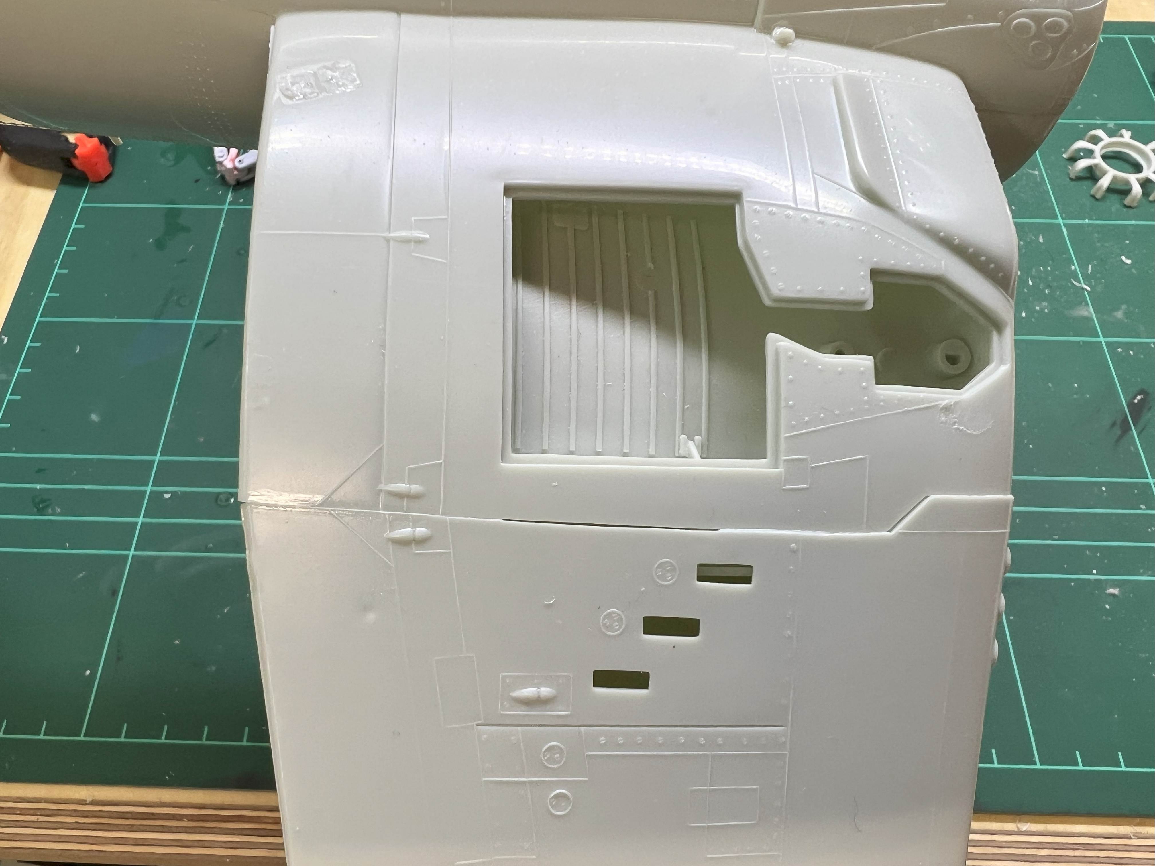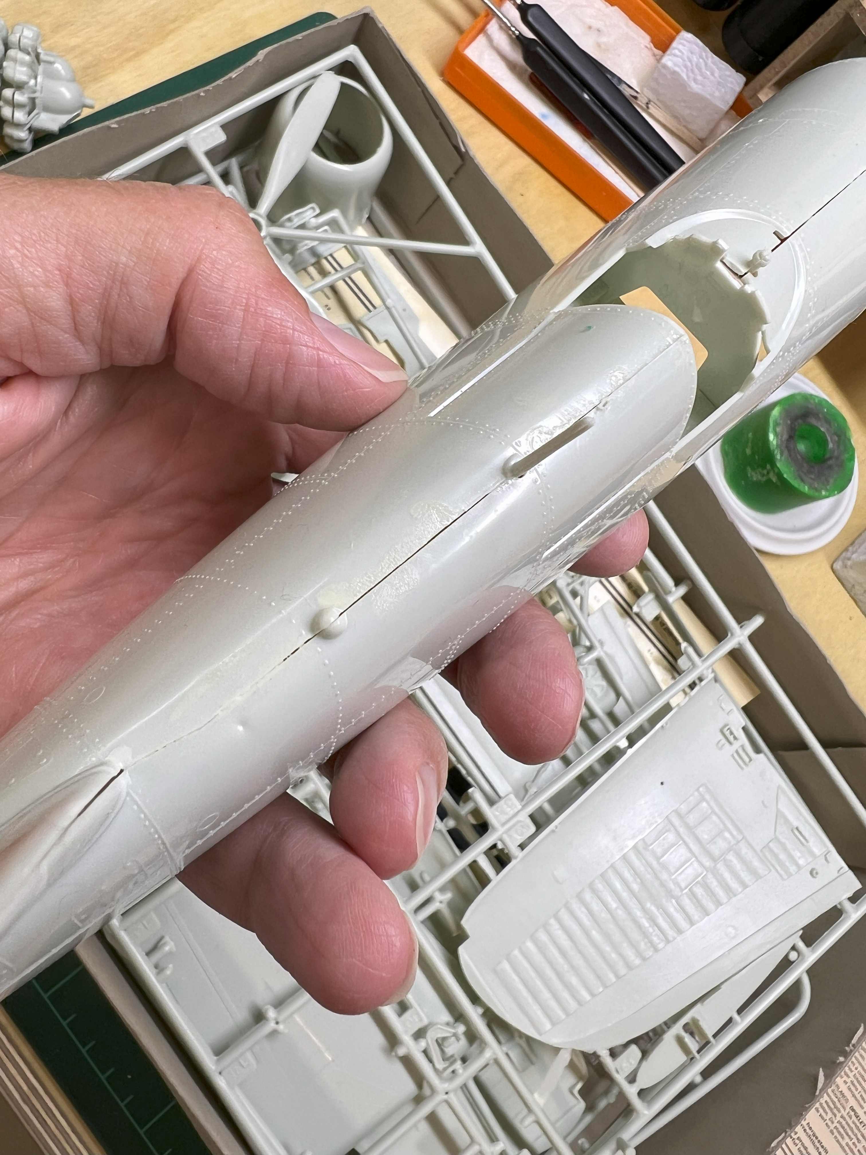 Die Sinkstellen an Propellerblättern und auf der Nase könntest du noch verspachteln und verschleifen. (Wenn schon, denn schon.) Schade, dass der Flügel am Knick diese Stufe hat. Das kann man wohl nicht wegschleifen. Ich habe Klebestellen mitunter mit einer Rasierklinge wieder aufschneiden können.