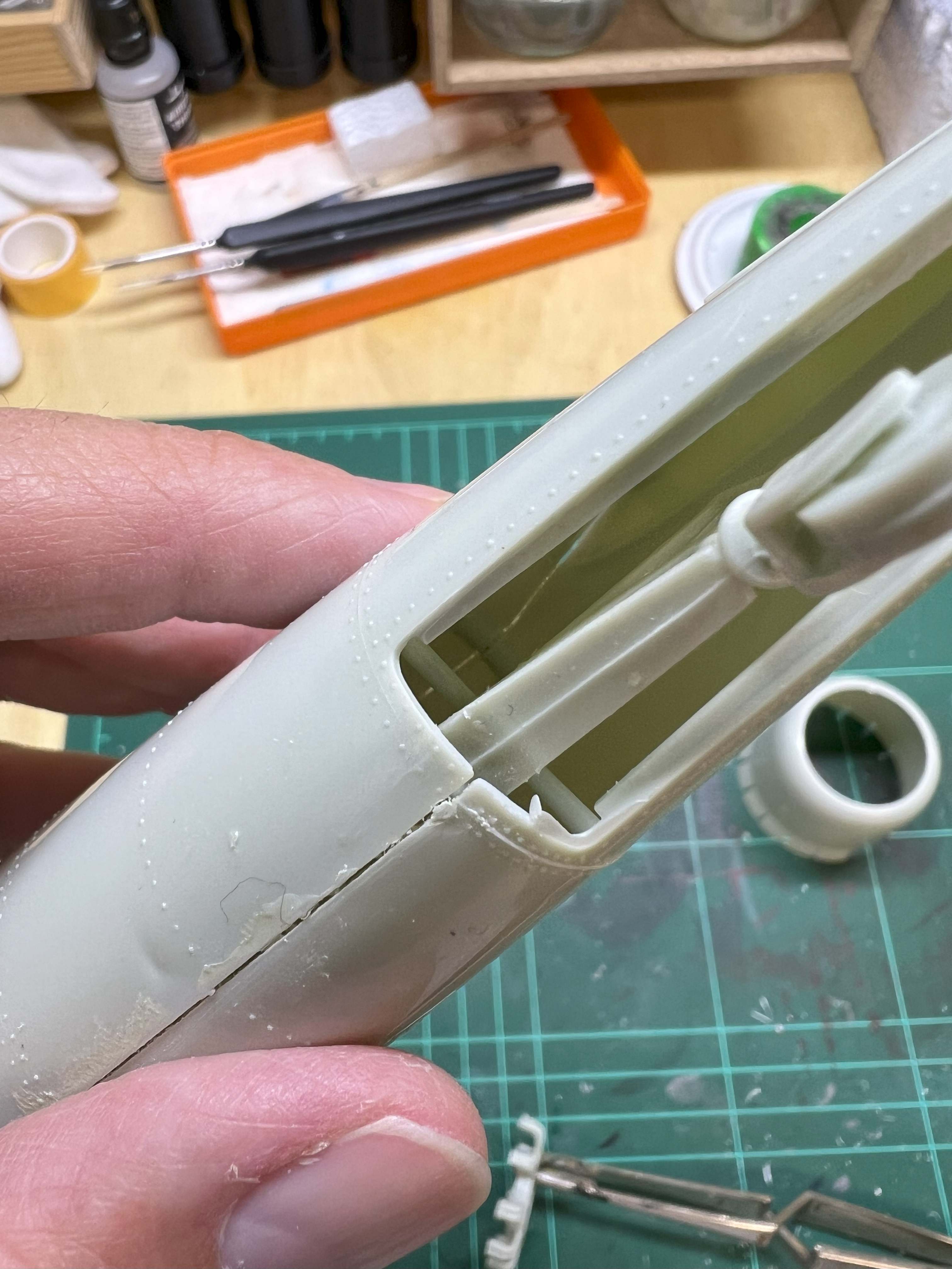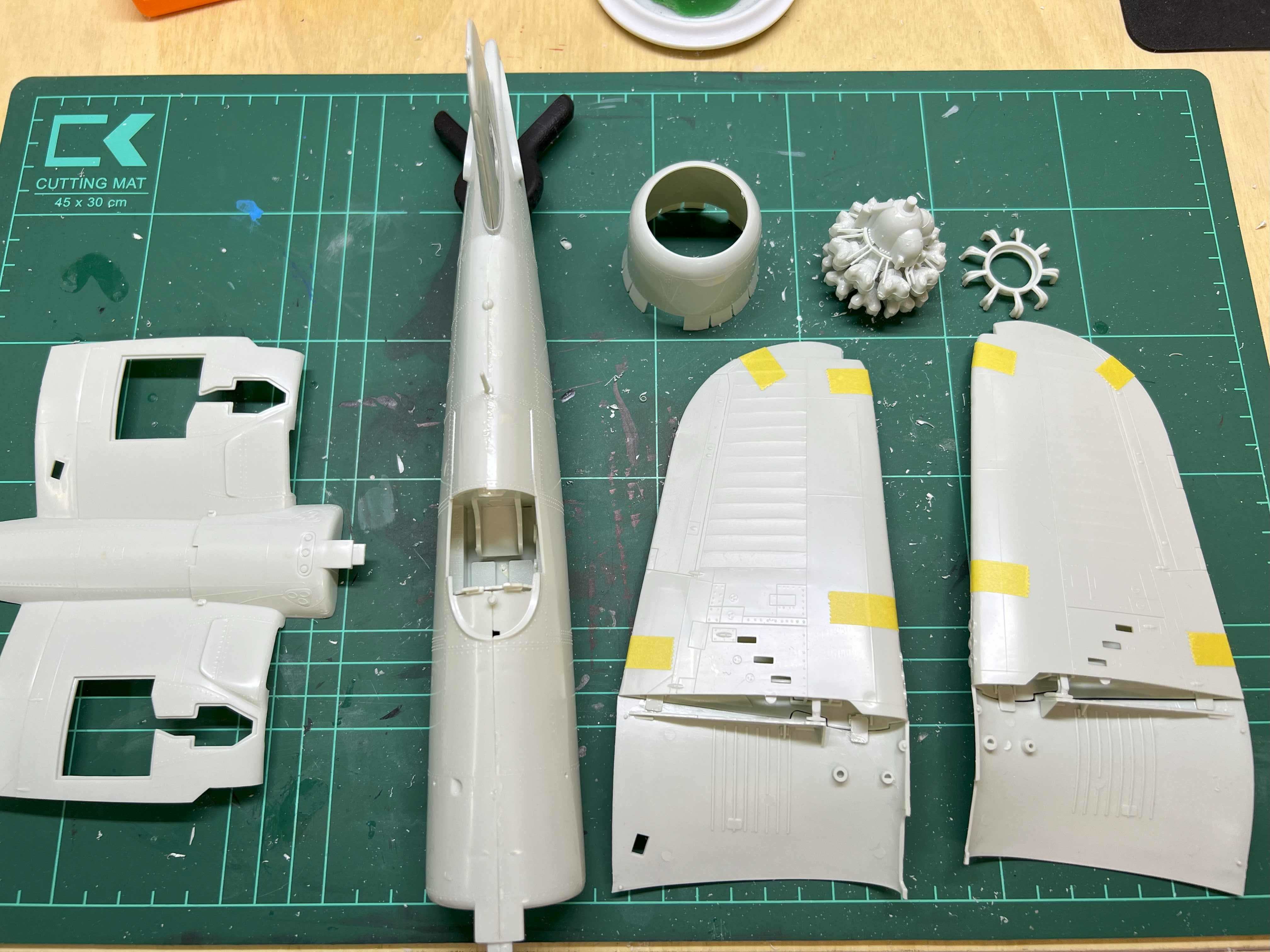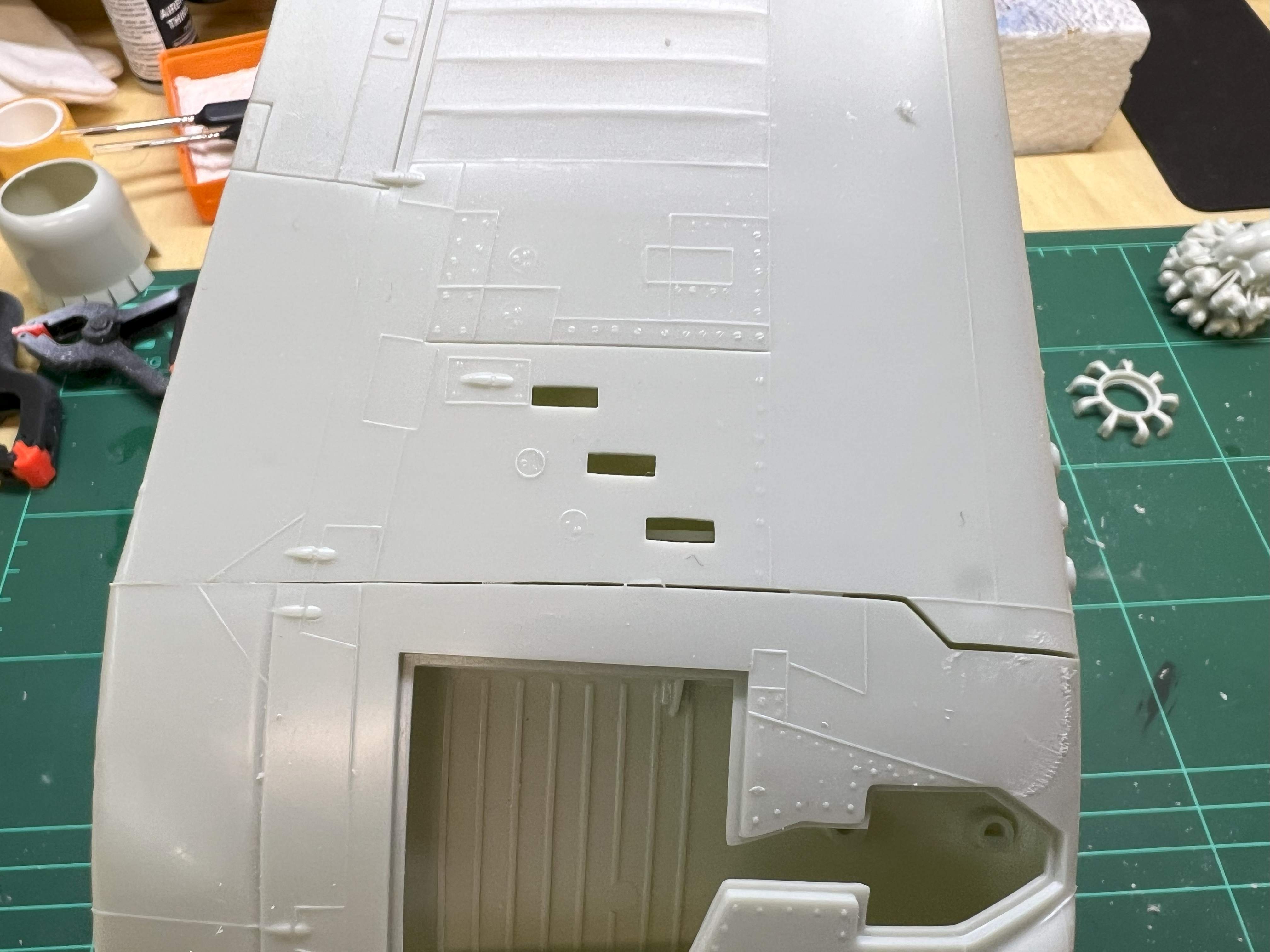 Ich habe ein paar weitere Teile entgratet. Unter anderem die Flügel und die Ober- und Unterseite zusammengeklebt. Die Grate an den Flügelkante sind schon ziemlich grob, aber ich habe mich entschieden diese vor dem Zusammenkleben nicht abzuschleifen, um ggf. Passungenauigkeiten damit auszugleichen.