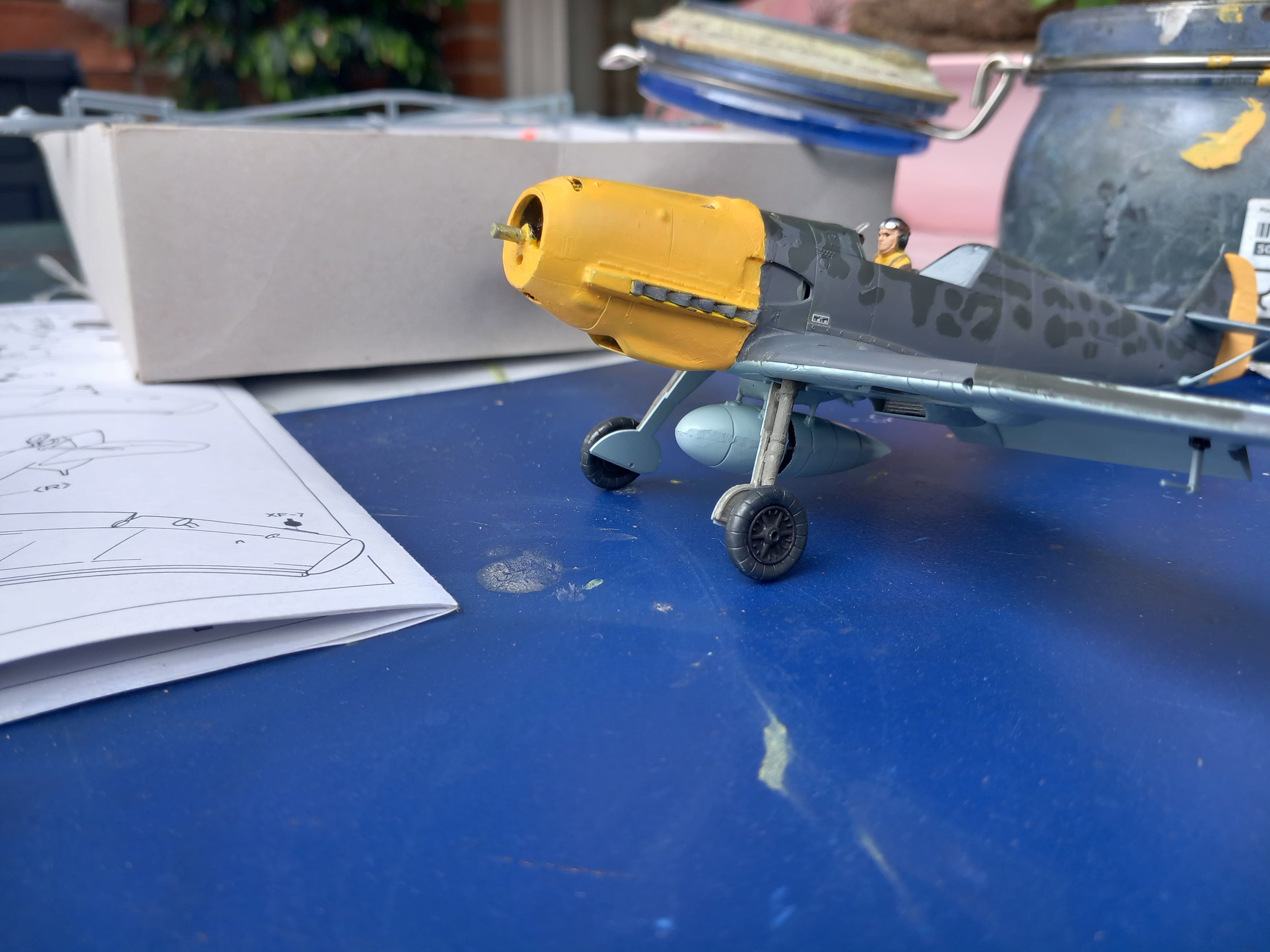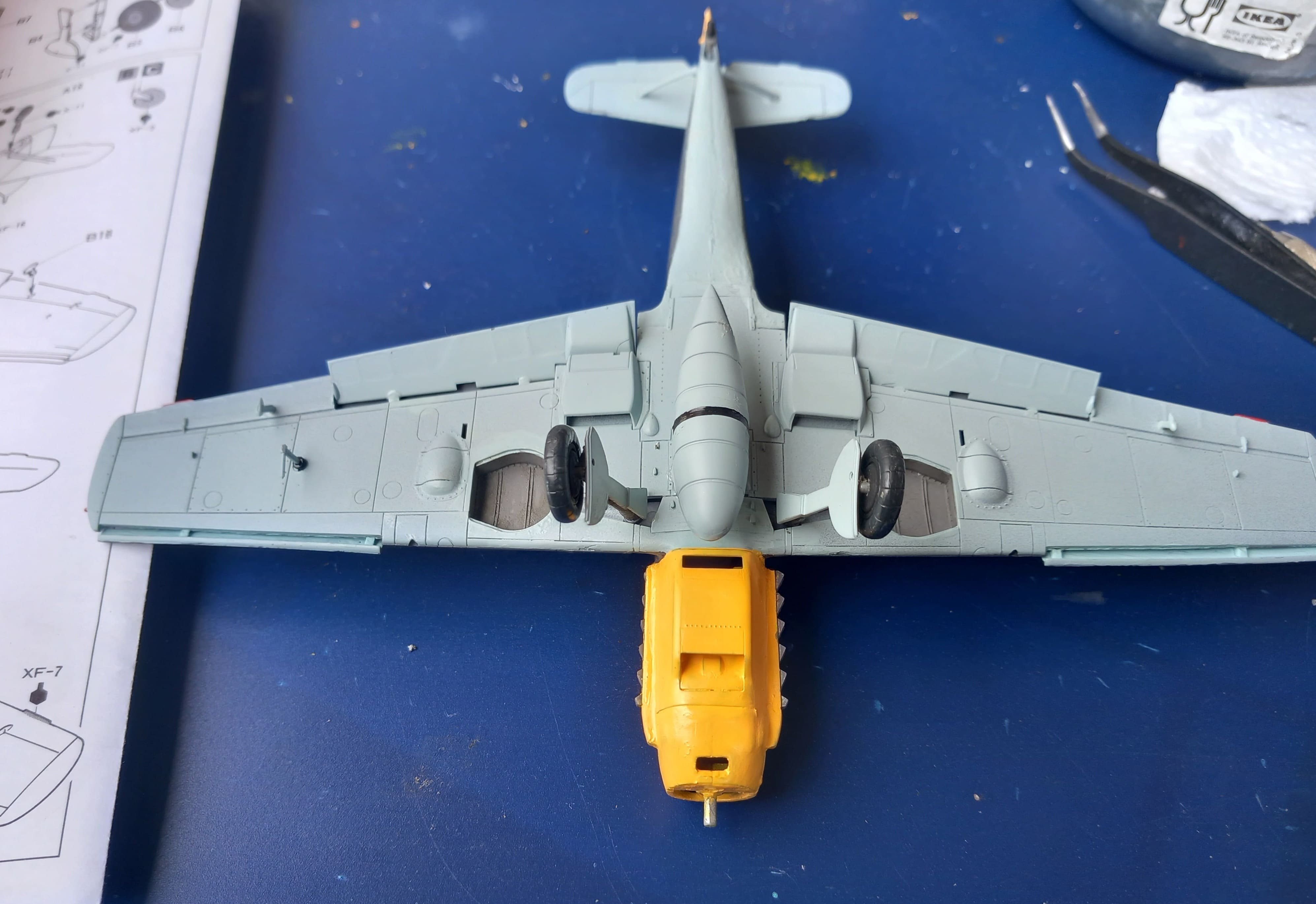 Mein Kampf mit der gelben Farbe. Hab diese jetzt 4 Mal dünn aufgetragen. Bei genauem Hinsehen schimmert der Untergrund immer noch durch, gleichzeitig beginnen die Konturen wieder zuzulaufen. Ich lasse das jetzt so. Mit dem Ergebnis kann ich leben. Auch das Fahrwerk ist inzwischen angebaut. Jetzt kommt der zusätzliche Tank darunter. Gruß Ingo
