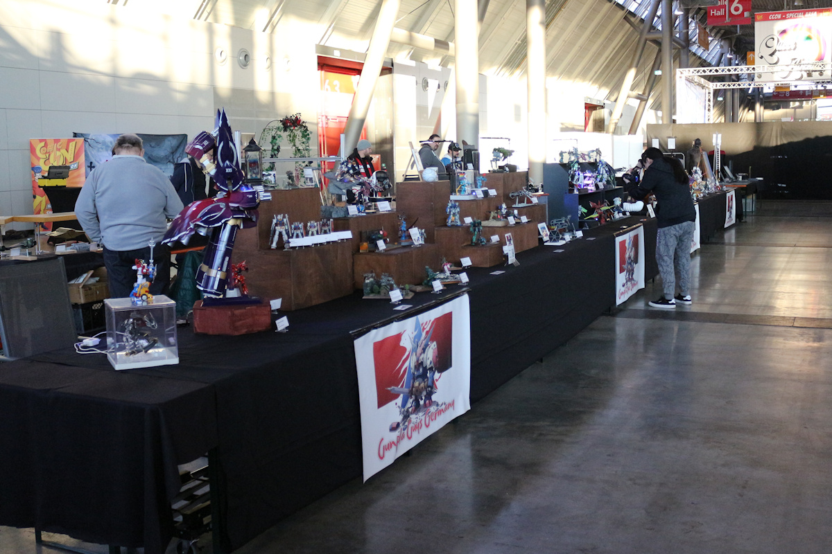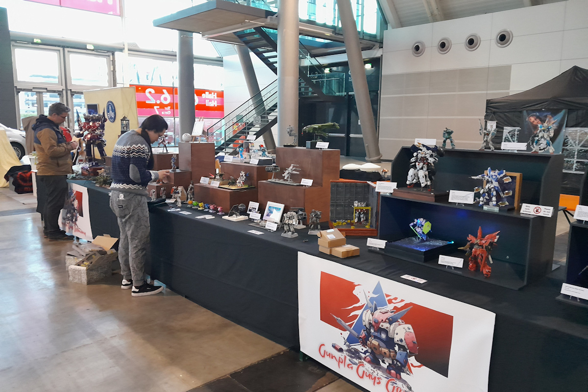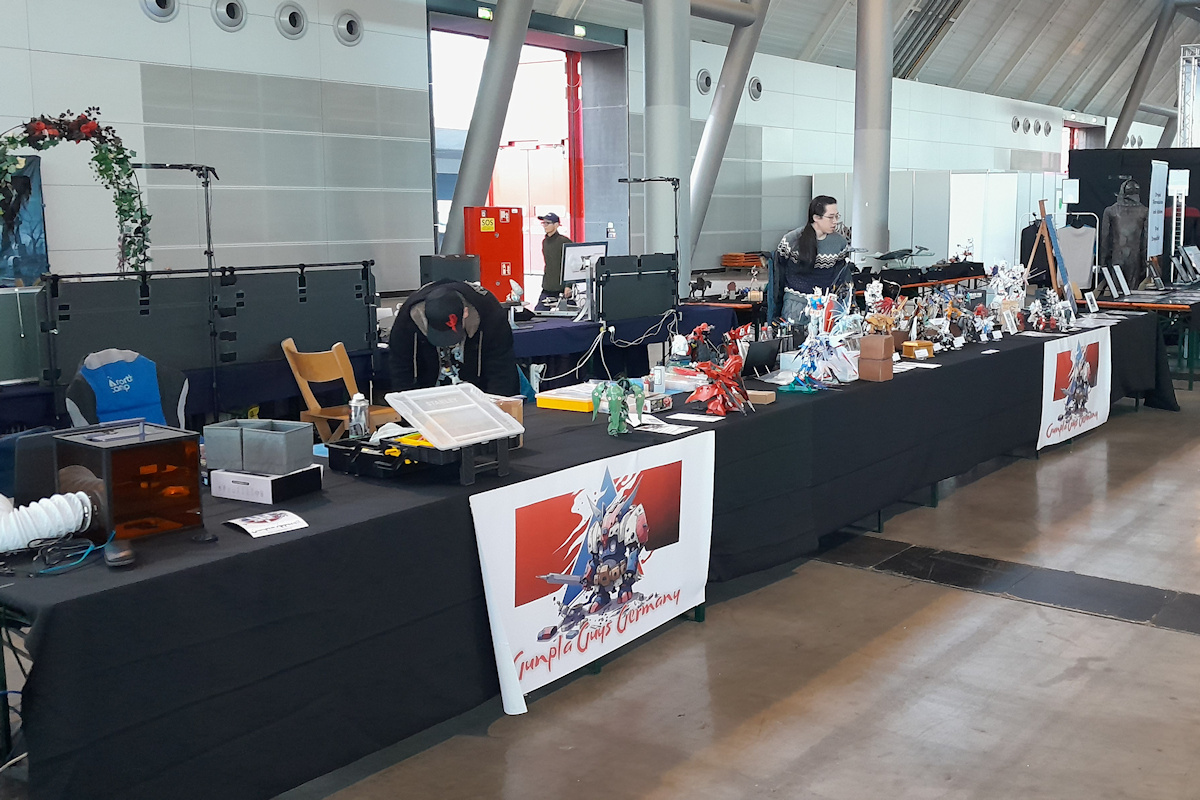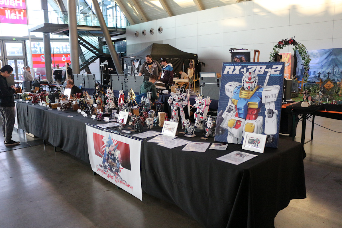 Hier seht ihr unseren Stand der Gunpla Guys Germany. Mit fast 20m Tischlänge haben wir unsere Ausstellungsfläche im Vergleich zum Vorjahr fast verdoppelt. Auf der rechten Hälfte gab es eine kleine Erklär-Ecke, gefolgt von OOB-Modellen…