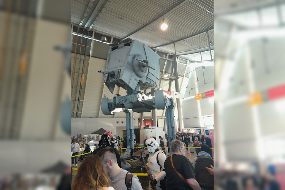 Wie letztes Jahr erstreckte sich die CCON wieder über drei Hallen. Laut Pressemitteilung kamen an beiden Tagen etwa 48.000 Besucher, was dem Vorjahresniveau entsprach. Wobei am Samstag die Hallen zeitweise schon übel voll waren und ein dichtes Gedränge in den Gängen herrschte. Das wurde auch von anderen Besuchern bemängelt. Trotzdem war die Atmosphäre entspannt. Ansonsten gab es wieder ein kunterbuntes Programm, Auftritte diverser Künstler, Cosplayer, Promis… die Galactic Cantina war wieder vertreten, diesmal mit einem AT-ST in Lebensgröße (letztes Jahr hatten sie einen TIE-Fighter in 1:1). Zeichner, die ihre Werke präsentierten, Comic- und Manga-Börse und natürlich jede Menge Merch-Stände... Am Samstag fand nach offiziellem Messe-Schluss wieder eine Party im Foyer statt. Da waren wir aber schon weg, einen ganzen Tag am Stand sein kann auch ziemlich anstrengend sein ;)