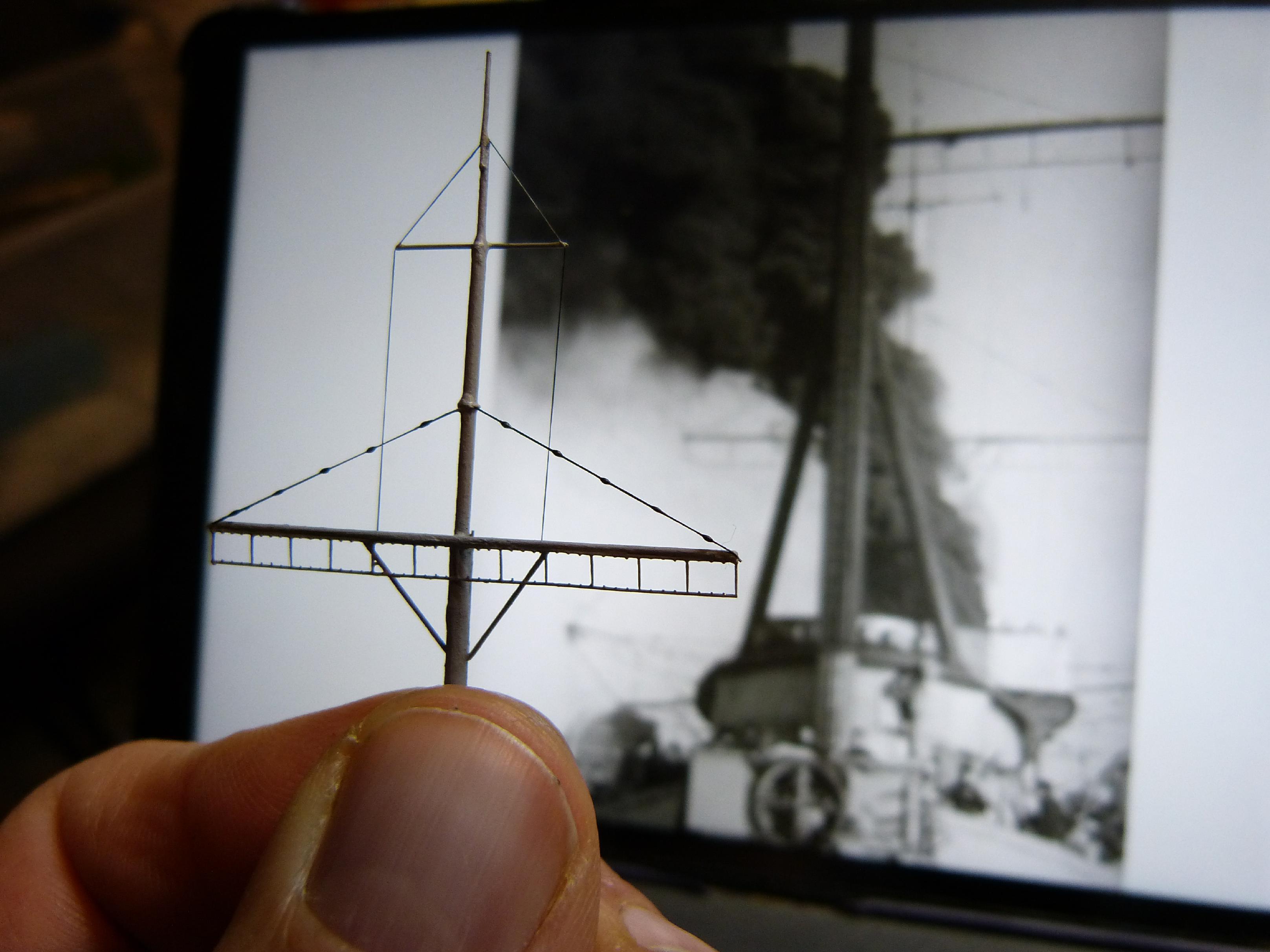 Zu sehen ist hier der vordere obere Mastteil im Vergleich zu einem Originalfoto. Entstanden sind die Mastteile aus Messingrohr, Kupferdraht und Ätzteilresten.