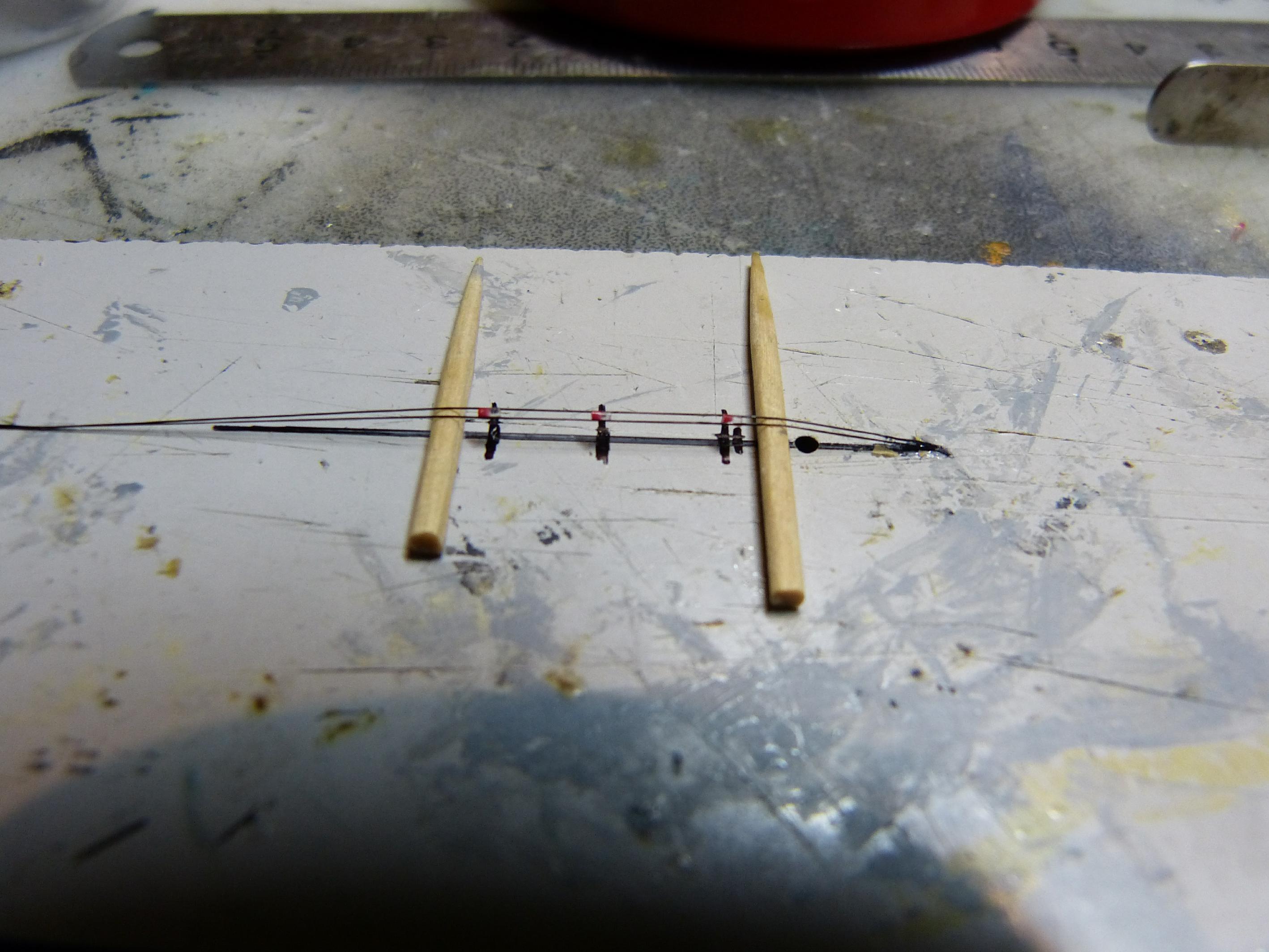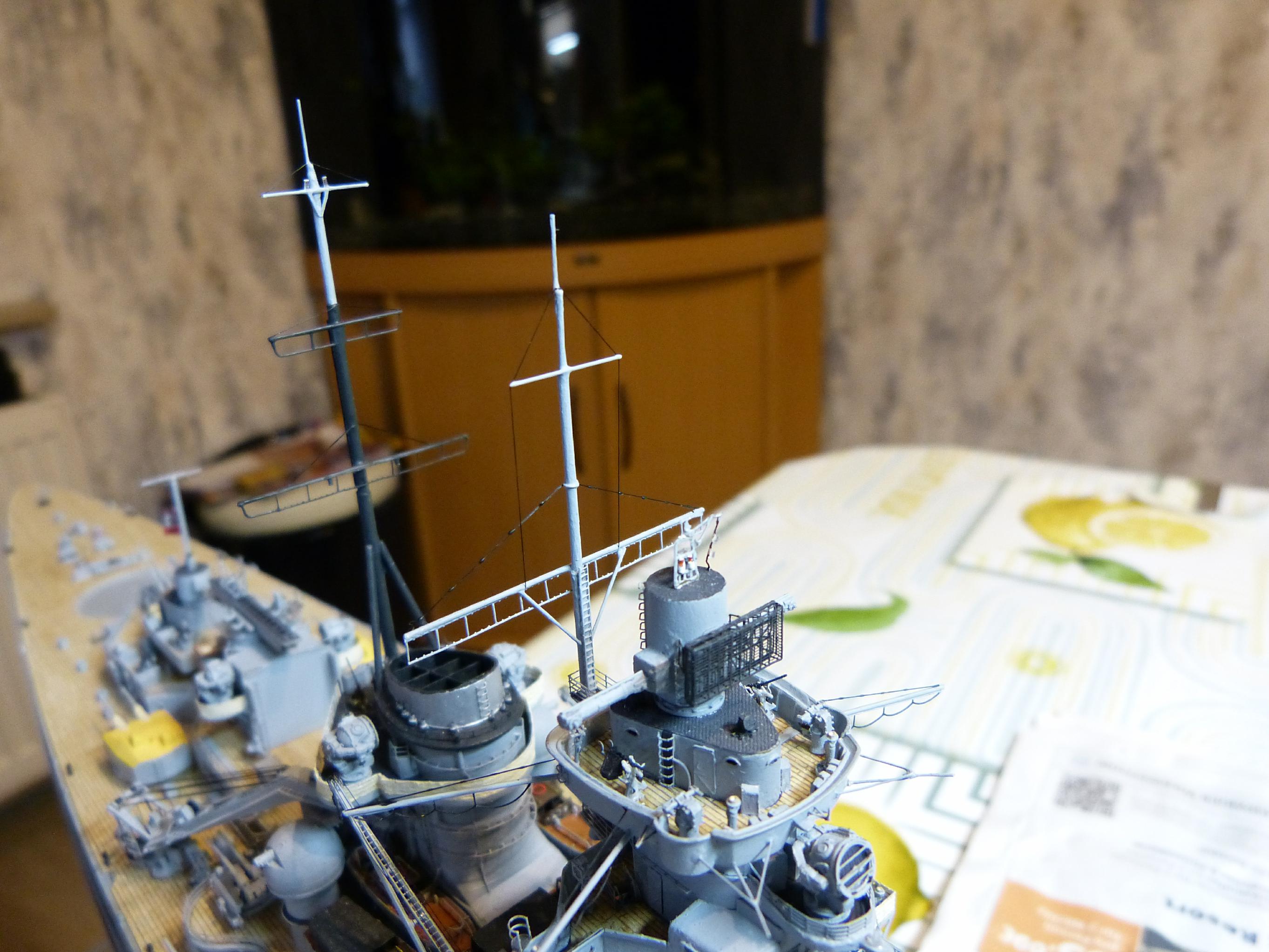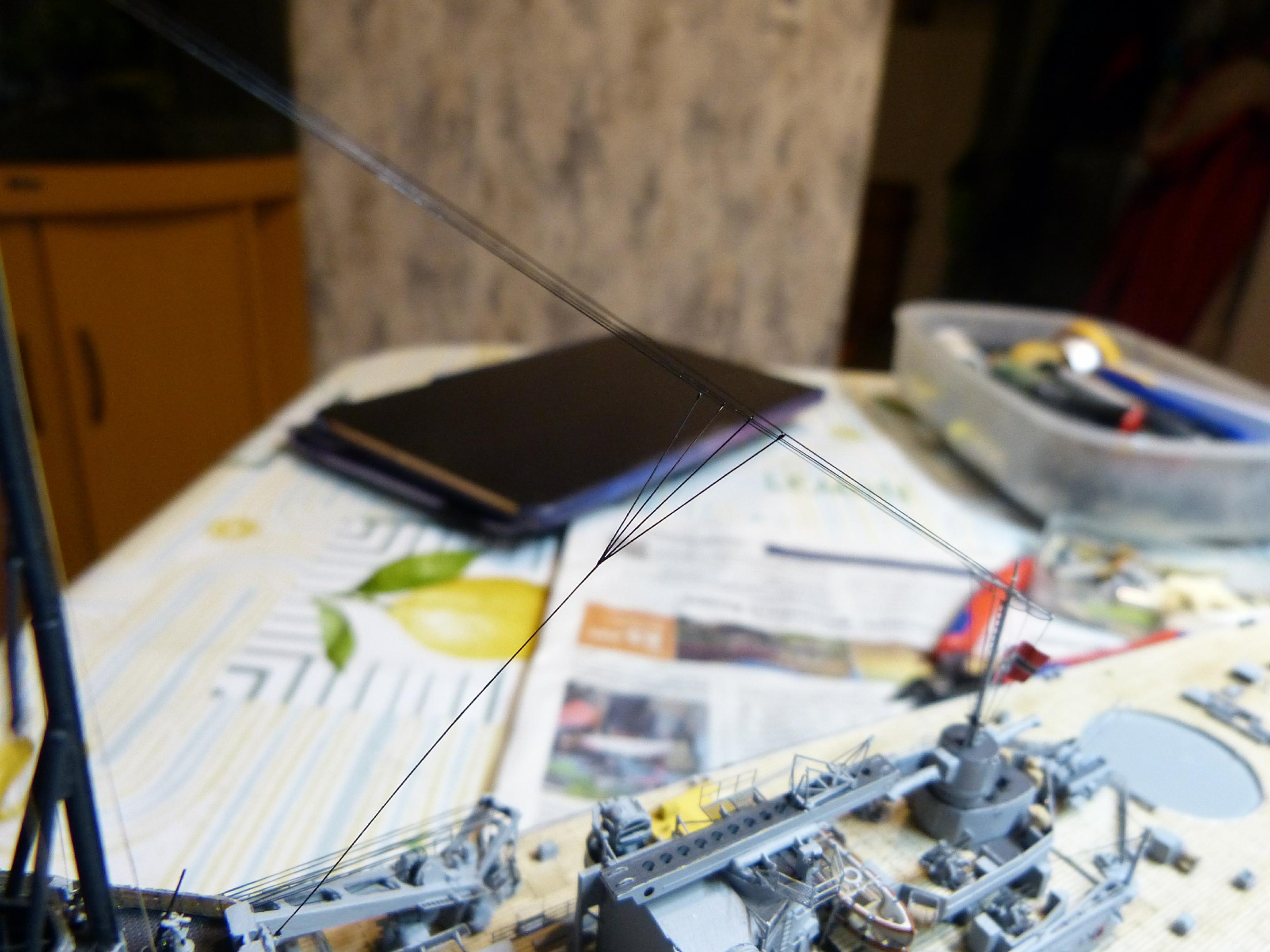 Das Rigging begann mit den bei DKM-Schiffen üblichen rot/weißen Nachtsignalleuchten. Diese befanden sich bei GU neben der Admiralsbrücke. Gefertigt aus einem dünngezogenen transparenten Gussast und Rigging black von Infini Model.