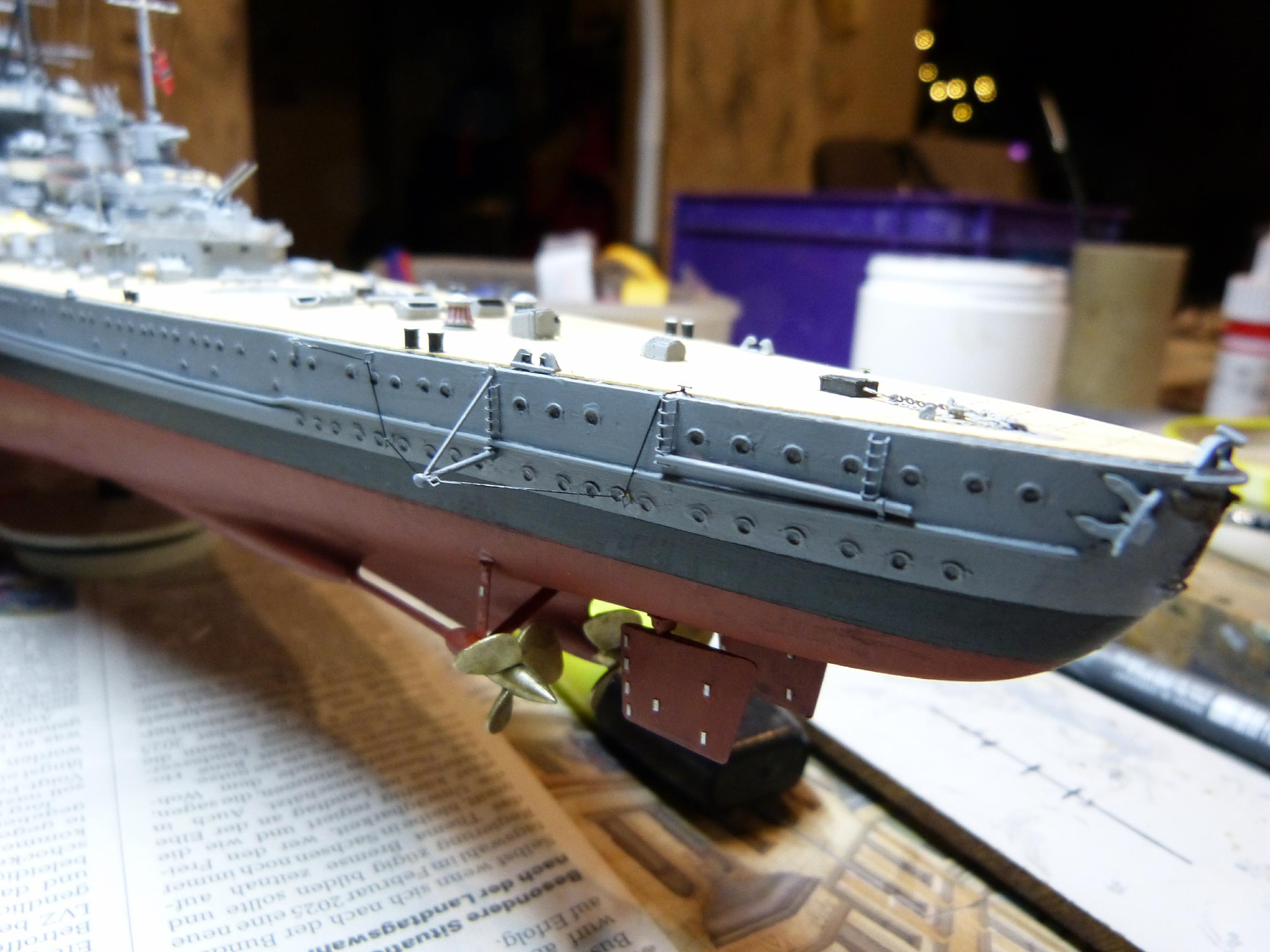 Bootsspieren vorn und hinten, Schraubenschutz und Vervollständigung der Teile um den Reichsadler am Heck. Letzteres zuerst. Hier fehlten noch die Sachen oberhalb und unterhalb (eine sinnvolle Bezeichnung fällt mir jetzt gerade nicht ein). Oft wird in der Literatur behauptet, die Heckadler wären auf DKM-Schiffen kurz nach Kriegsausbruch zusammen mit Namensschildern und Bugwappen entfernt worden. Tatsächlich gibt es aber ein historisches Video von Januar 40, da sind GU und SH im Eis in Kiel zu sehen und bei GU wird auch das Heck gezeigt – mit Reichsadler. Bei weiterer Recherche ergibt sich, dass die Adler meist im März 40 entfernt wurden.