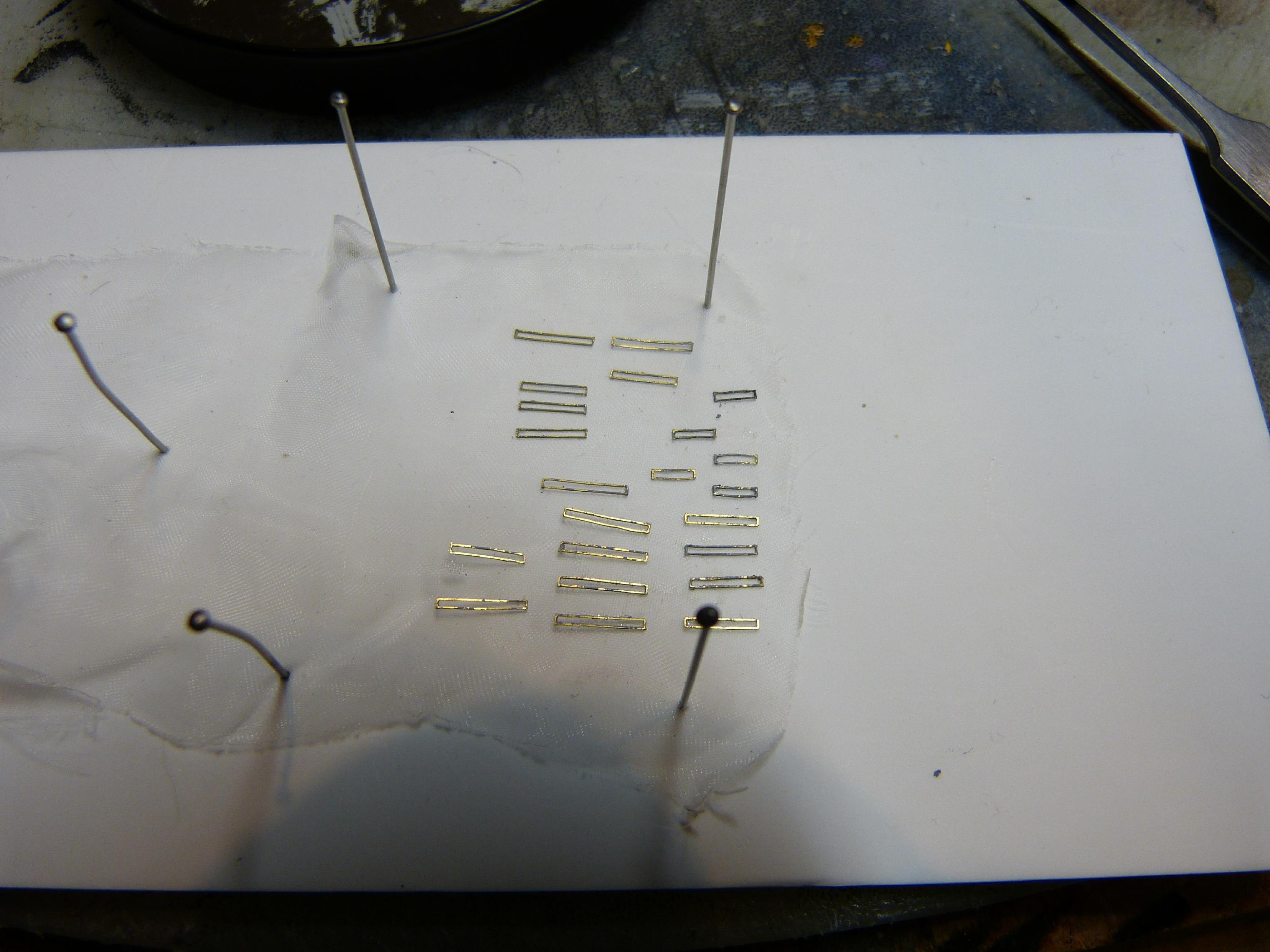Die Heckbootsspieren (oder auch Bootsausleger am Heck) sind auf historischen Fotos mal zu sehen und mal nicht. Auf dem besagten Video sind sie jedenfalls da – also habe ich sie mit dargestellt. Die vorderen Spieren schienen holzfarben zu sein, dies sieht man unter anderem auf einem anderen Farbvideo vom April 40, welches ich auch schon einige Male erwähnt habe. Solche Videos sind mehr wert als beide Kagero-Bücher zusammen…Die Spieren entstanden aus Kupferdraht, der Schraubenschutz sind gekürzte Stecknadeln. Die vorderen Spieren sieht man auf Foto 14.