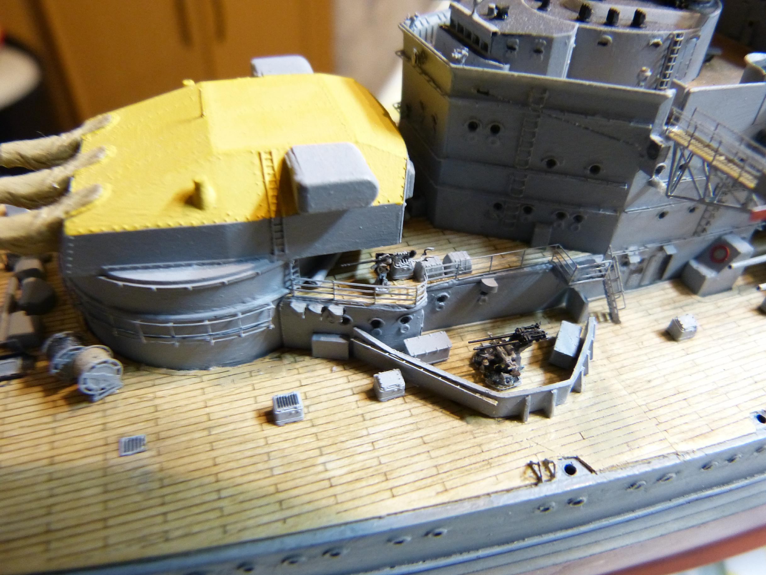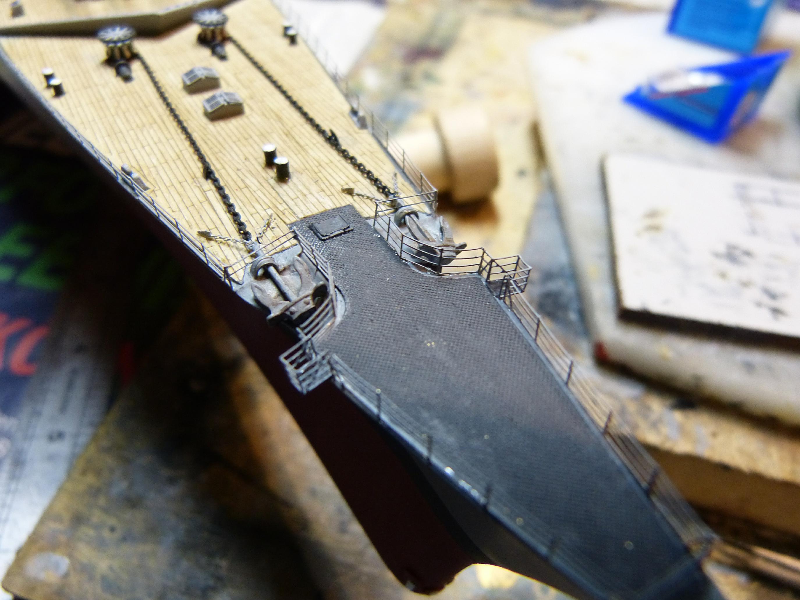 Wenn die schwere und mittlere Artillerie geschossen hat, wurden die leeren Kartuschen aus dem jeweiligen Turm entfernt, und zwar auf das Hauptdeck. Dort konnten sie leicht in die See rollen, zumal meist die Reling in dem Bereich umgelegt wurde. Die Kartuschen waren aber relativ wertvoll und konnten höchstwahrscheinlich später wiederverwendet werden. Daher musste der Verlust an die See verhindert werden. Zu diesem Zweck gab es spezielle Abweiser oder Fänger die im Bereich der Geschütztürme installiert waren. Wo diese genau platziert waren, ist auf den Originalplänen ersichtlich. Ich habe sie auch auf allen meinen Schlachtschiffen mit dargestellt. Bei TP waren sie mit in den Ätzteilen der Reling integriert, was eigentlich nicht korrekt ist, denn sie hatten einen gewissen Abstand zu dieser. Für die GU entstanden die Abweiser hier aus Reling-Ätzteilen und feinster Gaze (Teebeutel), anschließend in RAL7001 bemalt.