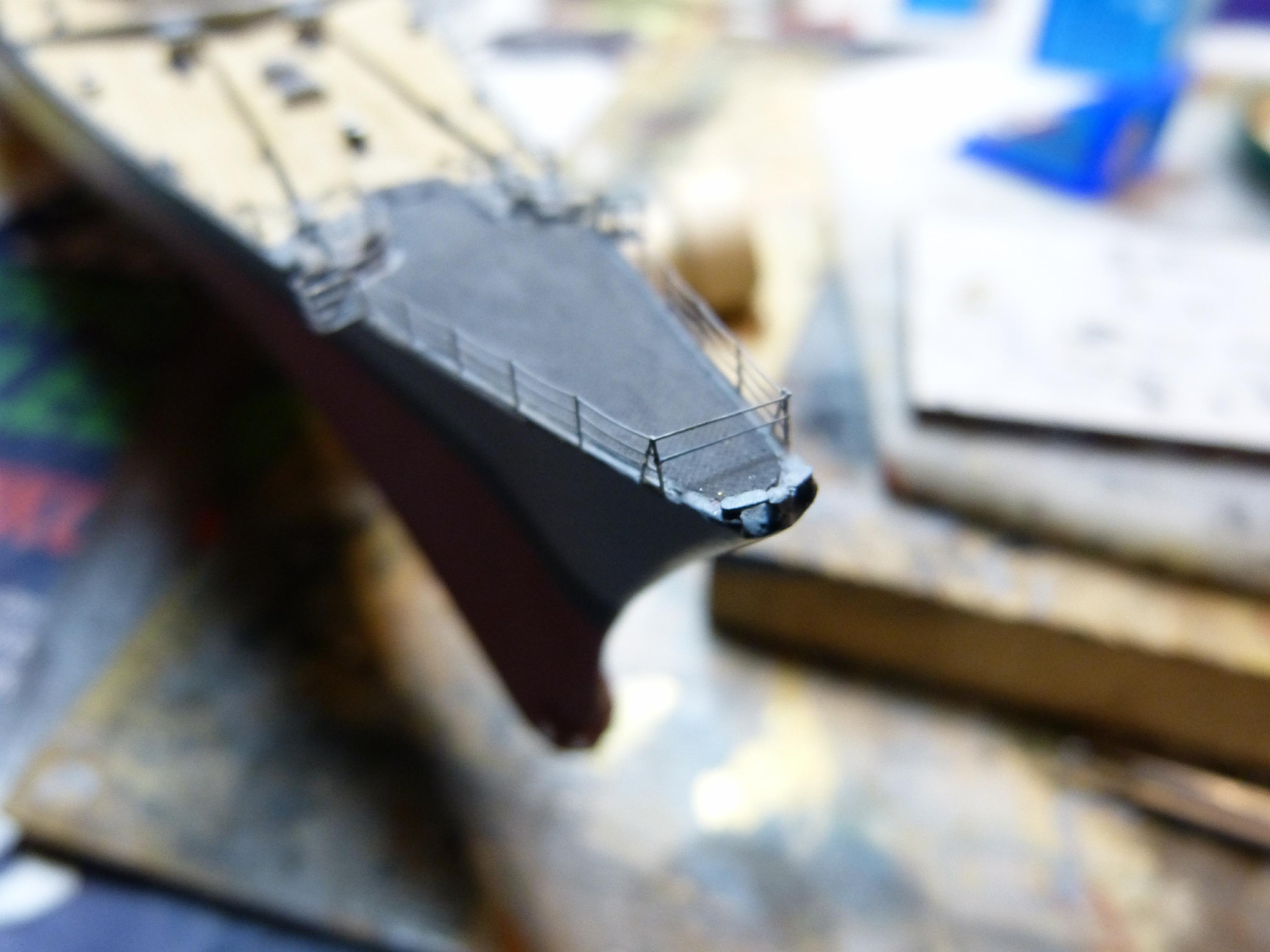 Jetzt war die Hauptreling an der Reihe. Diese entstand im Wesentlichen aus dem Ätzteil-Set von KA-Models. Am besten ist sie dann in der Galerie zu sehen, hier nur ein paar Fotos vom Bugbereich, wie ich die Querverbindungen mit Infini-Rigging 0,135mm gemacht habe.