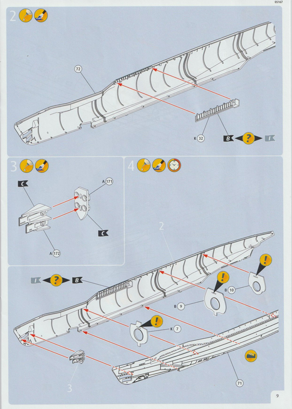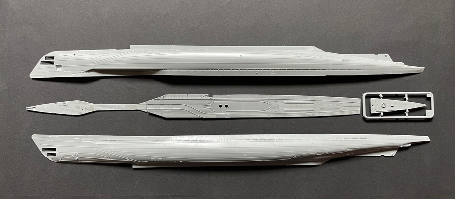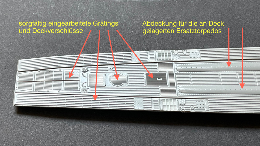 Hat man die beiden Rumpfhälften inkl. Torpedo Ausstoßöffnung und Schacht für den Schnorchel mit den drei stabilisierenden Querspanten und den Decksteilen zusammengesetzt, kommt die charakteristische Form des Typs IX schon klar zum Vorschein. Im Vergleich zur kurvigen Form, verursacht durch die aussenliegenden Satteltanks beim Typ VII, zeigt der grössere Typ IX eine gerade Rumpflinienführung, mit waagrecht angeordneten Flutschlitzen über die gesamte Länge.