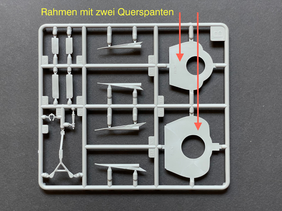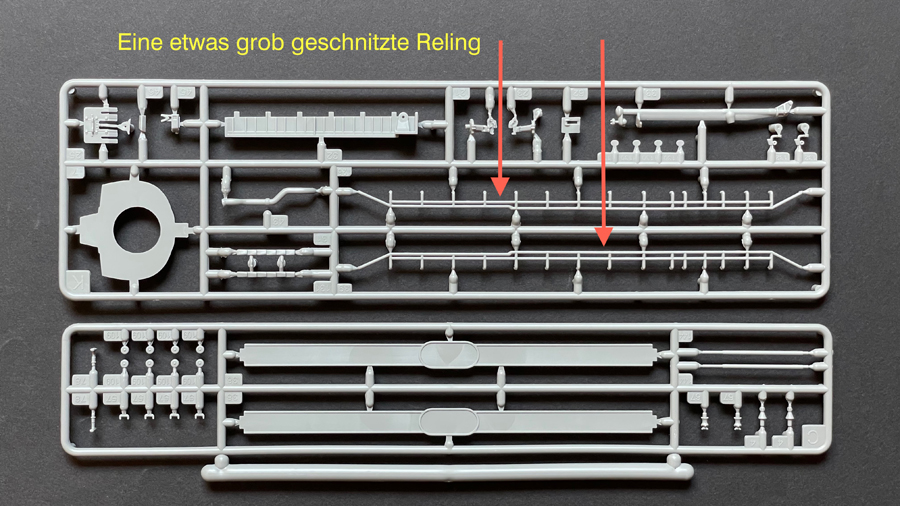 Grundsätzlich wird das Original in jeder Hinsicht sehr akkurat wiedergegeben. Der Kunststoffguss ist kantenscharf, die Teile sollten genau passen, Spachtel wird kaum nötig sein. Da und dort gibt es überstehende Gussreste. Selbstredend gehört es zu den Grundanforderungen beim Plastikmodellbau, alle Teile akribisch zu kontrollieren und zu versäubern bzw. Gusskanten mit den entsprechenden Werkzeugen sorgfältig wegzuschaben oder abzuschleifen.