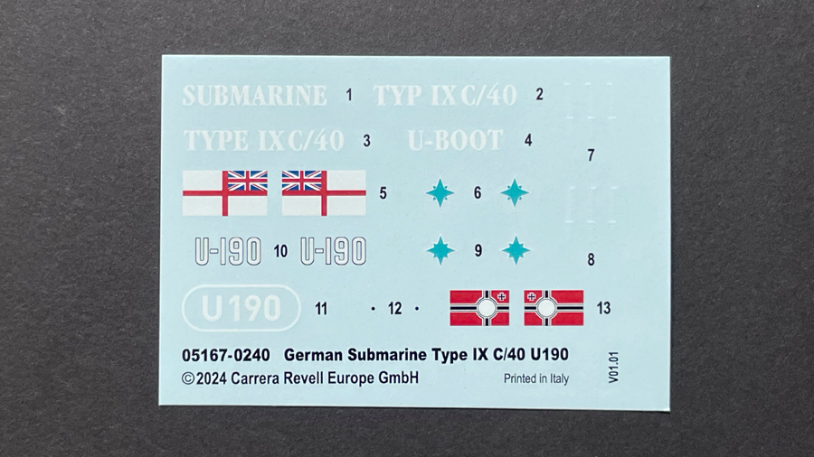 Leider beschränkt sich Revell beim exakt gedruckten Decalbogen nur gerade auf die Dekoration von U 190. Will man ein anderes Vorbild darstellen, muss auf den Zubehörmarkt ausgewichen werden.