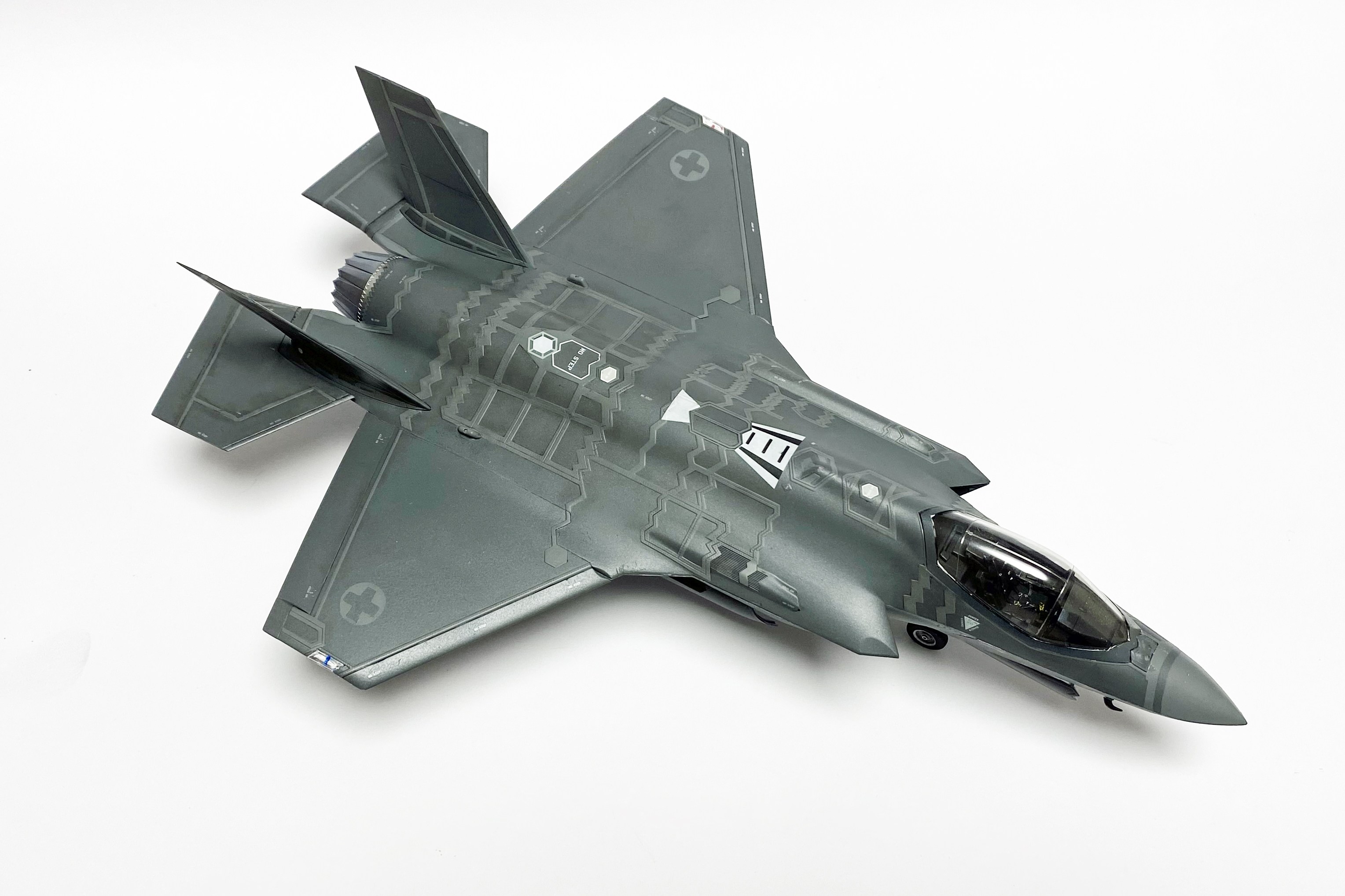 Ich wollte einmal ganz vorne sein und habe mich entschieden, die F-35 bereits als Schweizer Version zu bauen. Die Immatrikulation, das Staffelzeichen der Falcons sowie die Schweizer Hoheitszeichen sind rein spekulativ. Einzig bei der Immatrikulation könnte ich richtig liegen, denn die F/A 18 hatten die Nummern J-50xx (Version C) und J-52xx (Version D). Also liegt es auf der Hand, dass die F-35 die Nummern J-6001-J-6036 erhalten werden. Die Bewaffnung mit Bomben ist als What If zu betrachten. Bis jetzt ist mir nicht bekannt, ob die Schweizer Luftwaffe Bomben beschaffen wird.