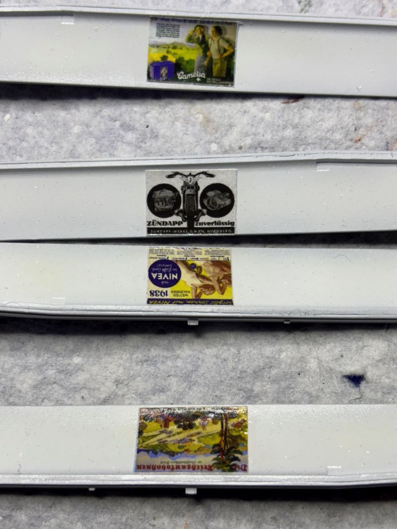 Lediglich die Werbeschilder aus Papier wurden mit glänzendem Mod Podge aufgeklebt und danach mit dem gleichen Kleber überzogen. Der trocknet glasklar glänzend aus.