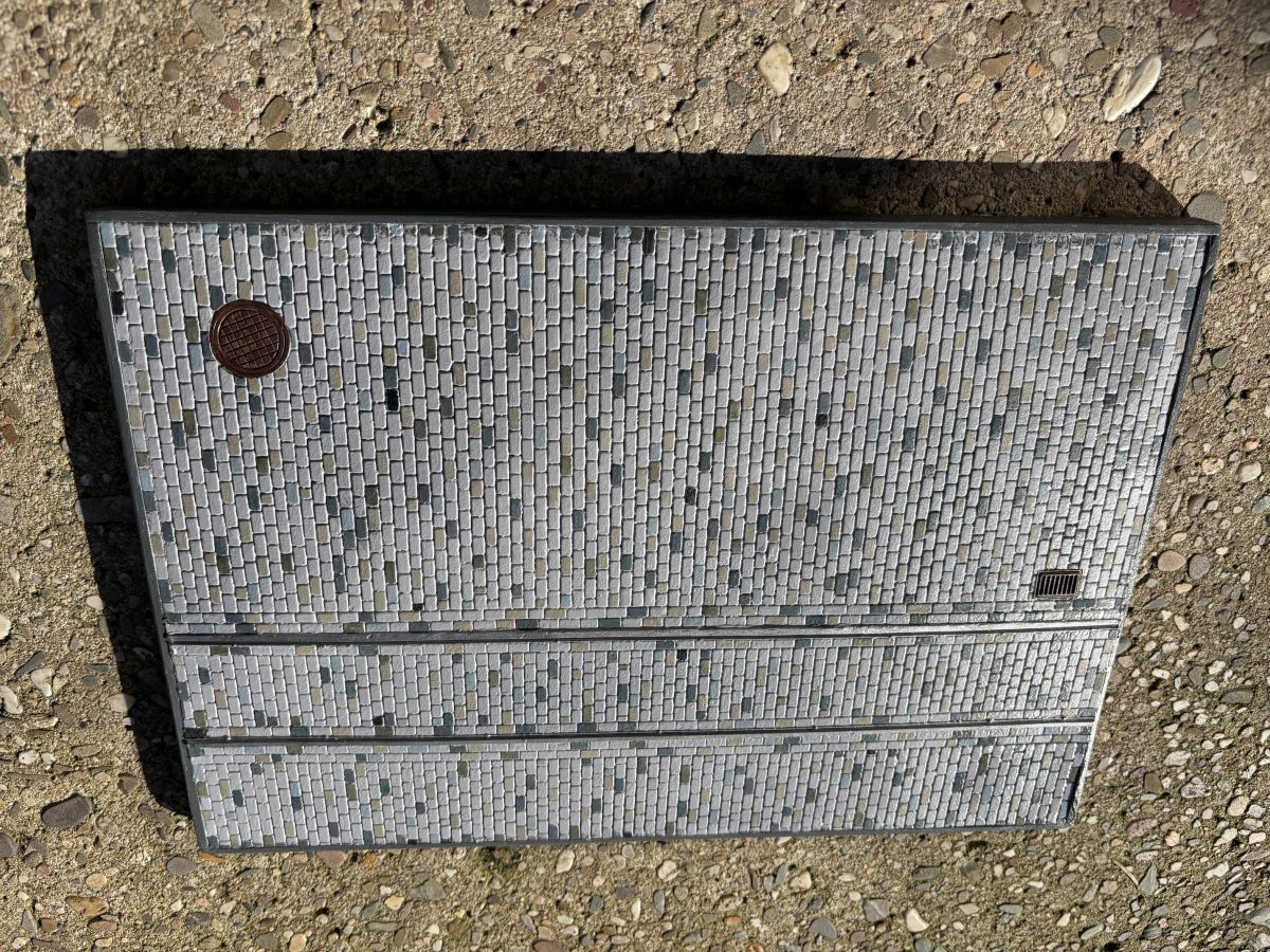 Schließlich wurde grau aus der Dose grundiert und einzelne Steine mit 5 verschiedenen Grautönen behandelt. Die Schienen erhielten erstmal silbergrau und die Gullys eine Mischung aus Metalfarbe und Rost.