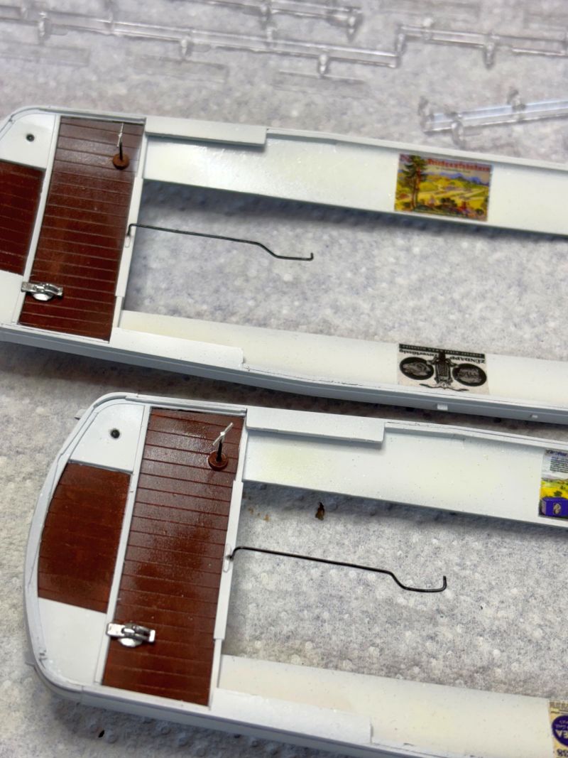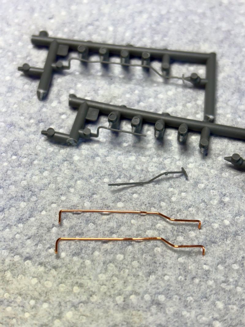 Daher habe ich sie aus Kupferdraht nachgebogen und über ein Loch mit dem Dach verklebt. Nach Metall-Primer wurden sie noch schwarz gepinselt.
