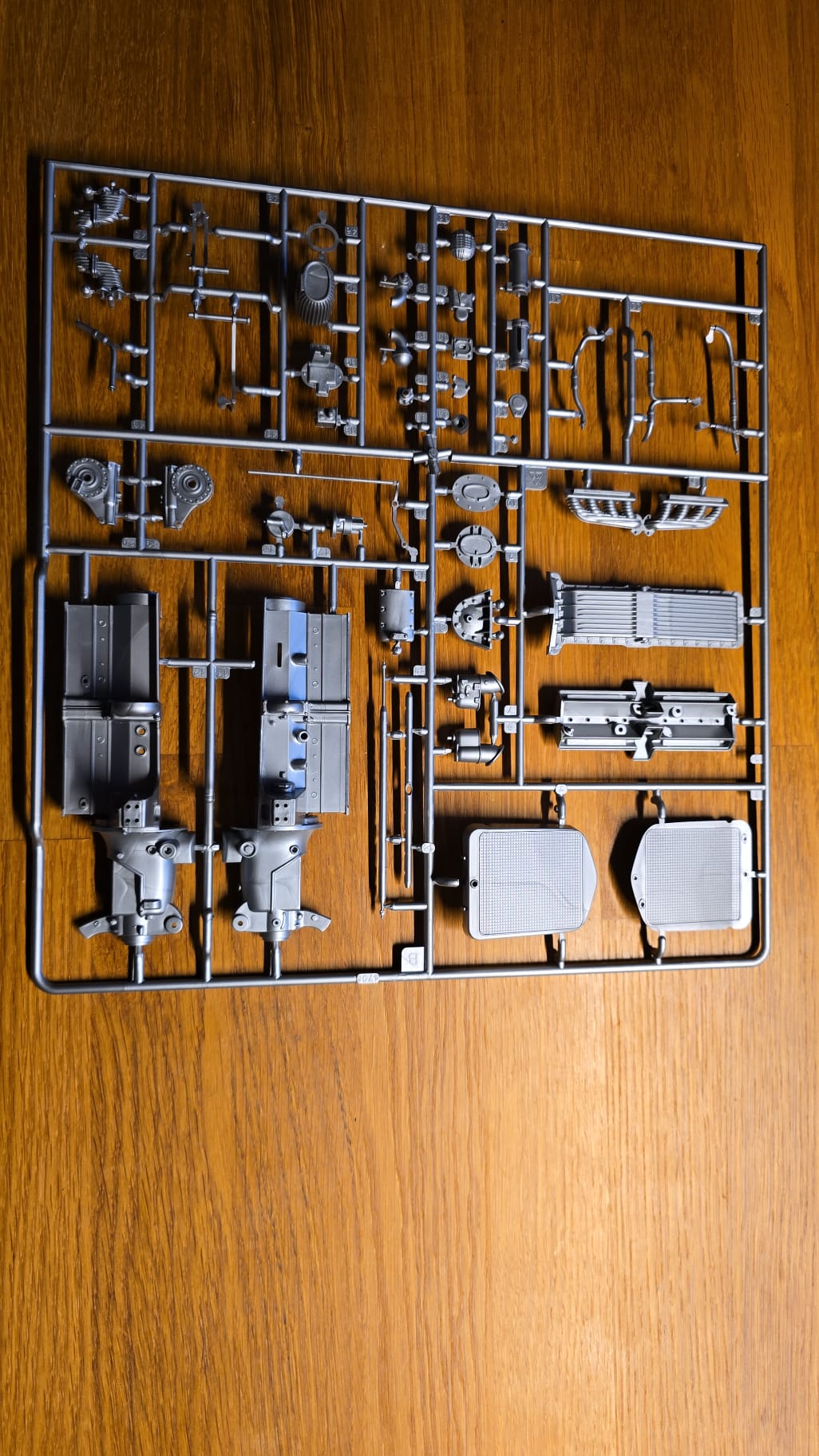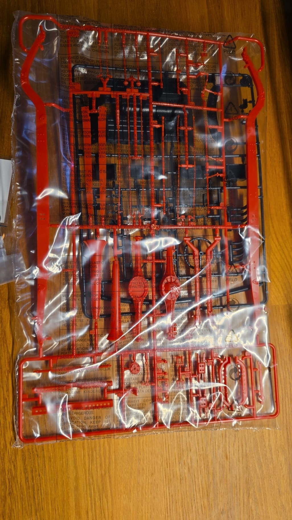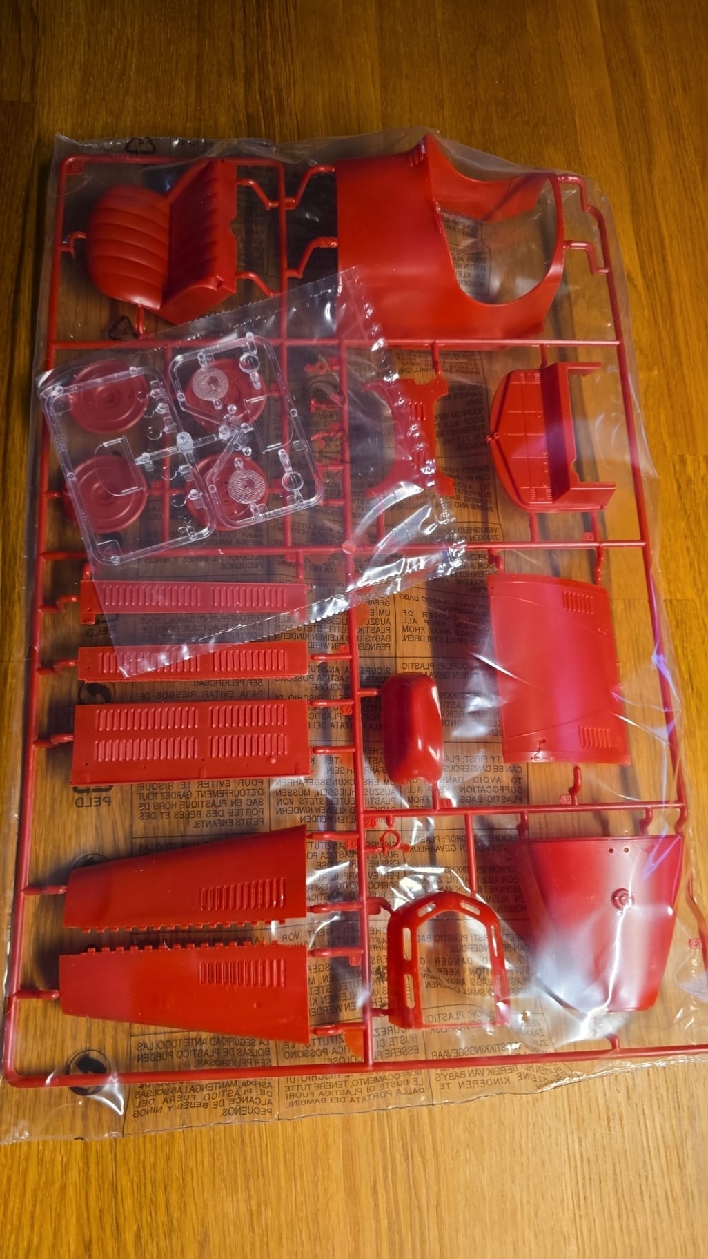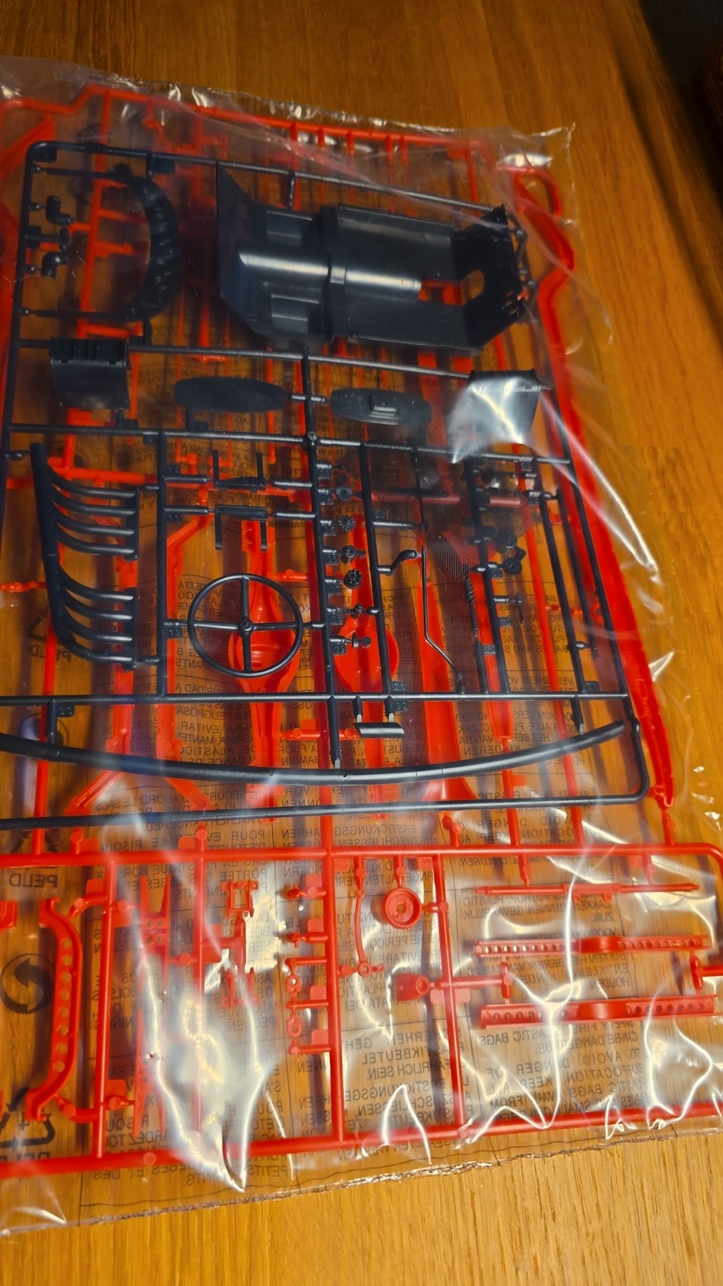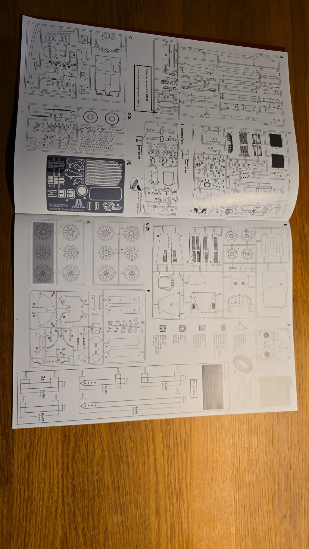 Der Karton ist groß und gut gefüllt. 3teilige Felgen, PE Teile, Kabeln und Schrauben. Die Spritzlinge sind in rot, schwarz, grau und Chrom gefärbt. Die Qualität ist gut, sauber gegossen. Auf den ersten Blick scheint es ein toller Bastelspass zu werden.