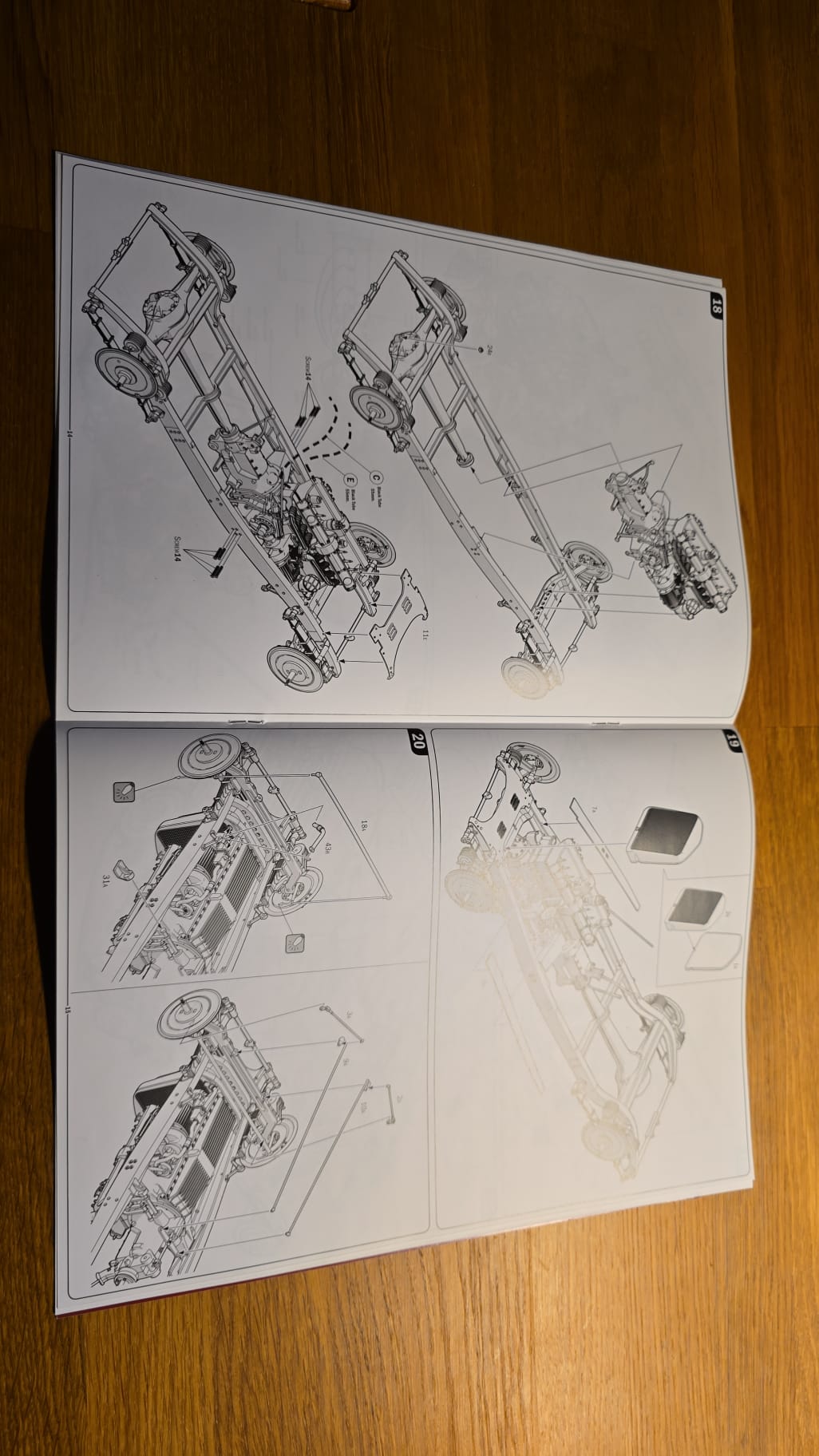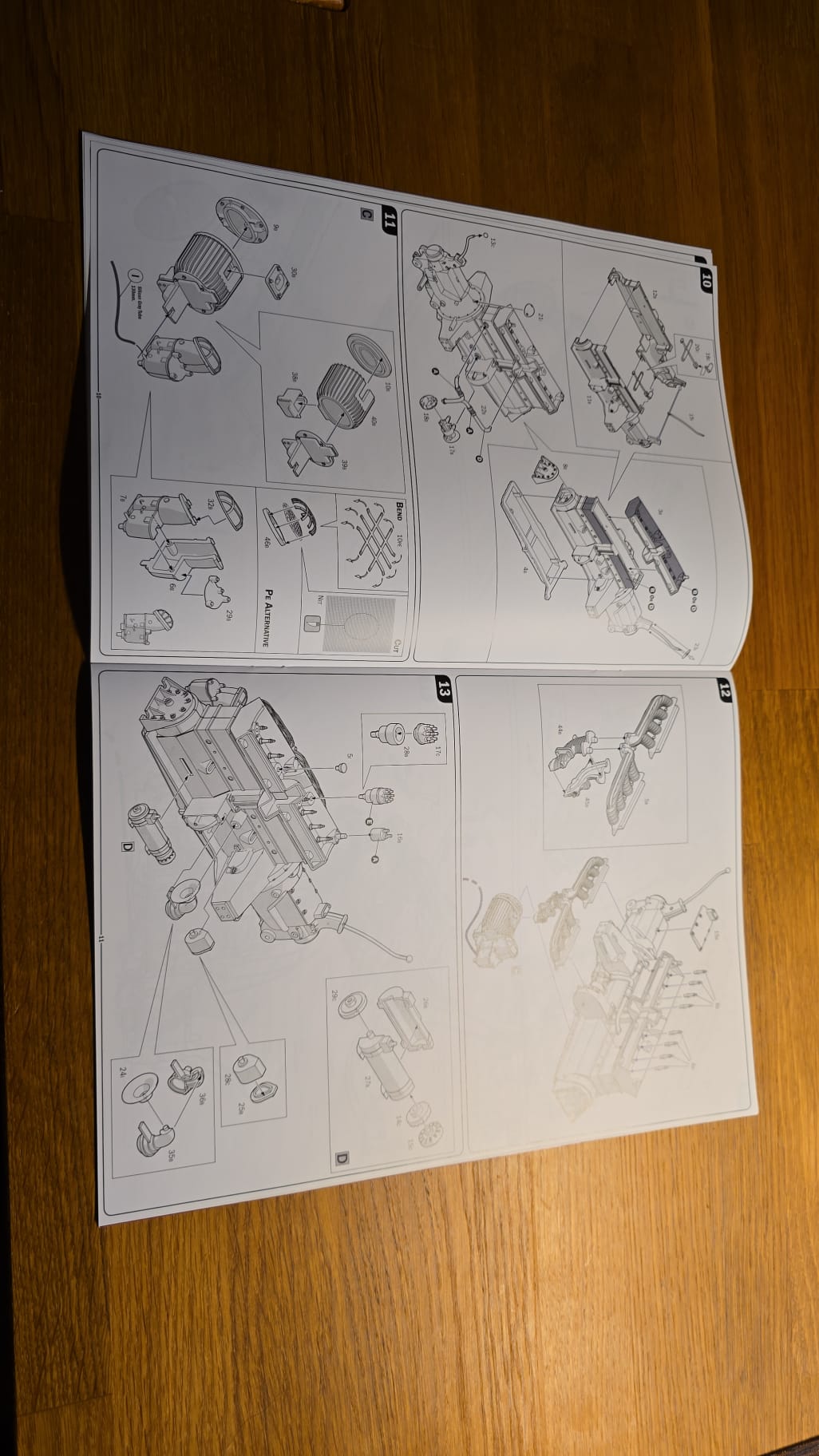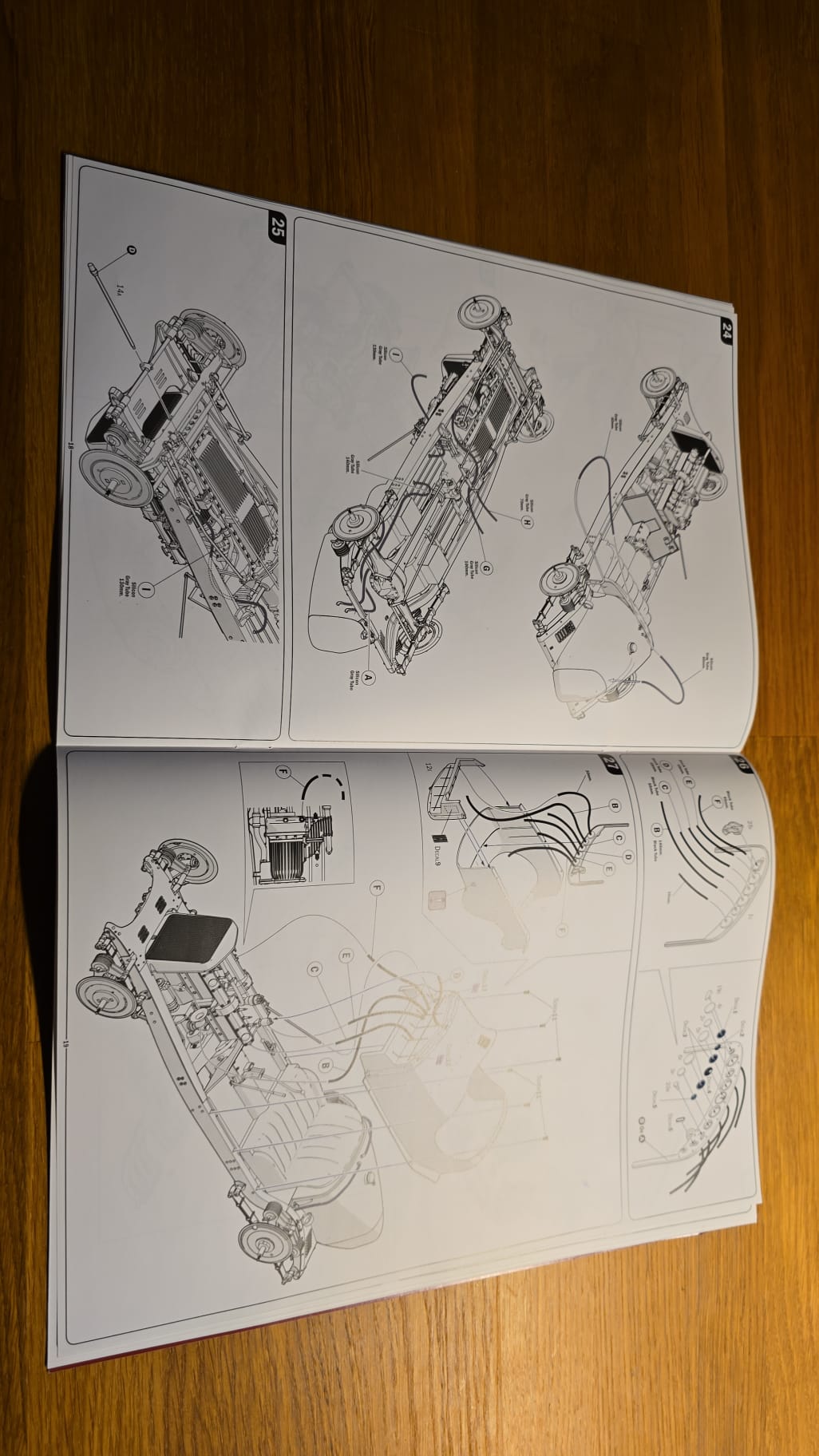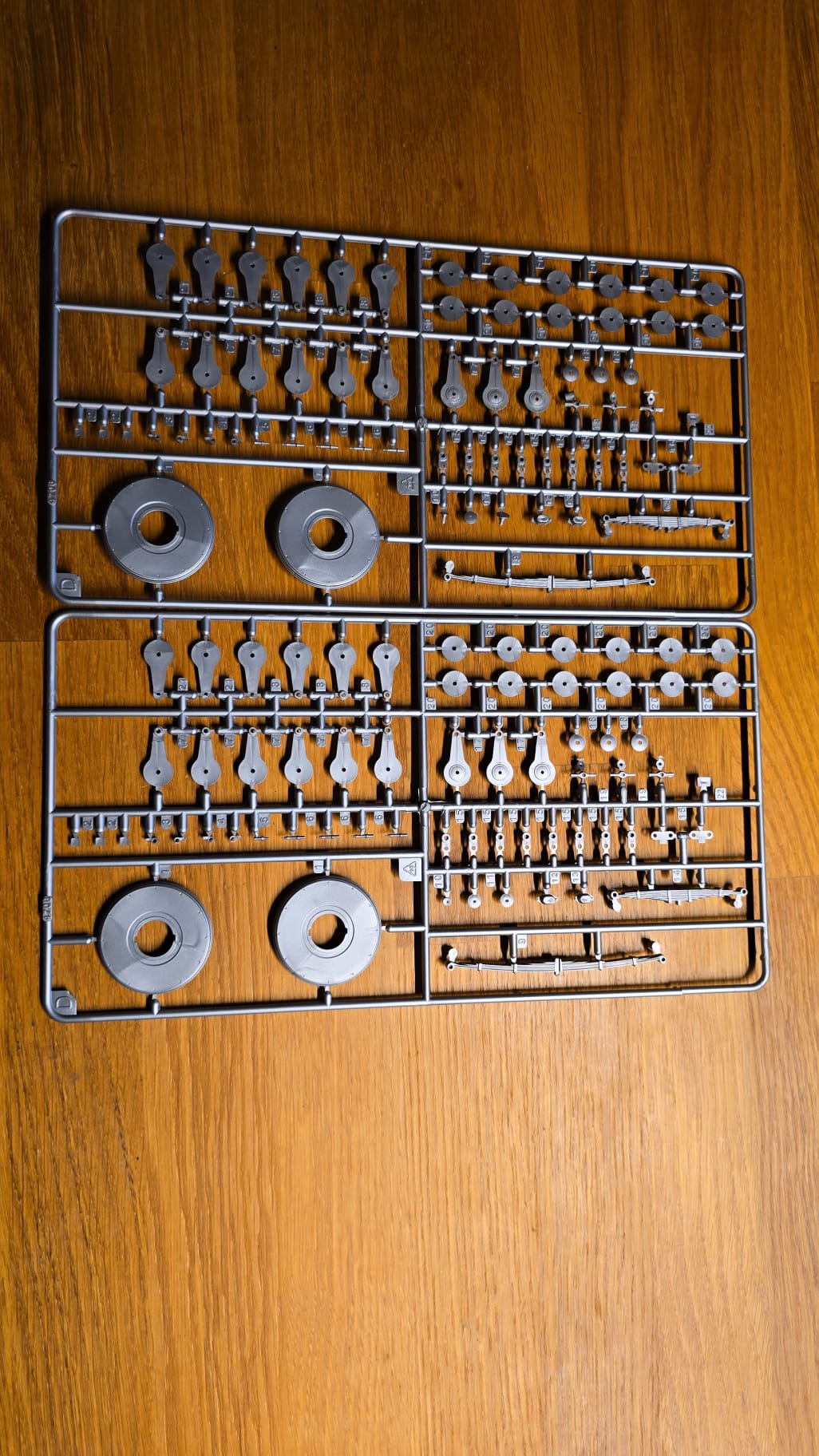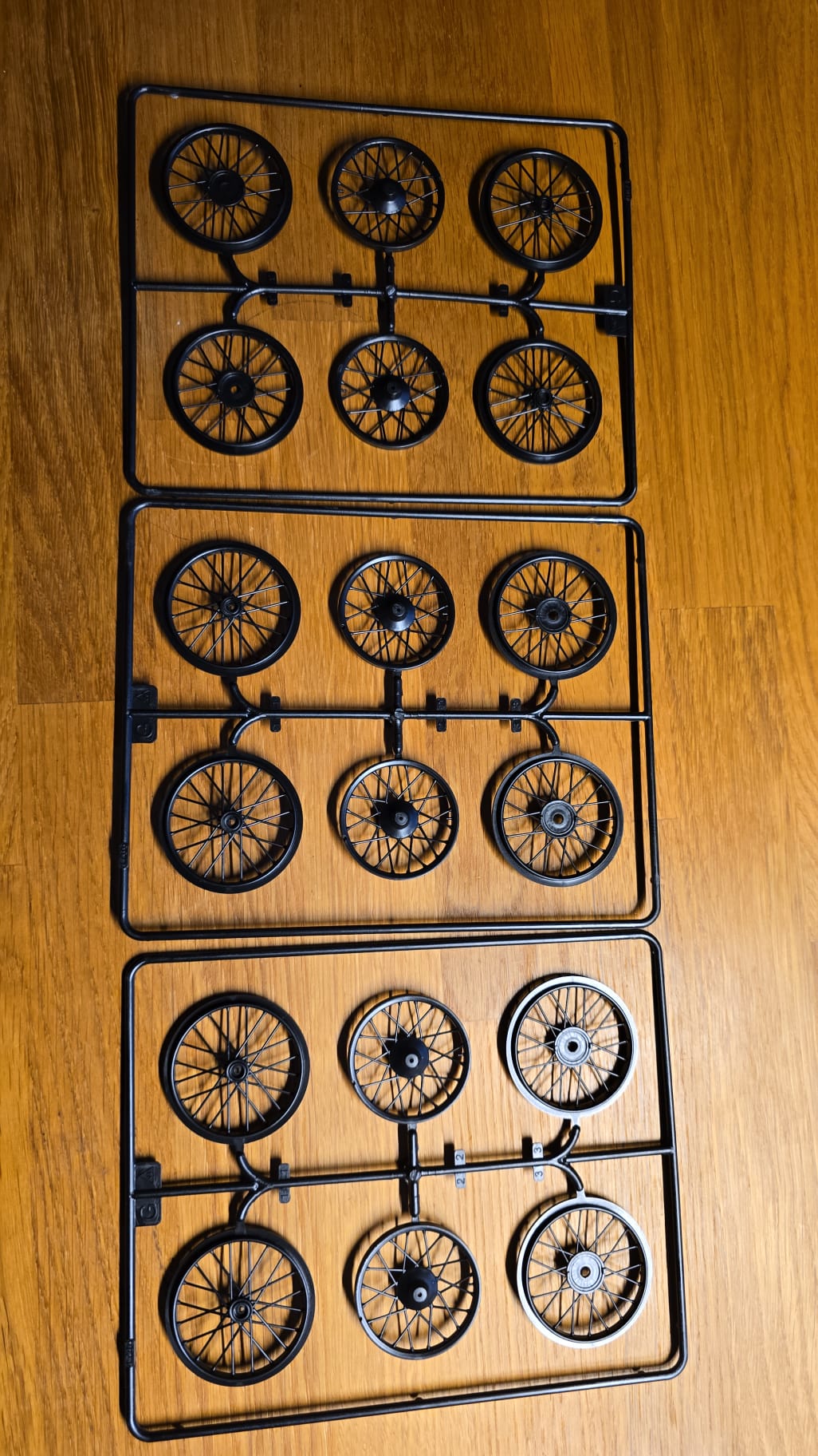 Der Karton ist groß und gut gefüllt. 3teilige Felgen, PE Teile, Kabeln und Schrauben. Die Spritzlinge sind in rot, schwarz, grau und Chrom gefärbt. Die Qualität ist gut, sauber gegossen. Auf den ersten Blick scheint es ein toller Bastelspass zu werden.
