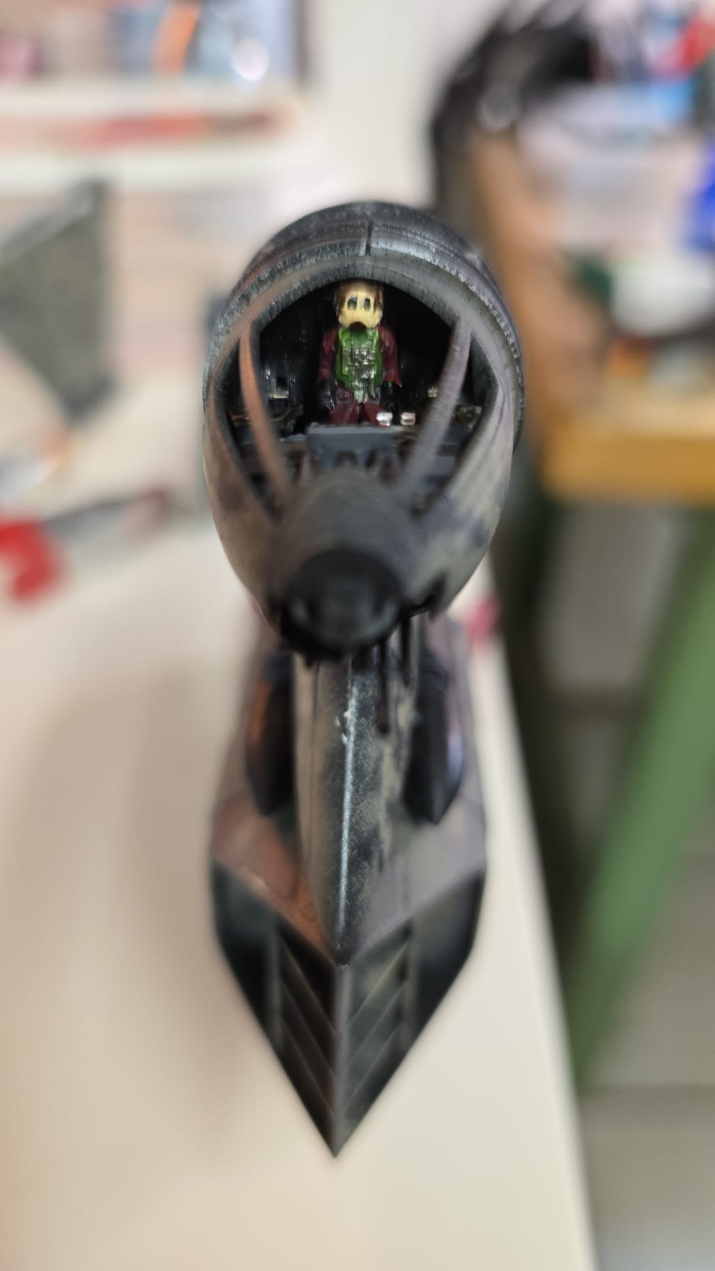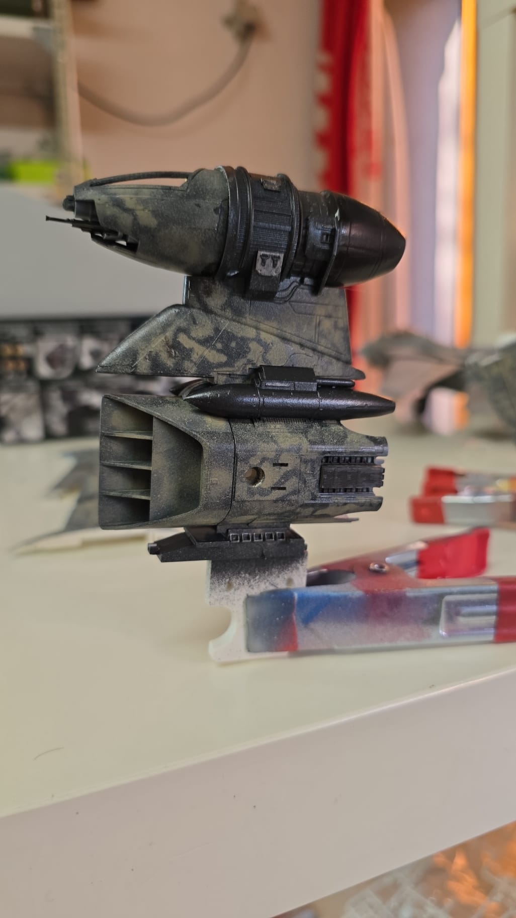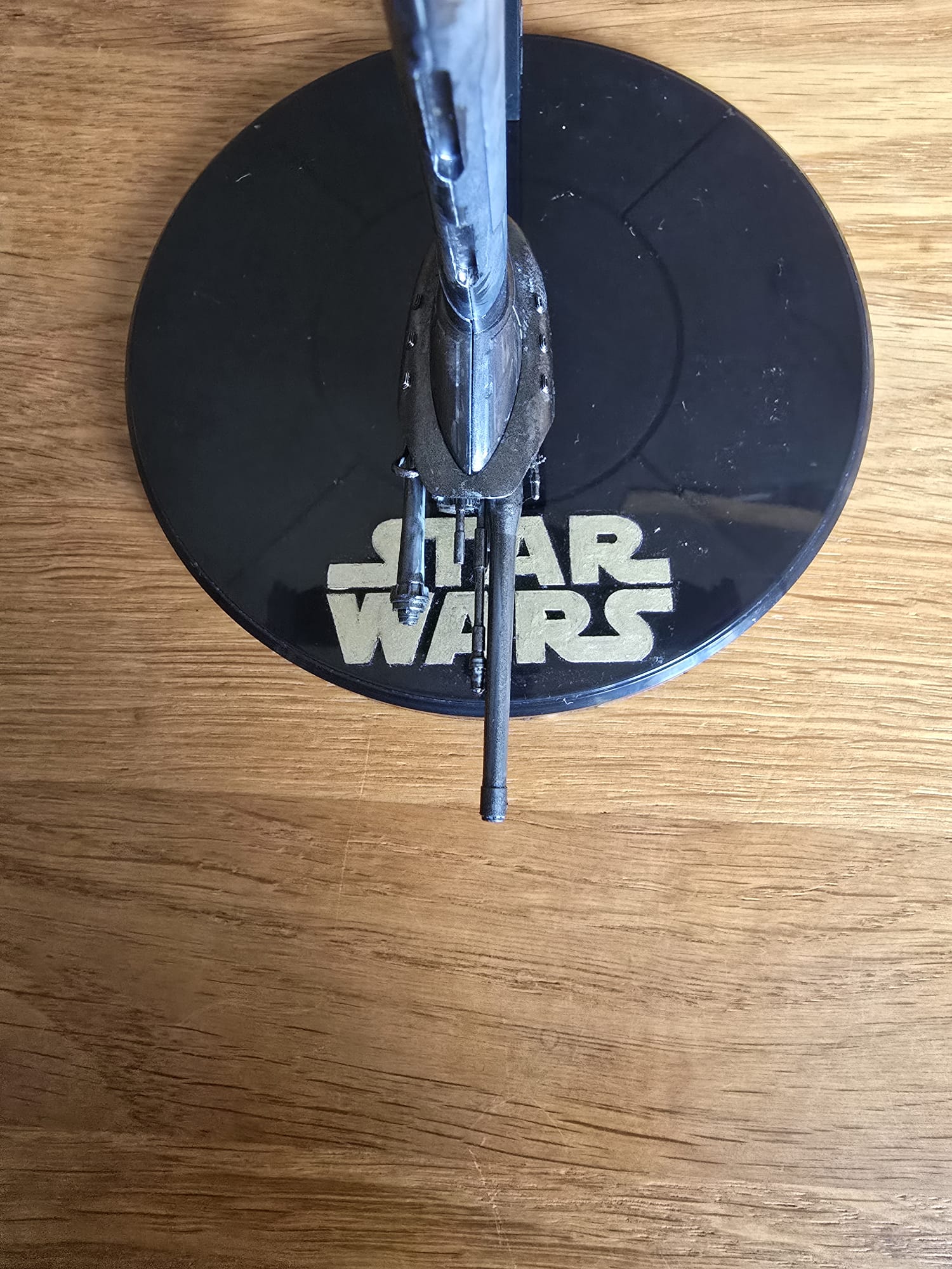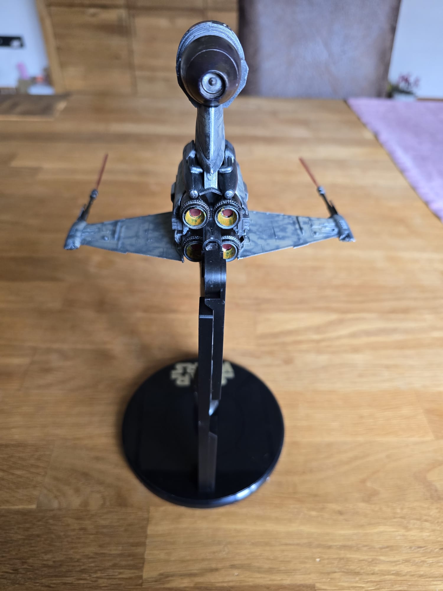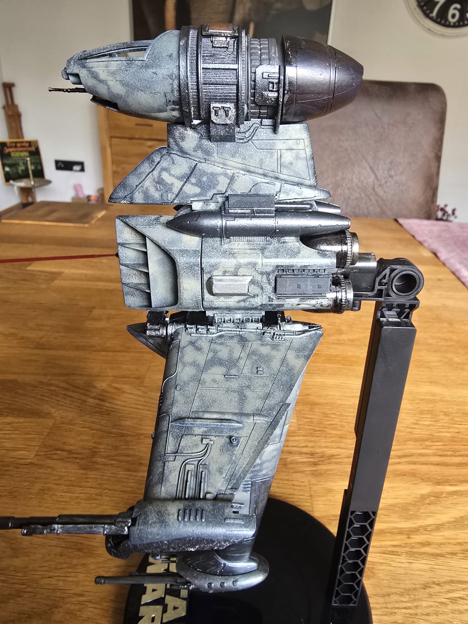 Der BWing Fighter ist fertig. Der Ständer war in klarem Kunststoff und ich habe ihn von hinten in schwarz lackiert und den Starwars Schriftzug habe ich mit dem Pinsel gemalt. Flächen wurden mit Airbrush und die die akleinteile mit dem Pinsel gemacht.