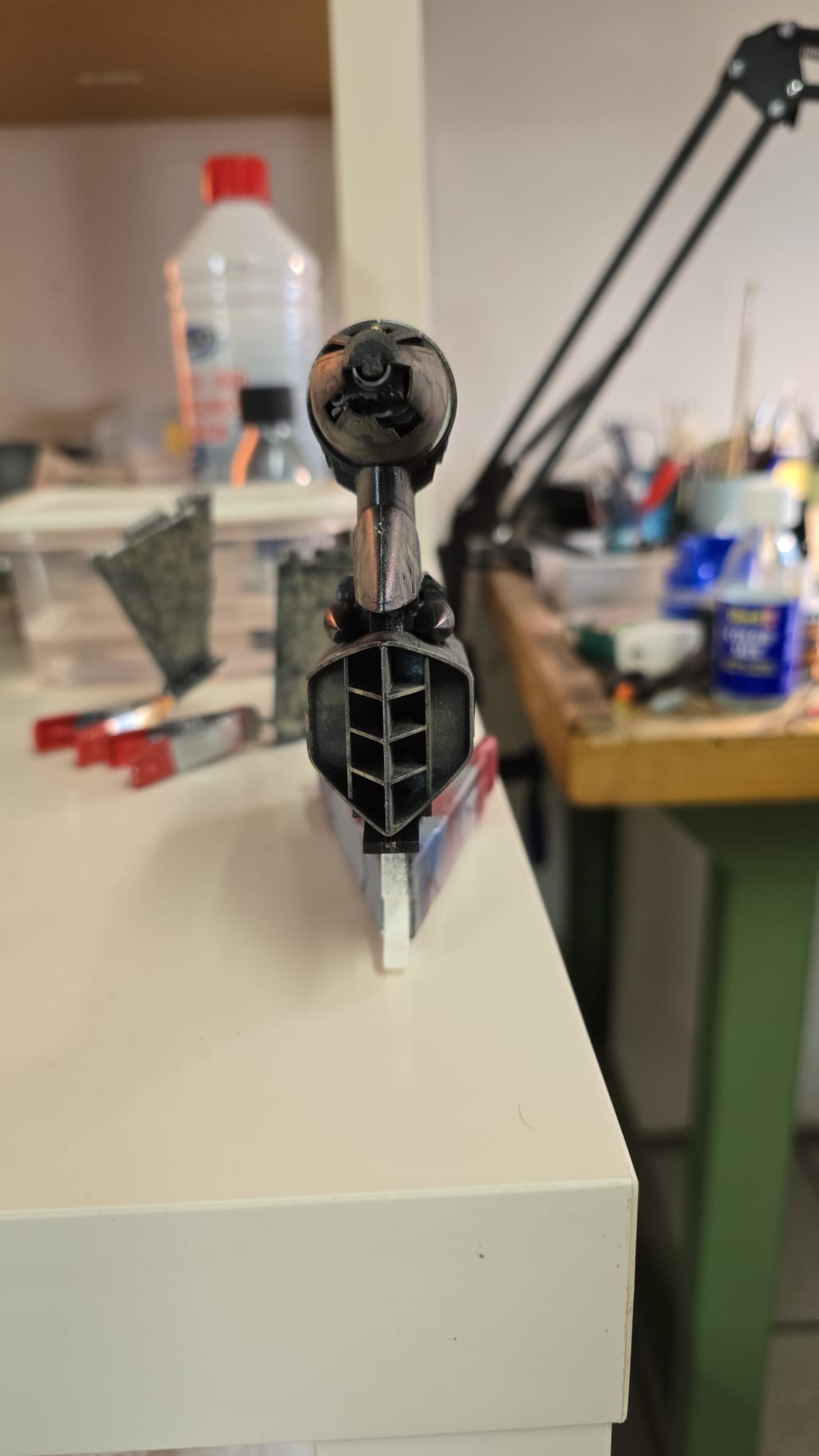 Mit der Airbrush lackieren hat er auch seine ersten Versuche erfolgreich hinter sich gebracht. Nein, nicht am Modell. Ich habe ihn nach getaner Arbeit an einem Opfer und Plastiklöffel üben lassen. Aber er hat schon das Händchen dafür. Wenn er weiter Interesse daran hat, fördere ich das natürlich umso mehr.