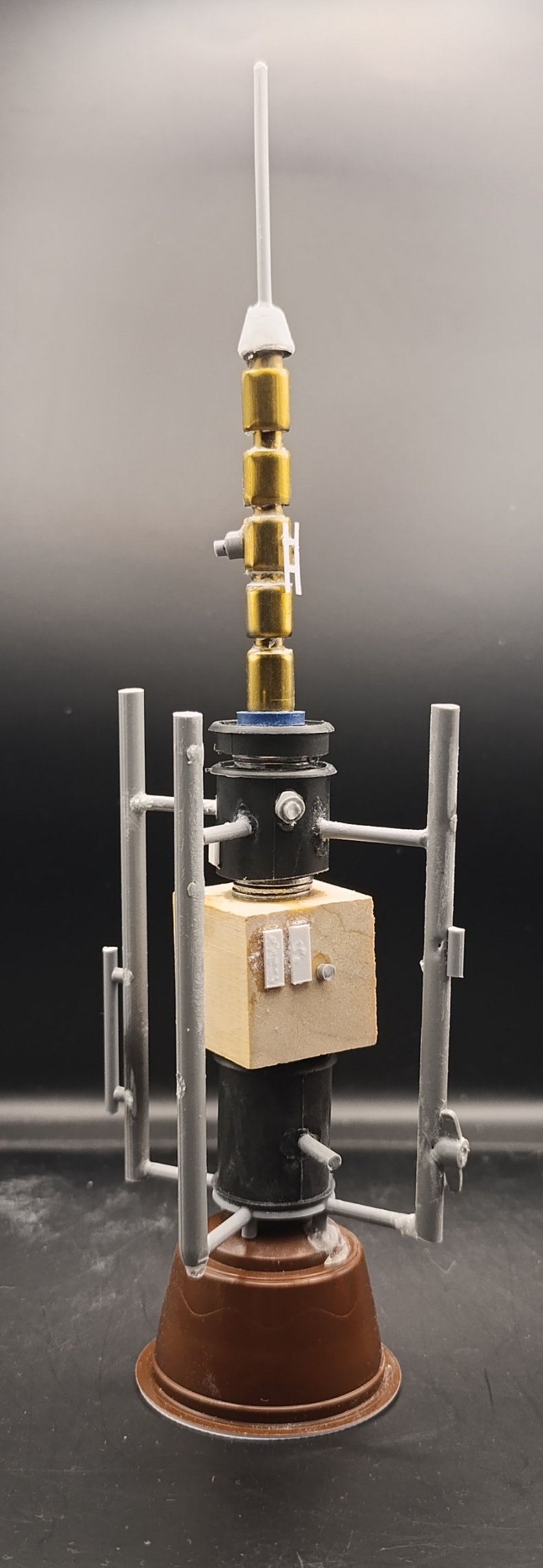 Auch der Moisture Vaporator, wenn man ihn im aktuellen Zustand überhaupt so nennen kann, kommt neu. Da ich leider nicht über eine Sammlung von Kit Parts zum scratchbuilden verfüge, muss das herhalten, was ich habe: Metallstrohalme, Unterlegscheiben, ein Hozwürfel und 2 leere Spulen Garn. Fehlt noch ein Standfuß in einer halbwegs richtigen Form und Größe. Das schreit nach einer Kaffeekapsel