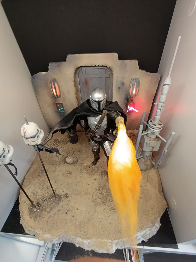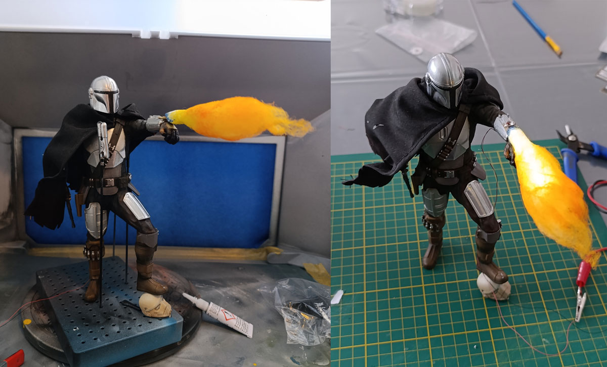 Ich hab mir das Teil nochmal wieder vorgenommen. Die 'whistling birds' Raketen werden einem Flammenwerfer weichen, der ist dann zwar am eigentlich falschen Arm, aber dafür kann ich ihn beleuchten