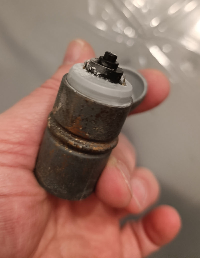 Der Schalter ist untergebracht, das Teil (ich bin mir immer noch nicht sicher was es ist) schließt jetzt nicht mehr komplett, sieht dadurch aber fast interessanter aus. Natürlich sind mir die haardünnen Kupferlitzen beim montieren kaputt gegangen und ich musste auf anständige Leitungen wechseln. Dafür musste ich nochmal komplett durch den Arm bohren und von da sind die Kabel einfach an Rücken und Bein angeklebt, was man erstaunlicherweise aus keinem Betrachtungswinkel sieht im Regal.