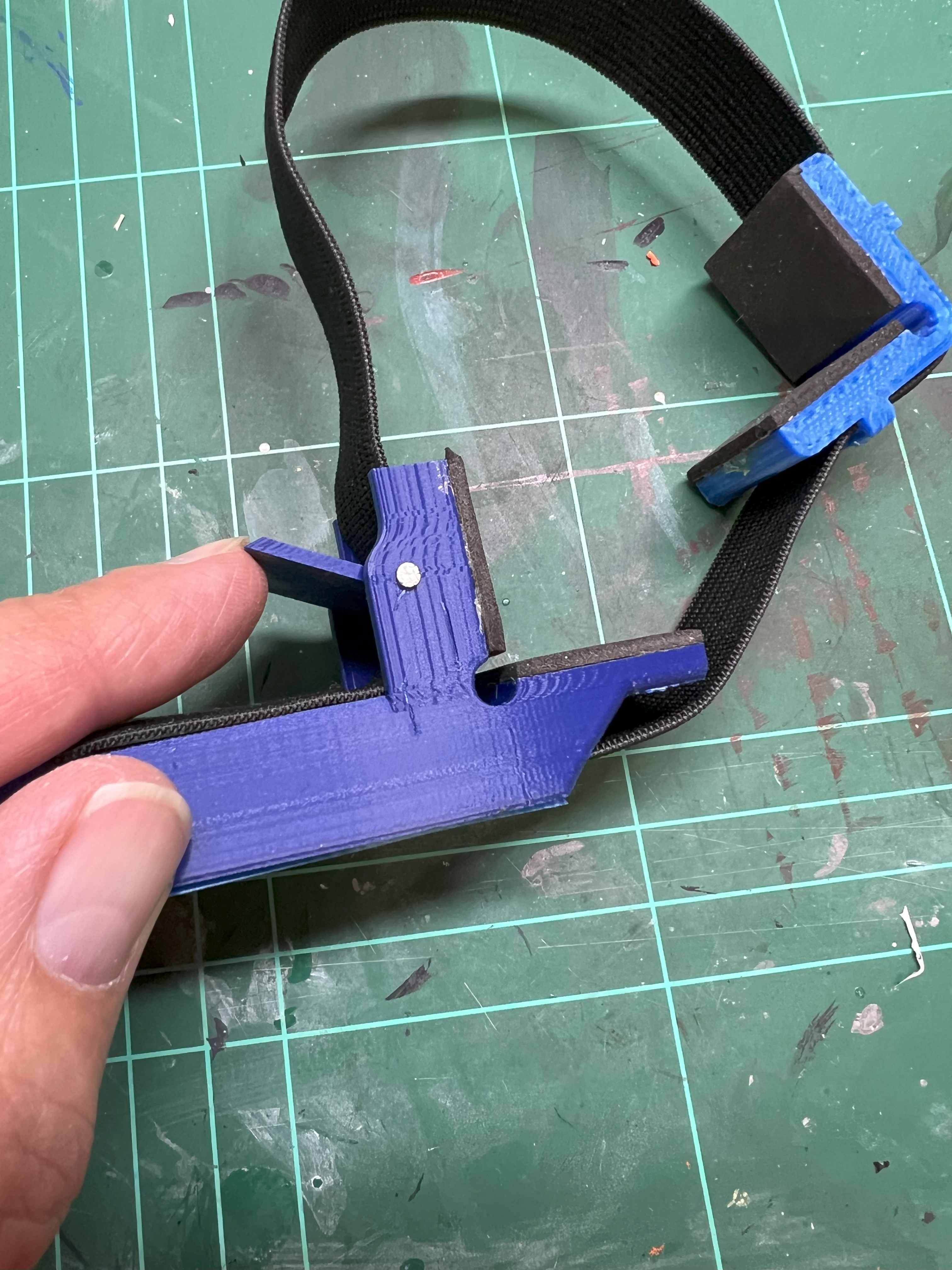 Meine Adaption sieht ein Handstück mit rechtem Winkel vor, an dem ein Gummiband mit einer Breite von 20mm befestigt ist. Auf dem Gummiband ist noch mal ein rechter Winkel flexibel verschiebbar befestigt. Das Gummiband wird wieder zurück auf das Handstückgeführt und kann durch über eine Klemmung fixiert werden, nachdem es mit dem gewünschten Druck festgezogen wurde.