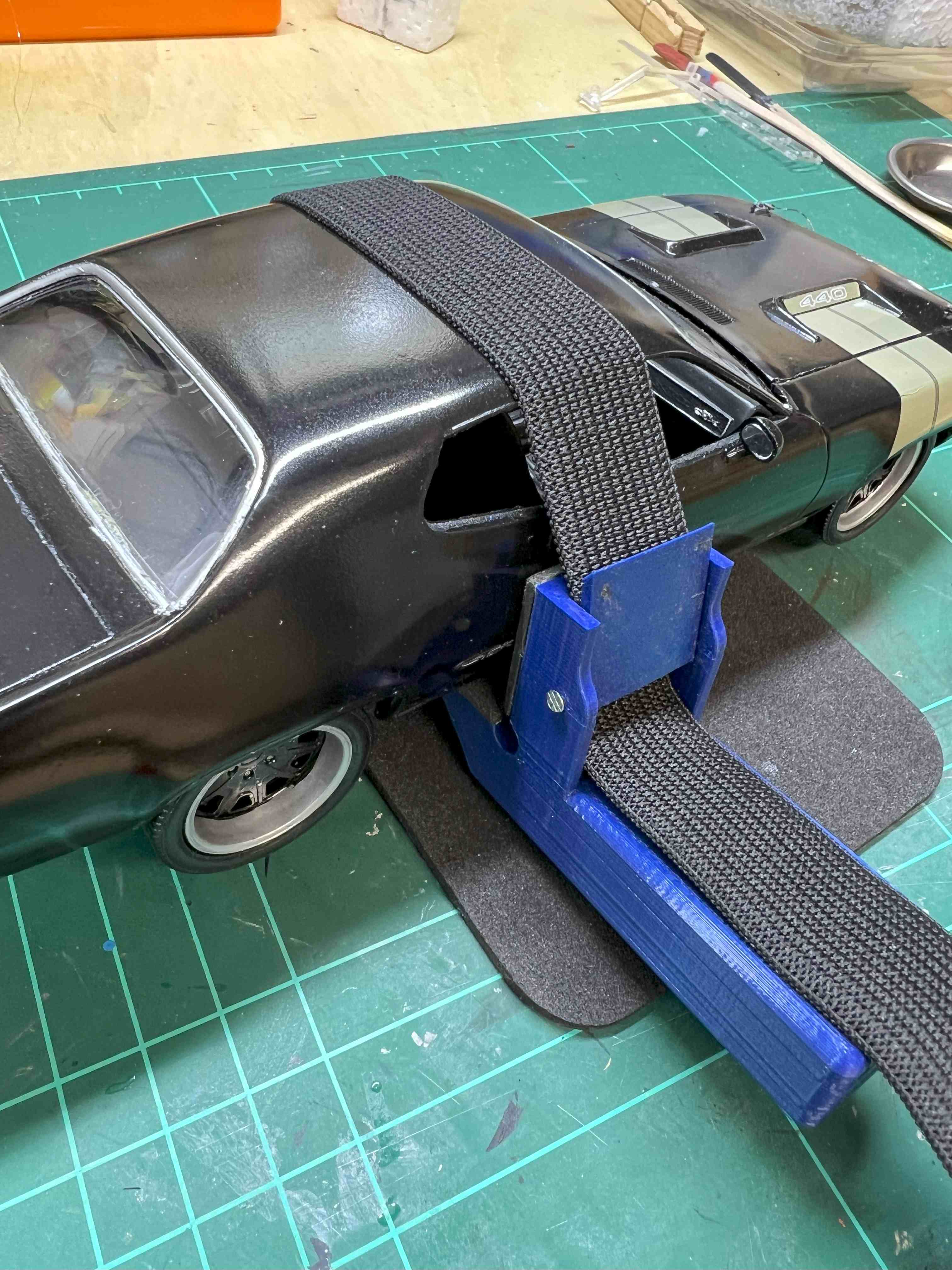 Beim Verkleben von Karosserie mit dem Unterboden im Automodellbau (oder artverwandten) ist es immer notwendig seitlich auf die Karosserie Druck auszuüben, um die Teile sauber zusammen zu bringen. Dafür habe ich oft kleine Zwingen benutzt oder auch Gummibänder.