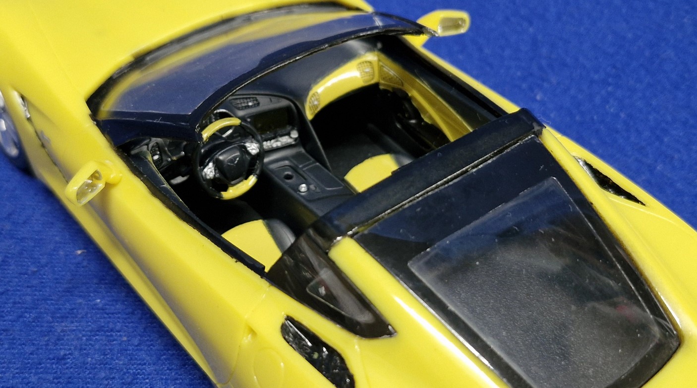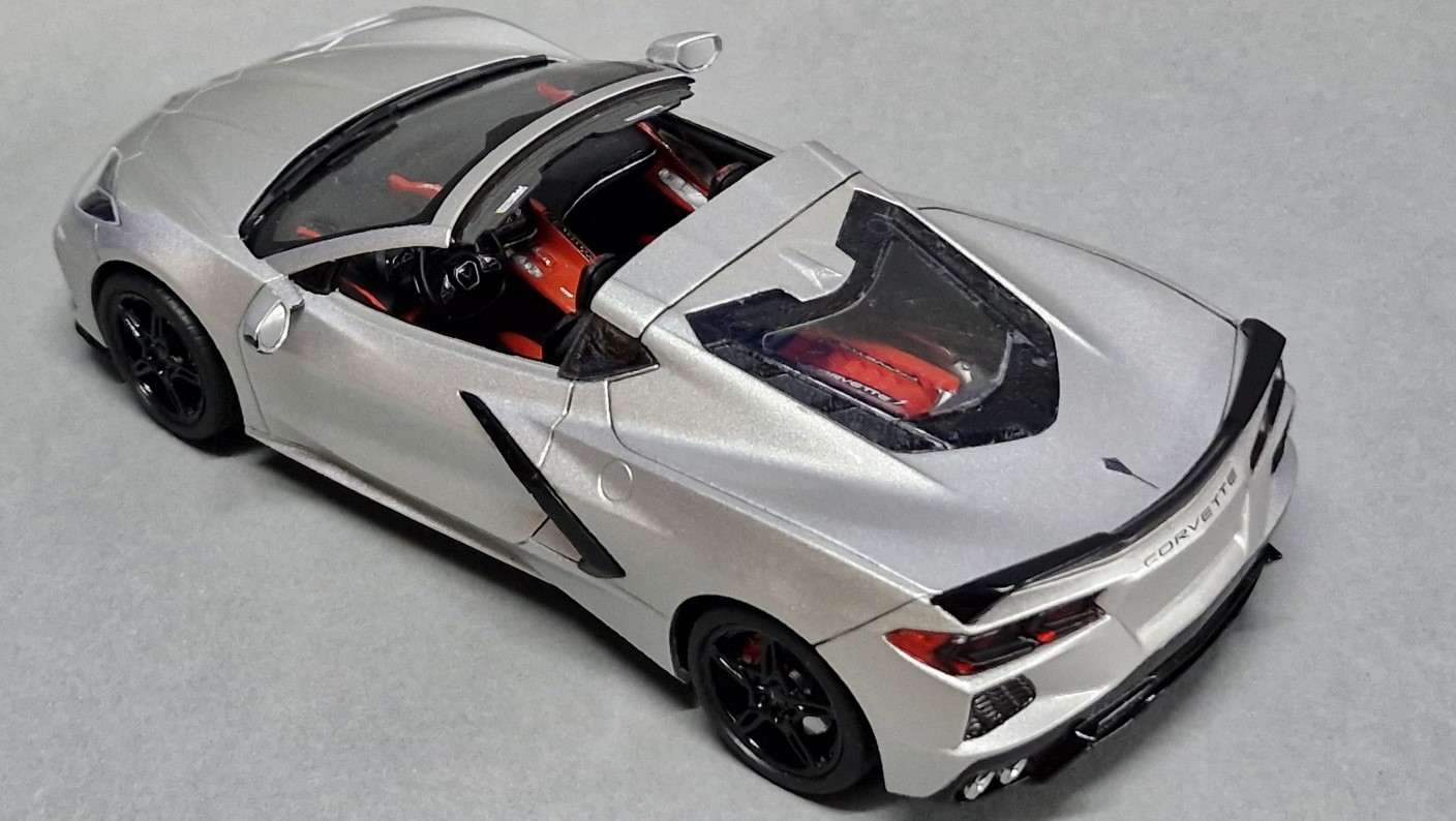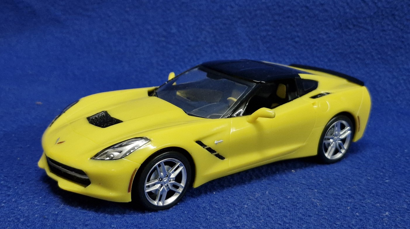 Mit meiner Enkelin habe ich die 2014 Corvette C7 auch zu Ende gebracht. Das ist der snapkit von Revell. Die Karosserie hat alle schwarzen Akzente bekommen und einen Klarlack. Das Dach habe ich abnehmbar als Option umgemodelt und vor allem innen schicker gemacht als dieses triste schwarz. Bausatzvorstellung hier (https://www.kitreviewsonline.de/2014-co ... ell-07825/) Nebenbei und zwischendurch:
