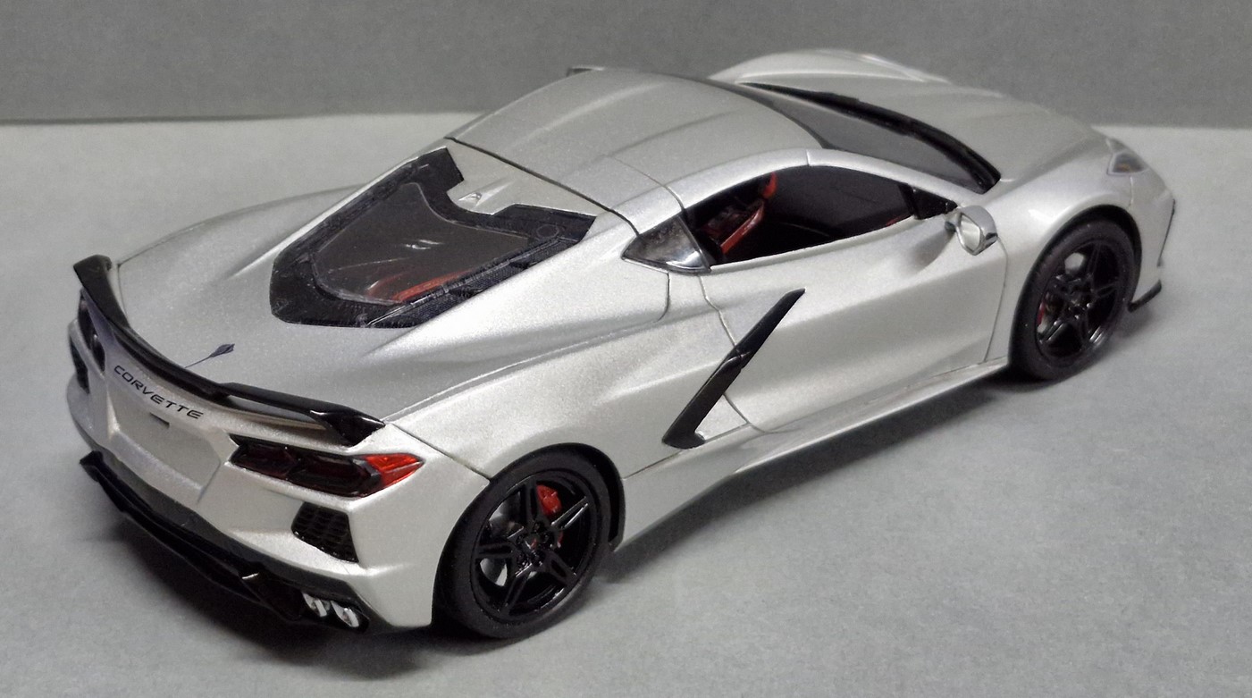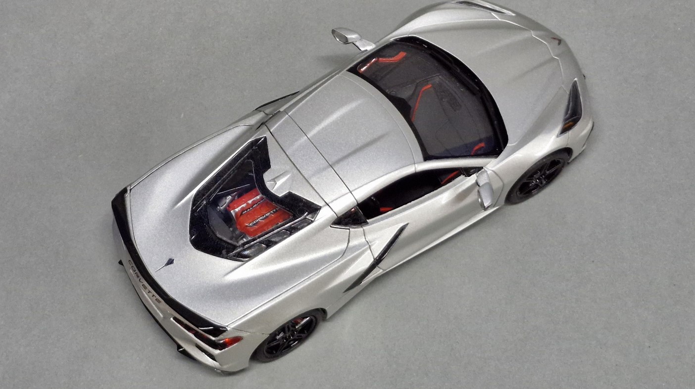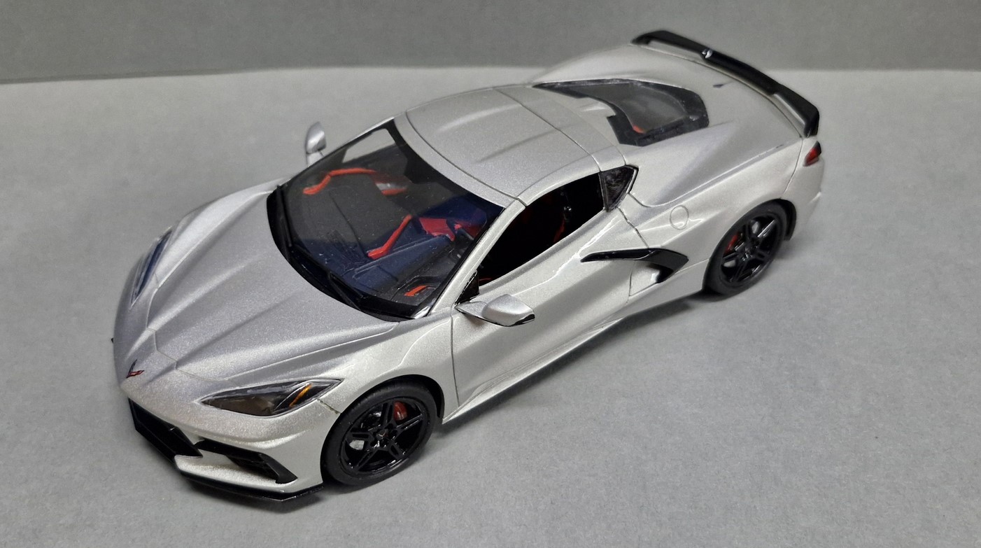 Mit meiner Enkelin habe ich die 2014 Corvette C7 auch zu Ende gebracht. Das ist der snapkit von Revell. Die Karosserie hat alle schwarzen Akzente bekommen und einen Klarlack. Das Dach habe ich abnehmbar als Option umgemodelt und vor allem innen schicker gemacht als dieses triste schwarz. Bausatzvorstellung hier (https://www.kitreviewsonline.de/2014-co ... ell-07825/) Nebenbei und zwischendurch: