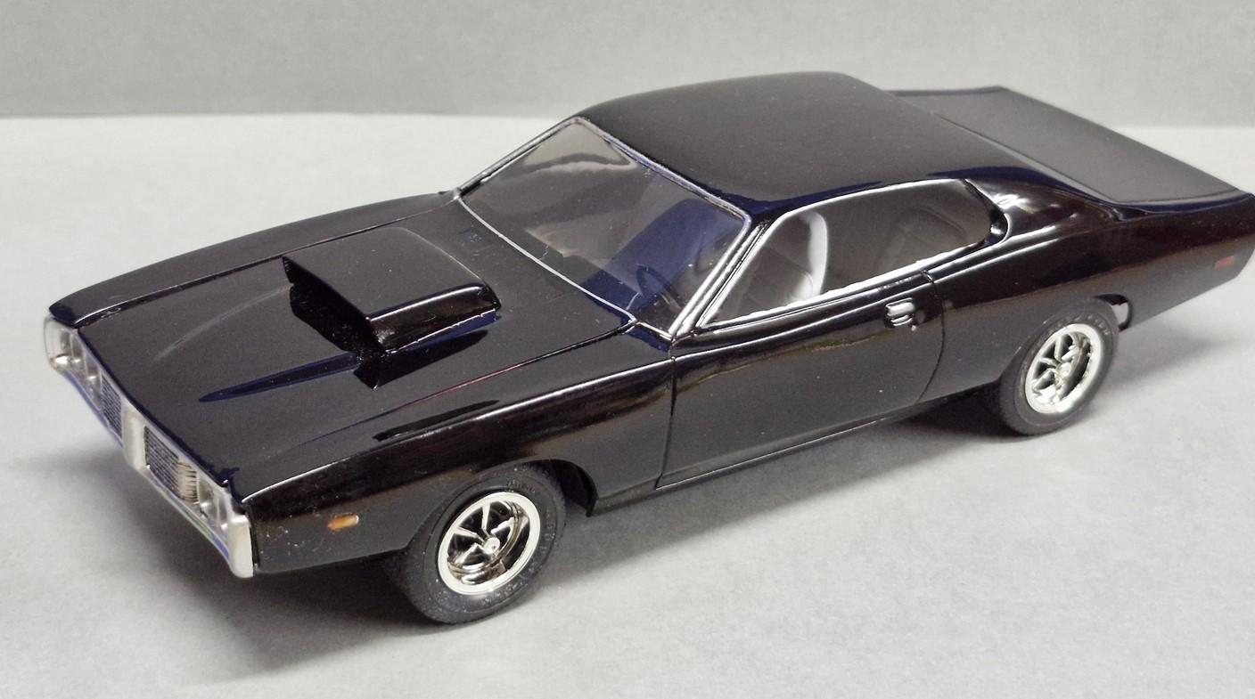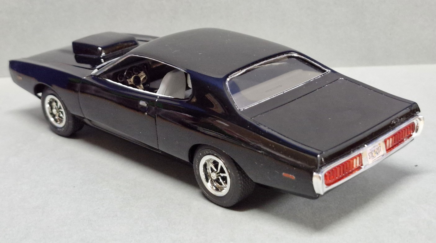 1973 Dodge Charger "Burn Notice"; ein alter MPC-Bausatz ebenfalls aus den 1970ern mit all seinen Herausforderungen. Nur die Felgen stammen aus meiner Kramskiste, weil der Bausatz nur dusselige Rennräder hat. Die Rückleuchten (ehemals rote, klare Teile) habe ich in klarem Harz gegossen, damit man sie richtig bemalen kann. Auch von dem gibt es eine Bausatzvorstellung (https://www.kitreviewsonline.de/super-c ... pc-1-0806/). Ich liebe diese alten Bausätze ja schon irgendwie