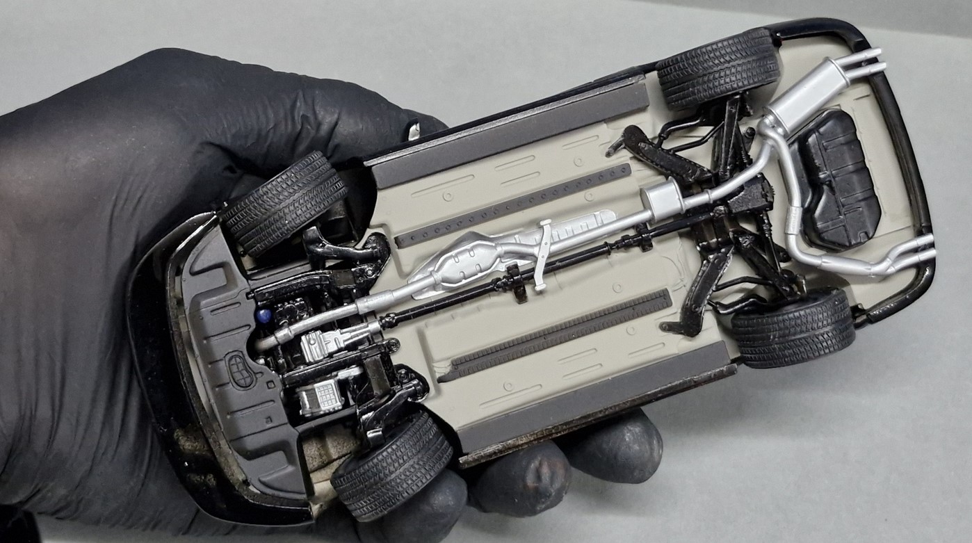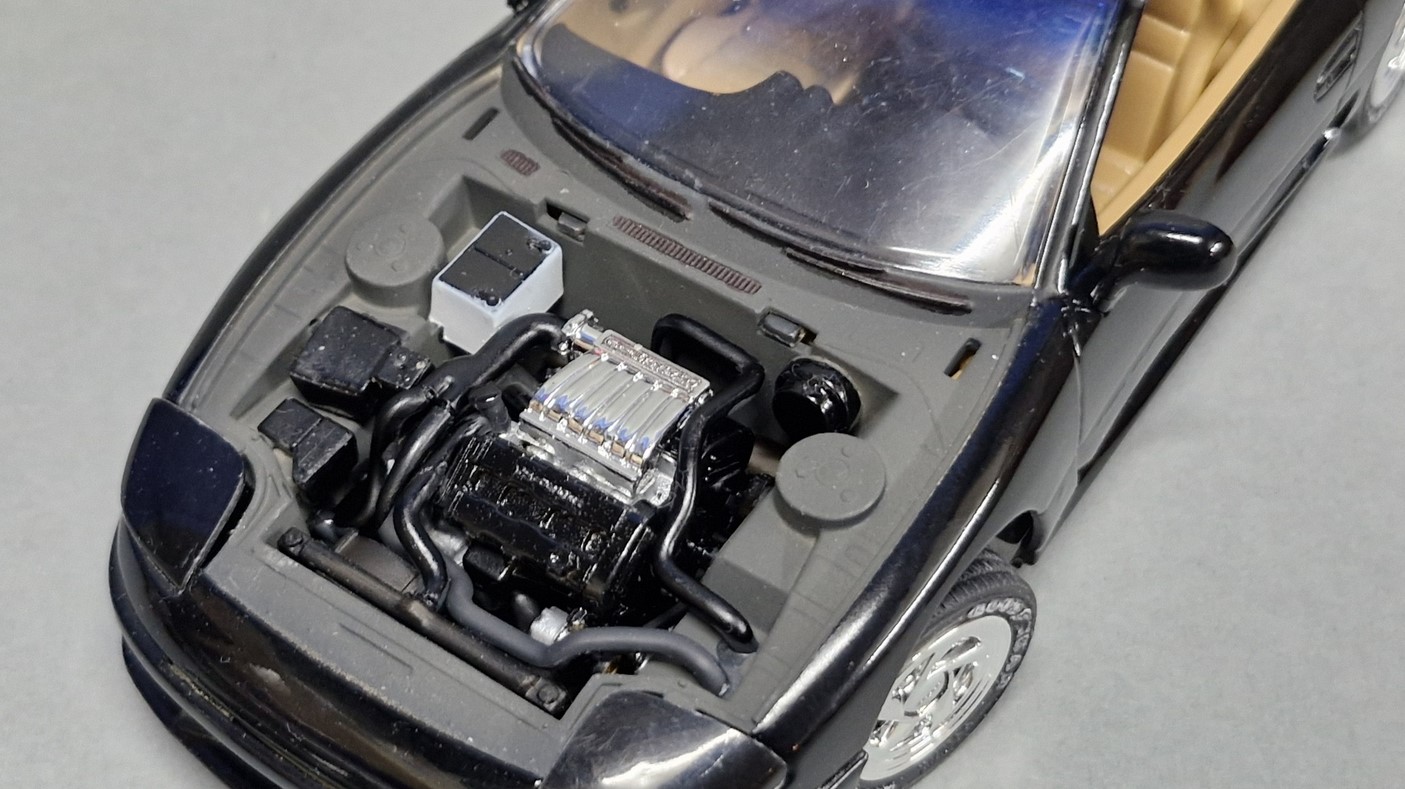 Dadurch kann die Klappe nach oben schwingen. Aber, weil die wirklich gut in die Karosserie passt, habe ich noch alle Kanten angeschrägt, dass hier so wenig Kontakt besteht wie möglich. Mit einem Skalpell kann man die so locker aufhebeln. Wenn man die C8 auf den Kopf dreht, klappt die Haube trotzdem nicht selbstständig auf. Mit angeklebtem Zwischenstück ist es unmöglich, die Haube zu öffnen.