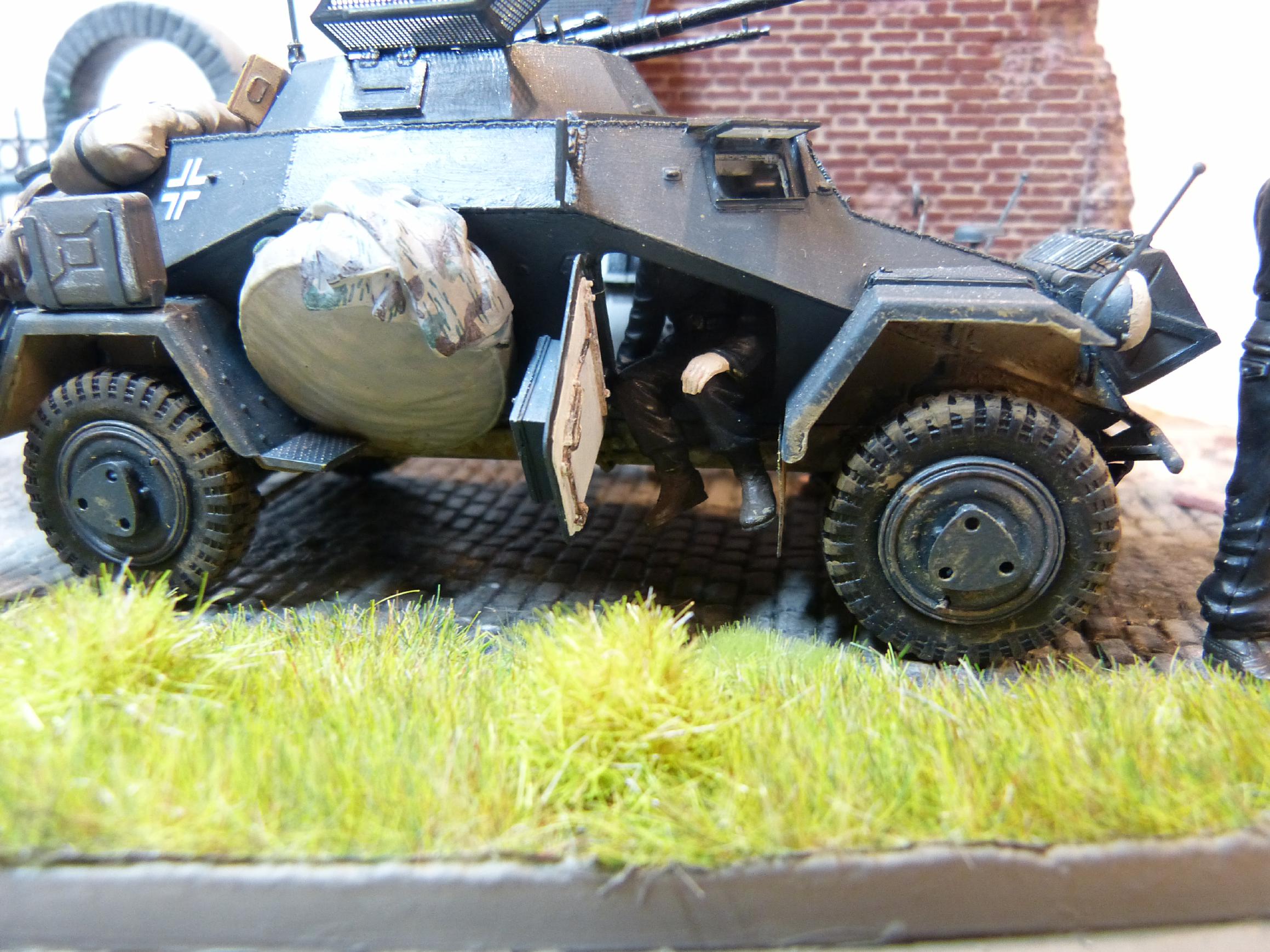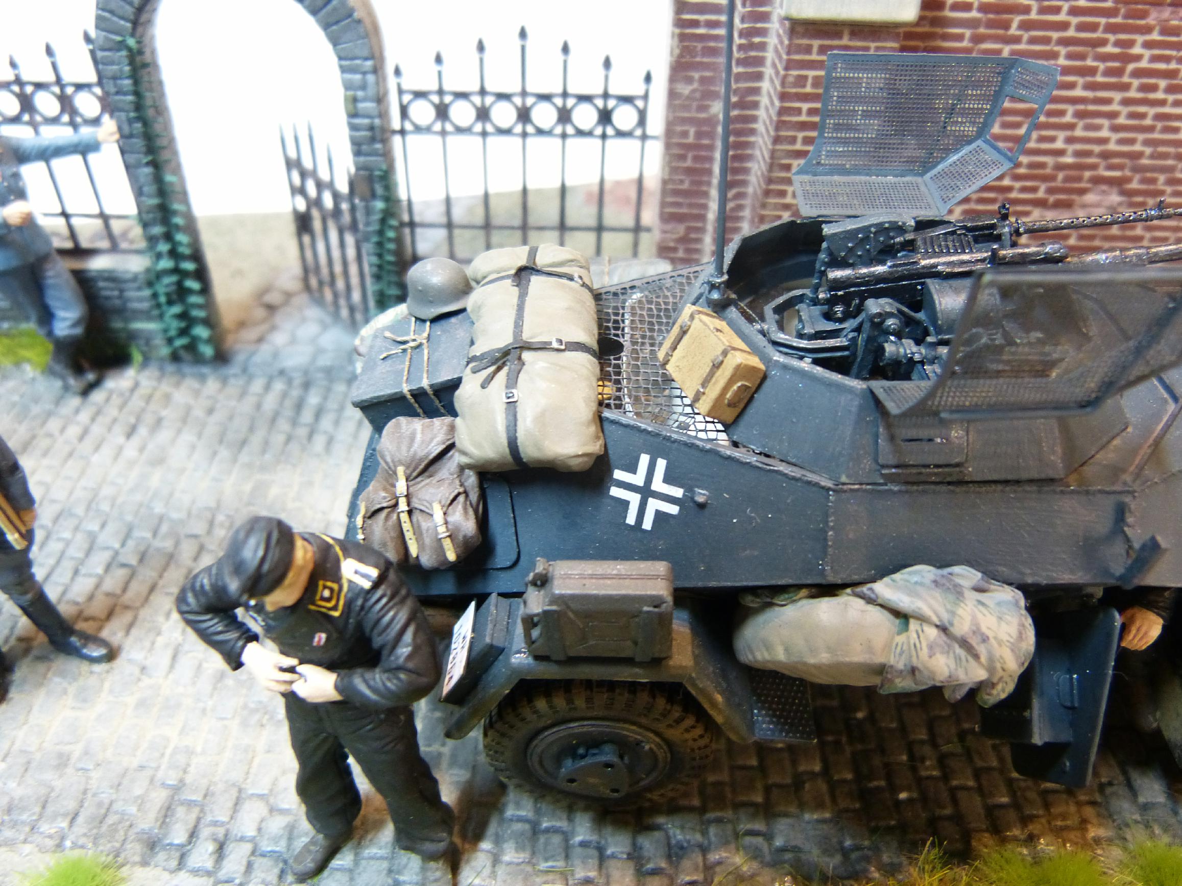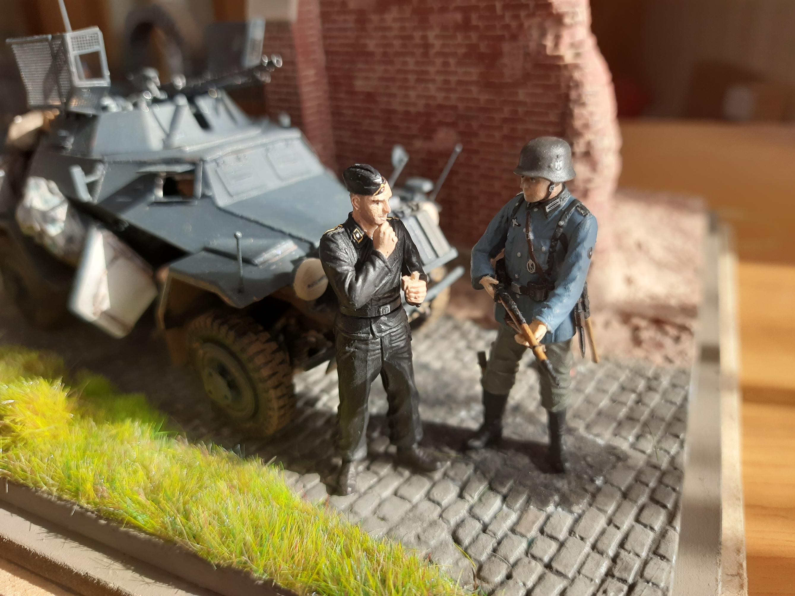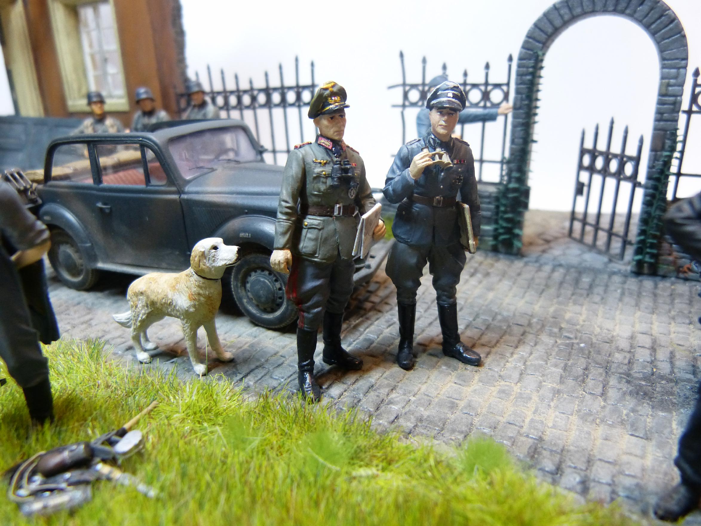 Am 18.05.40 wurde die Standarte 1 „Deutschland“ von der 225. Infanteriedivision bei Walcheren (Niederlande) im Rahmen des Westfeldzugs („Fall Gelb“) abgelöst. Die fiktive Szene zeigt die beiden Befehlshaber der beiden Kampfverbände, Generalleutnant Ernst Schaumburg (1880-1947) und Standartenführer Felix Steiner (1896-1966) im Gespräch, während sich Angehörige beider Einheiten auffrischen. Schaumburgs Dienstwagen (Opel Olympia) und ein Fahrzeug des Aufklärungszuges (Sd.Kfz 222) sind ebenfalls zu sehen. Während die Männer der Deutschland-Standarte schon mit neueren Feldblusen ausgestattet sind, tragen die Soldaten der Wehrmacht noch das alte Modell M36.