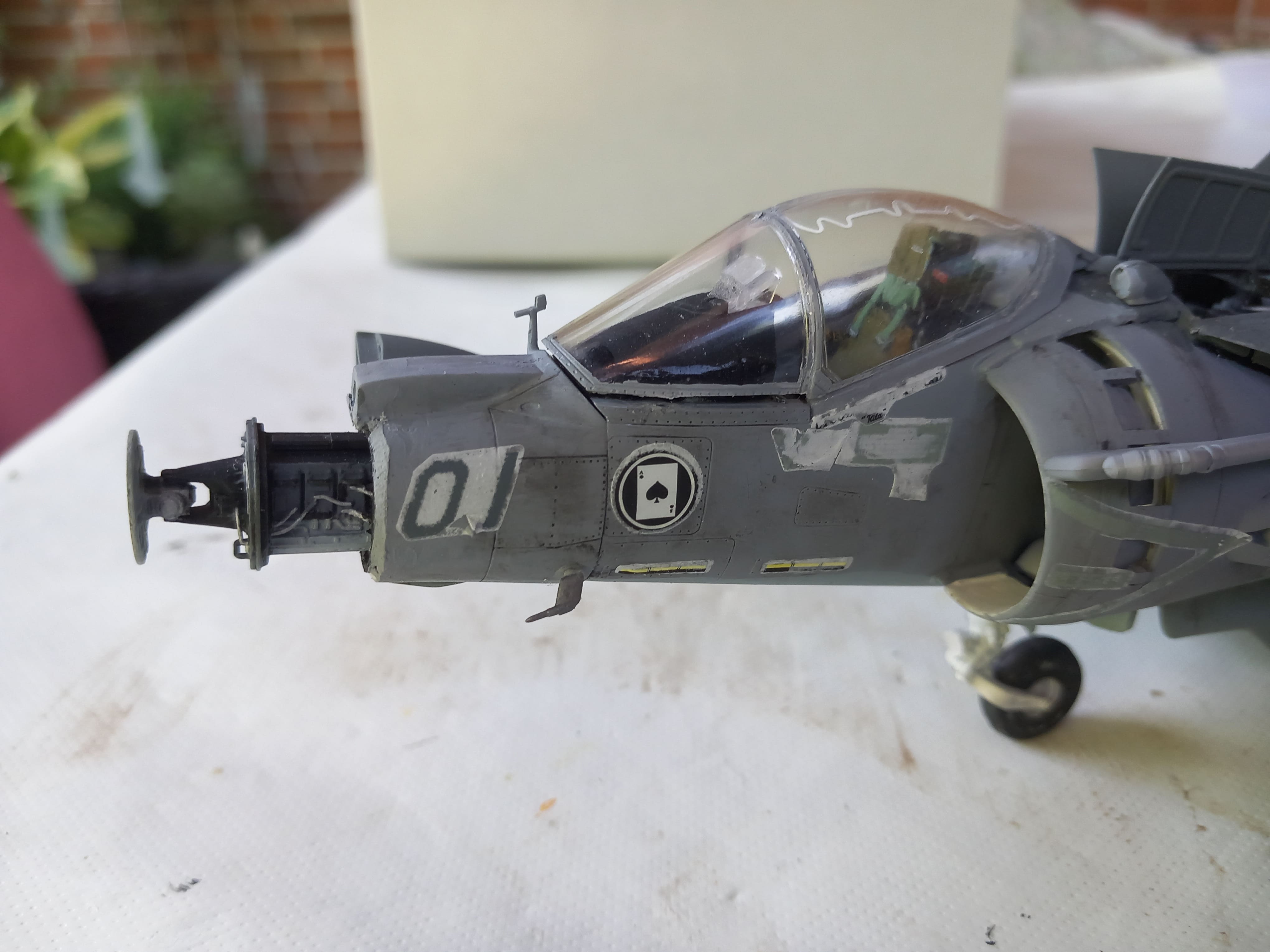 Hallo zusammen. Die Klarsichtkanzel ist aufgesetzt. Hier gab es Probleme mit größeren Spalten. Nach dem Spachteln geht es dann so. Damit ist der Bau des Senkrechtstarters abgeschlossen. Ein paar Feinheiten müssten noch ausgeführt werden. Aber durch die katastrophalen Decals habe ich dazu die Lust verloren. Wenigstens habe ich die verlorene Klappe wiedergefunden. Ich schiebe den Flieger erstmal beiseite. Die Teile für das Diorama baue ich später zusammen, wenn ich wieder Lust auf das Modell habe. Dann melde ich mich mit dem Baubericht zurück. Gruß Ingo