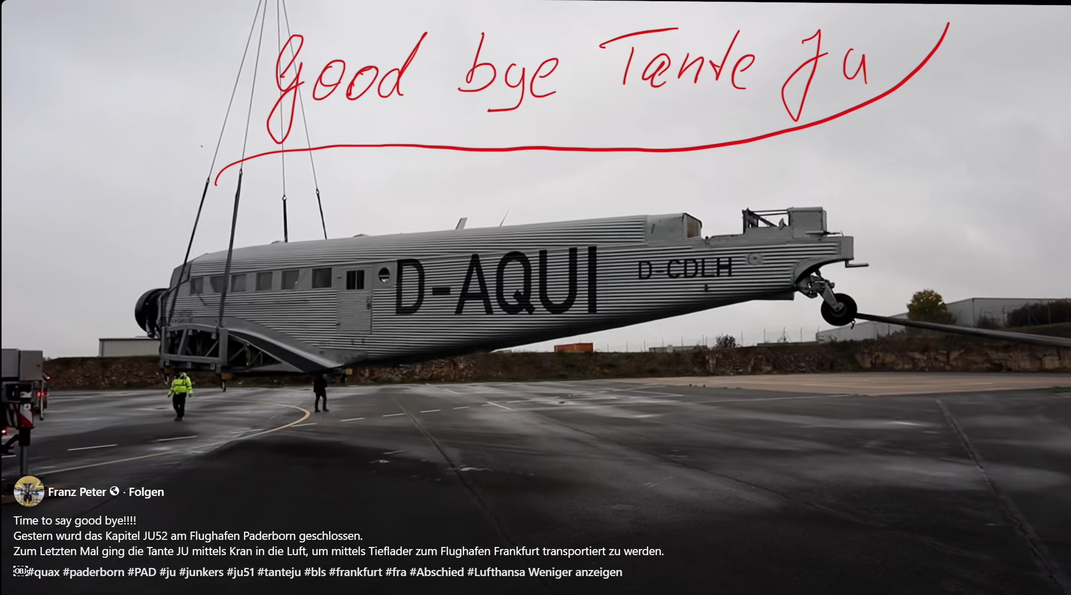 sehr, sehr schade..... die gute alte Tante Ju wurde von Paderborn nach Frankfurt ins Lufthansa-Museum gebracht, wo sie vor ein paar Tagen angekommen ist. Für mich hängen da viele Erinnerungen dran und bin selbst schon mit ihr geflogen.