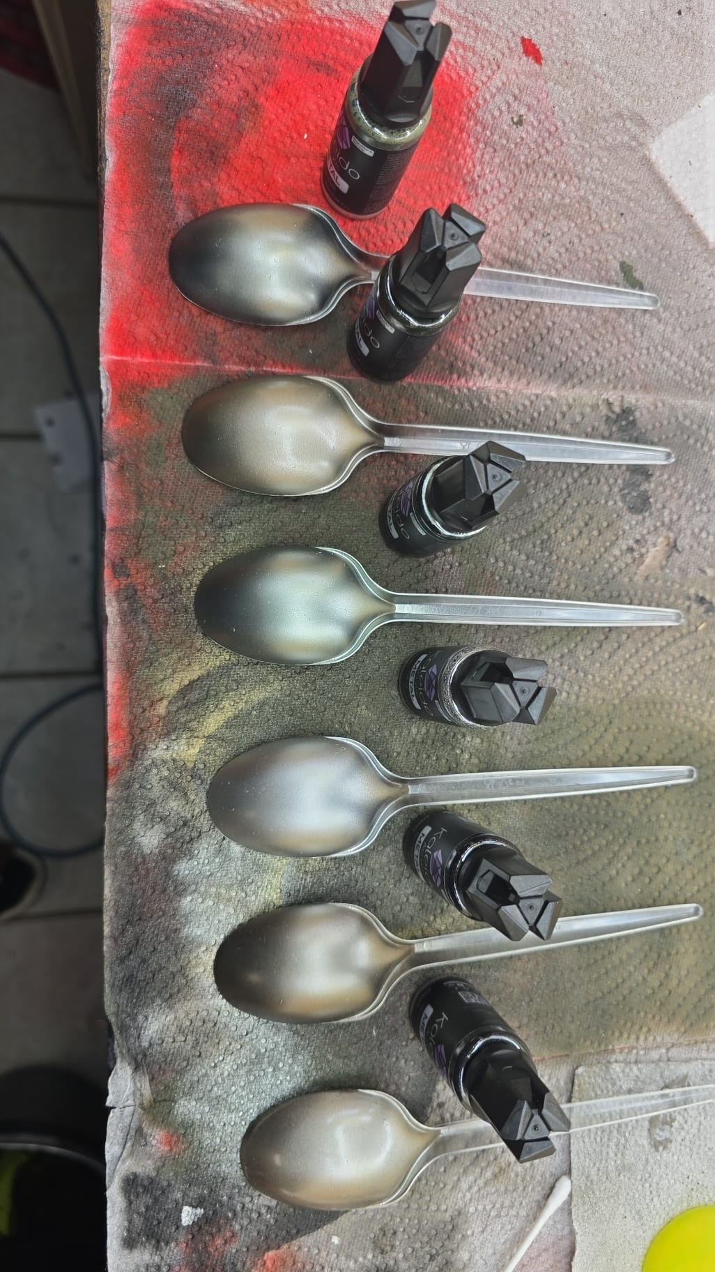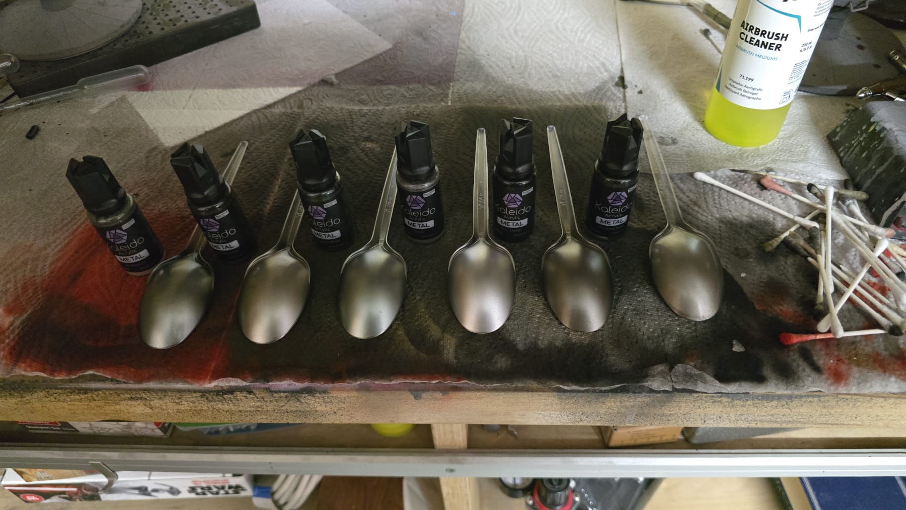 Alle Löffel wurden zuerst mit einer dünnen Schicht Primer black glossy gebrusht. Ich finde das Ergebnis absolut überzeugend, nur das Red Copper ist wohl seltsam. Da sind die Tamiya Kupfertöne besser.