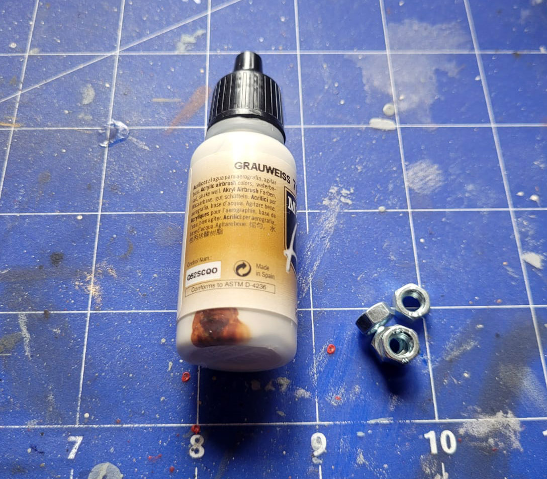 Dabei ist mir ein Farbfläschchen von Vallejo in die Hände gefallen, in die ich seinerzeit eine kleine Stahlmutter gegeben habe, um die Farbe durch Schütteln gut gemischt zu halten. Wie oben in meinem längeren Beitrag schon kurz angesprochen, reagieren diese Muttern jedoch mit der Farbe, was dann zu solchen unschönen Ergebnissen führen kann: