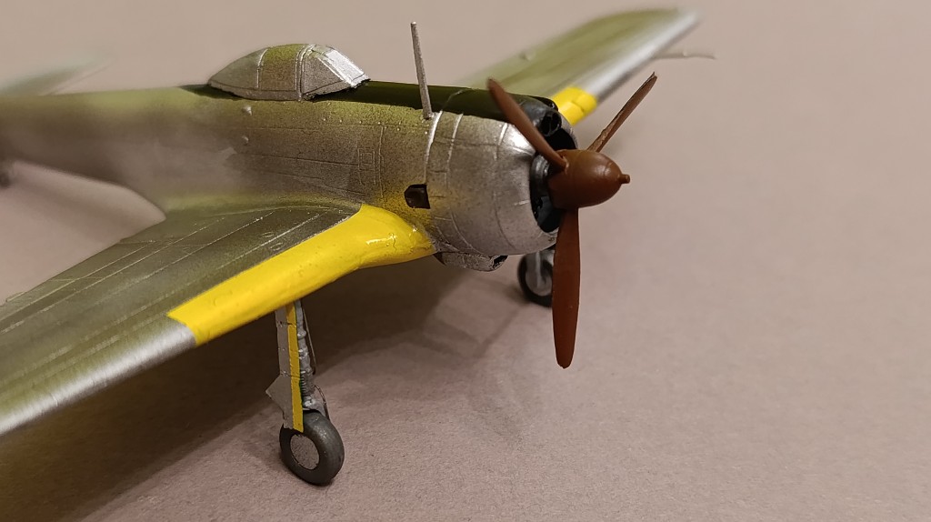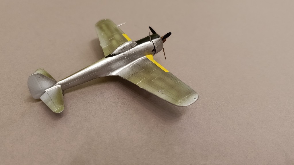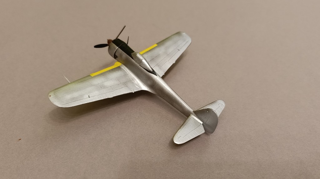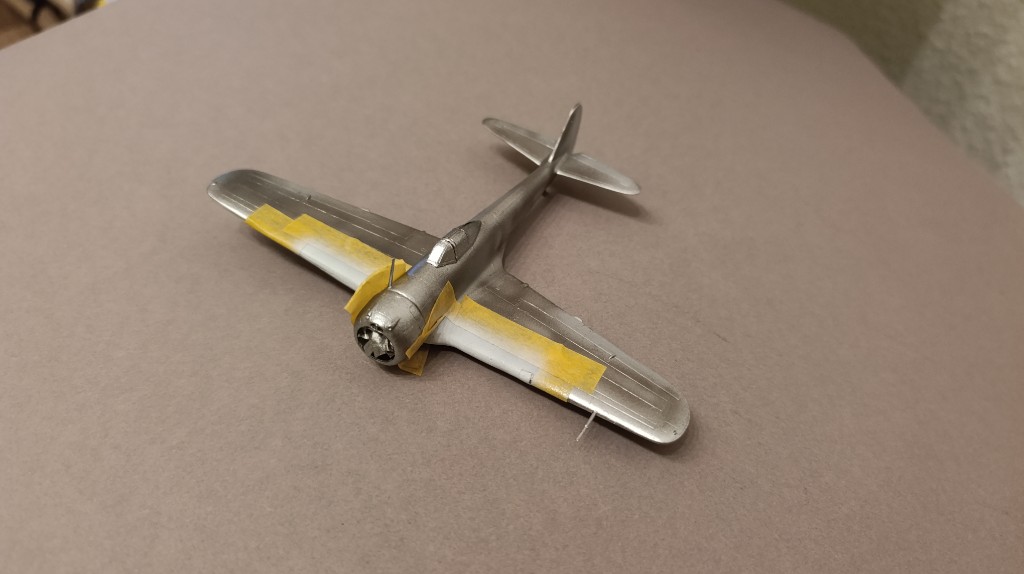 Nach dem die Farbe aufgetragen war, musste ich die Flügelkanten und den Rumpf umfangreich abkleben. Da gelb kaum deckt, habe ich diese Flächen weiß grundiert.