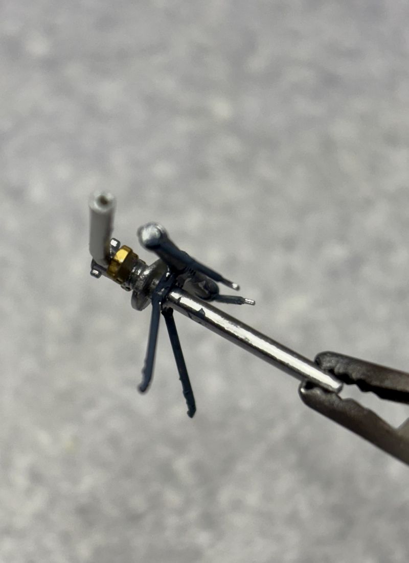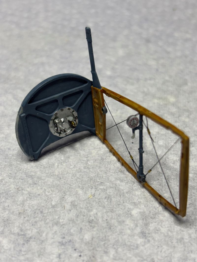 Auch habe ich die Einheit mit dem Steuerknüppel fertig. Dieser bekam bereits 2 Steuerseile verpasst. Die im Rahmen angedeuteten Löcher habe ich aufgebohrt.