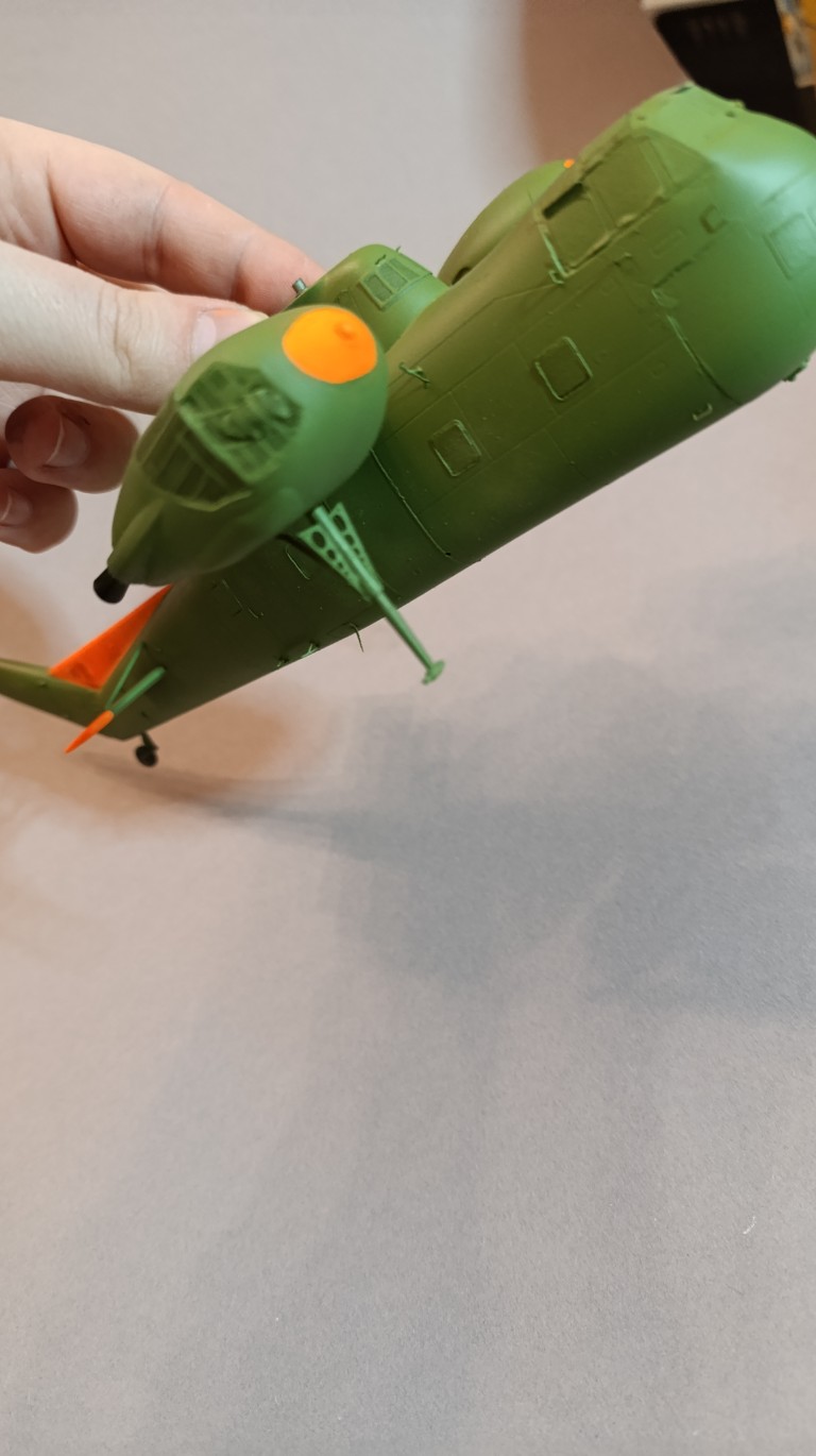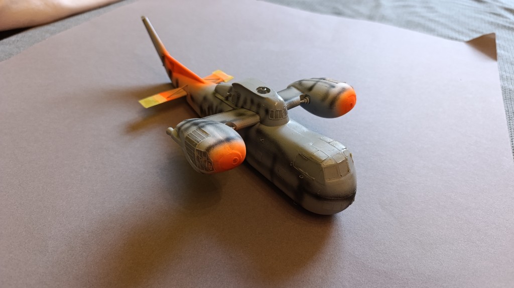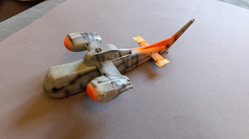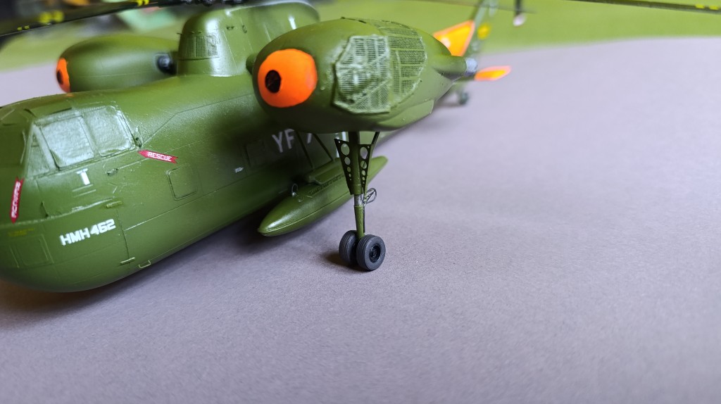 Dann würde der Hubschrauber lackiert. Ich habe alles ordentlich abgeklebt und gesprüht. Tatsächlich ist fast alles am Hubschrauber Marinegrün. Ich bin froh, dass ich mich doch für die Version mit dem Orangen entschieden habe.