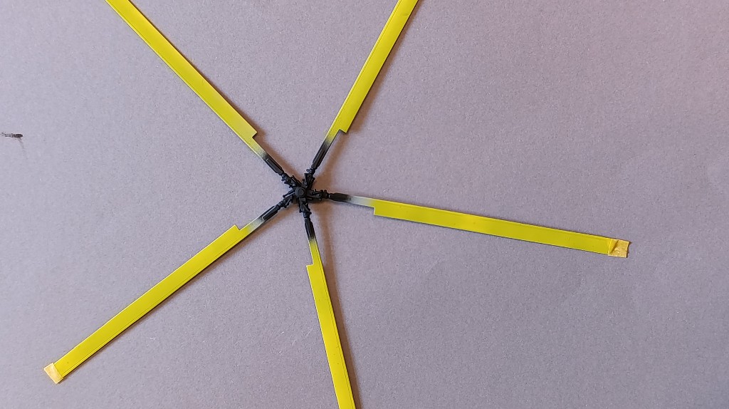 Den Hauptrotor habe ich gelb lackiert, weil das die Grundlage für die Streifen wird, die ich nun abkleben muss.