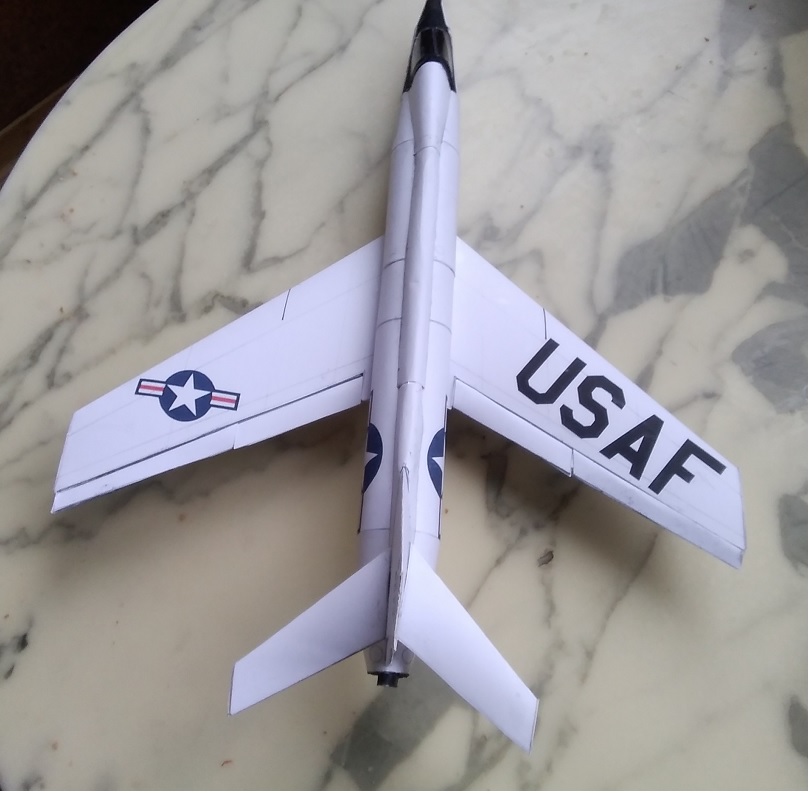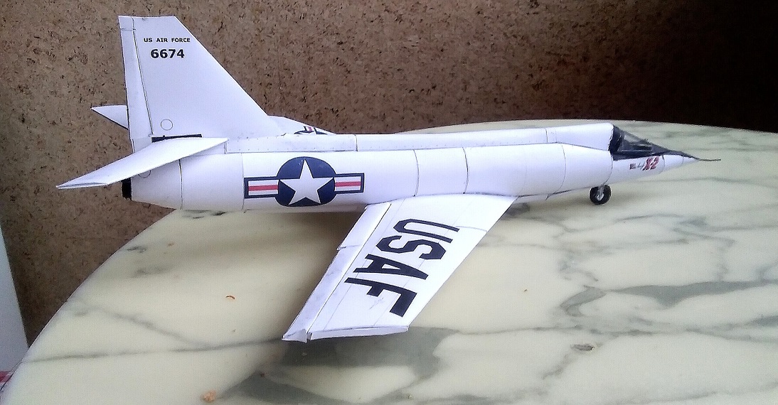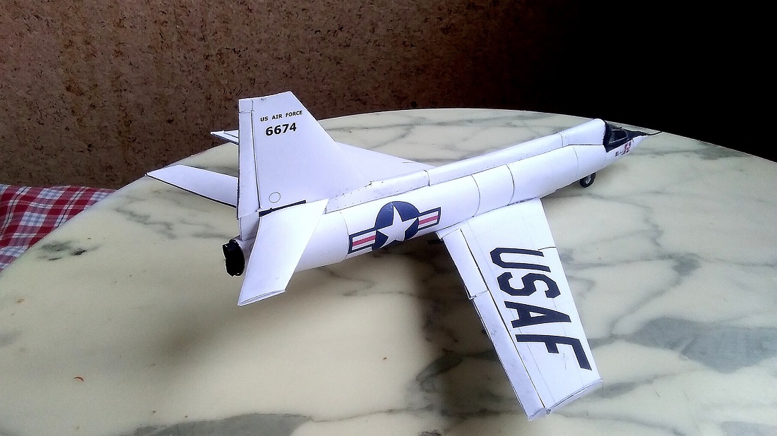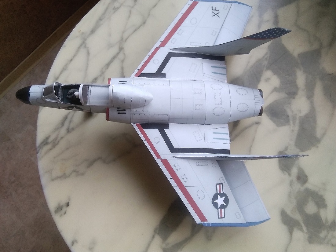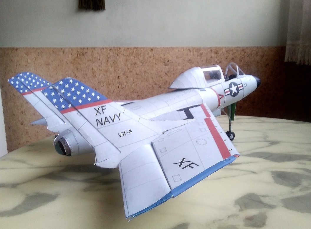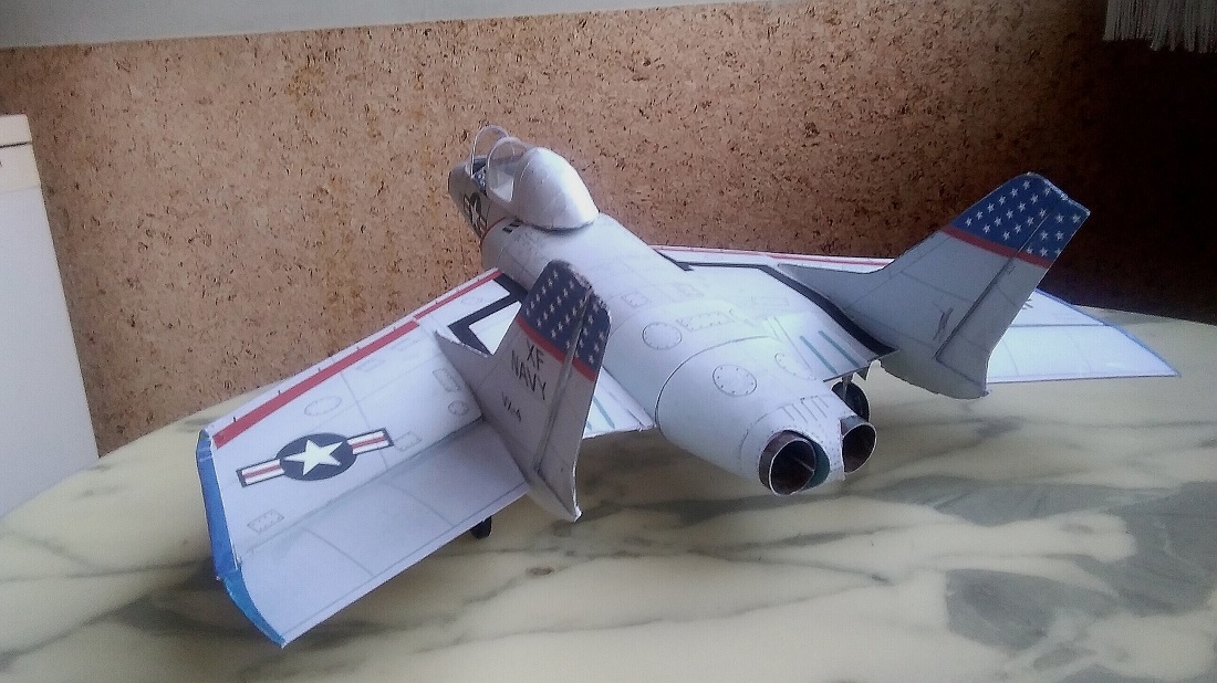 Sauber gebautes Pappmodell eines aussergewöhnlichen und, wie sich damals herausstellte, höchst problematischen Jets, der darum nur kurz im Einsatz der Navy war.