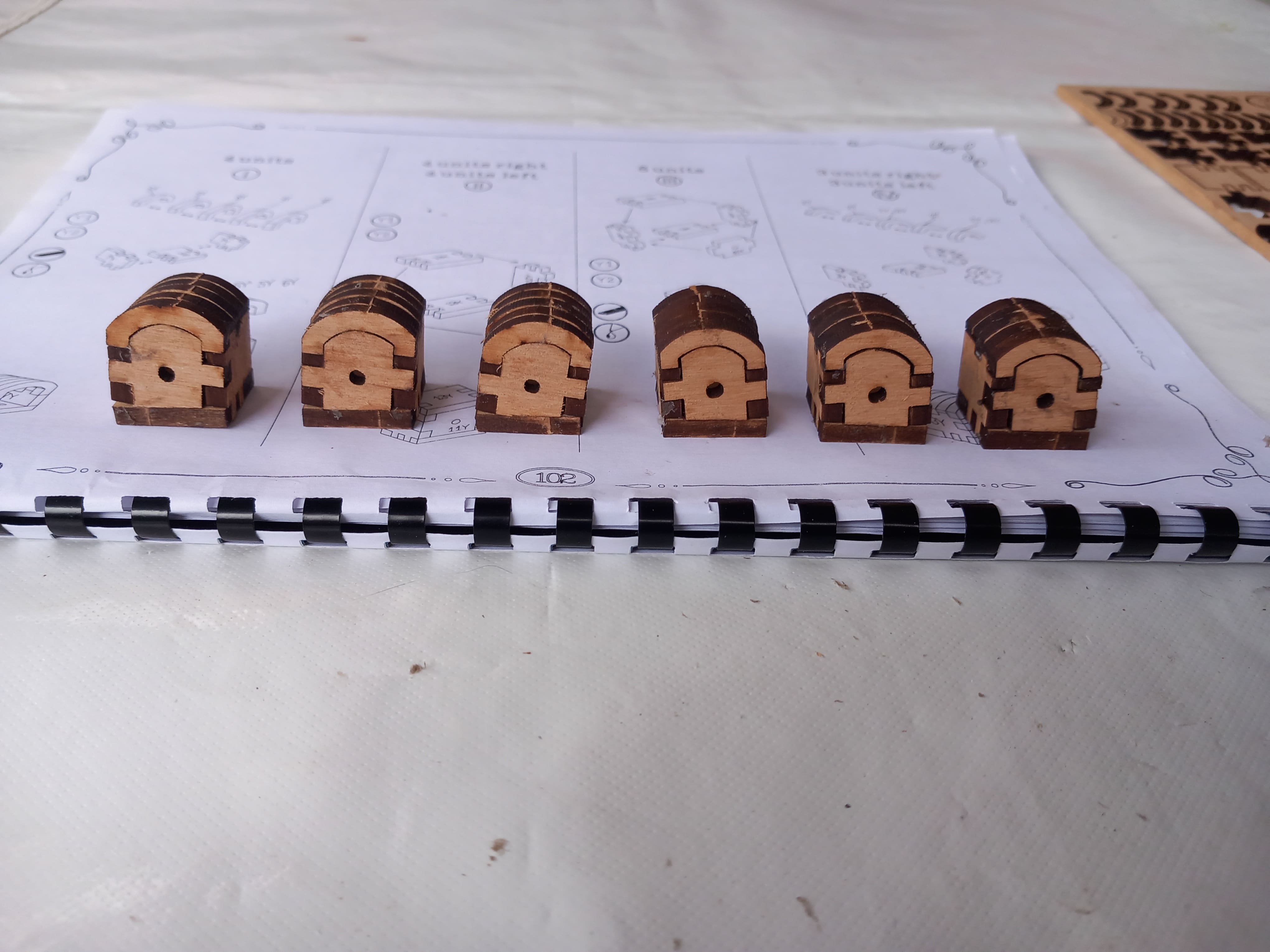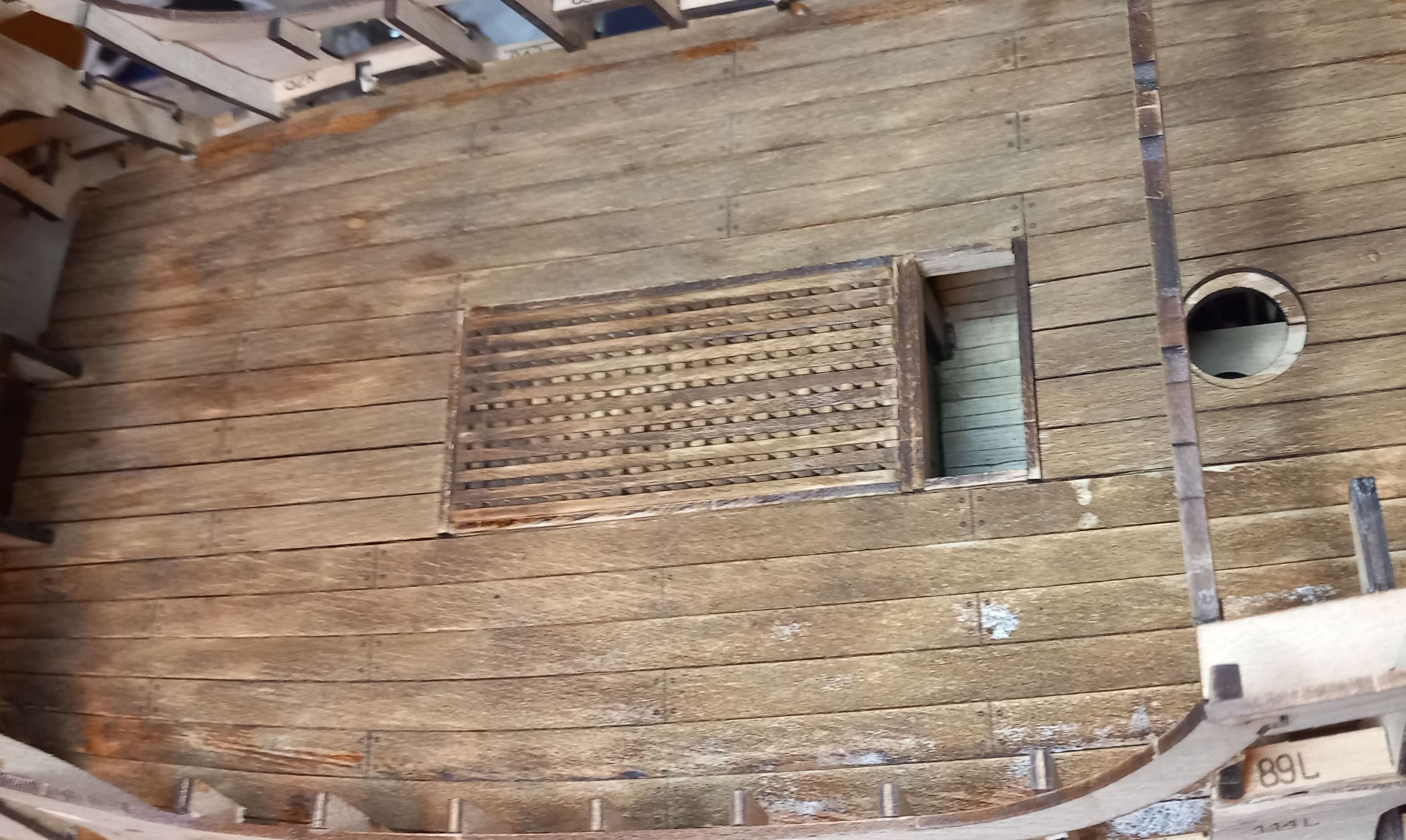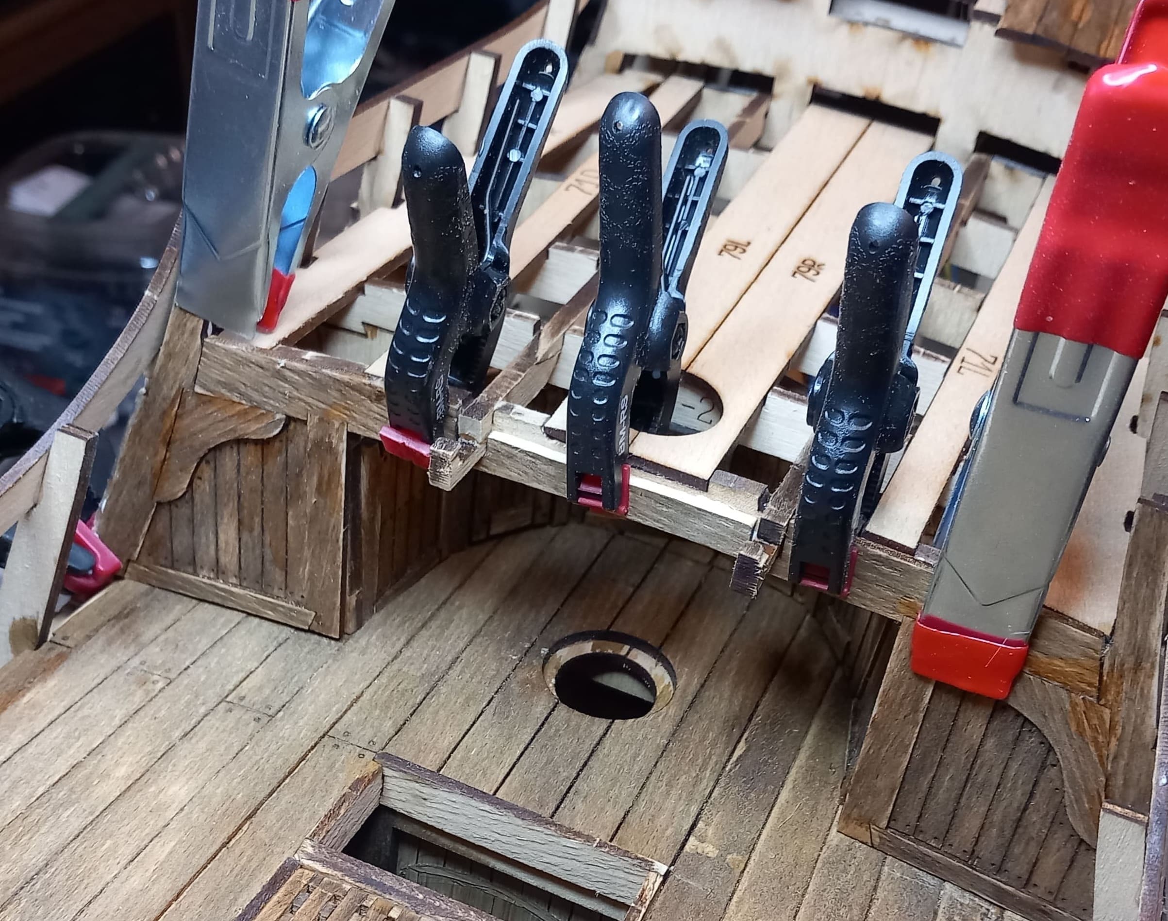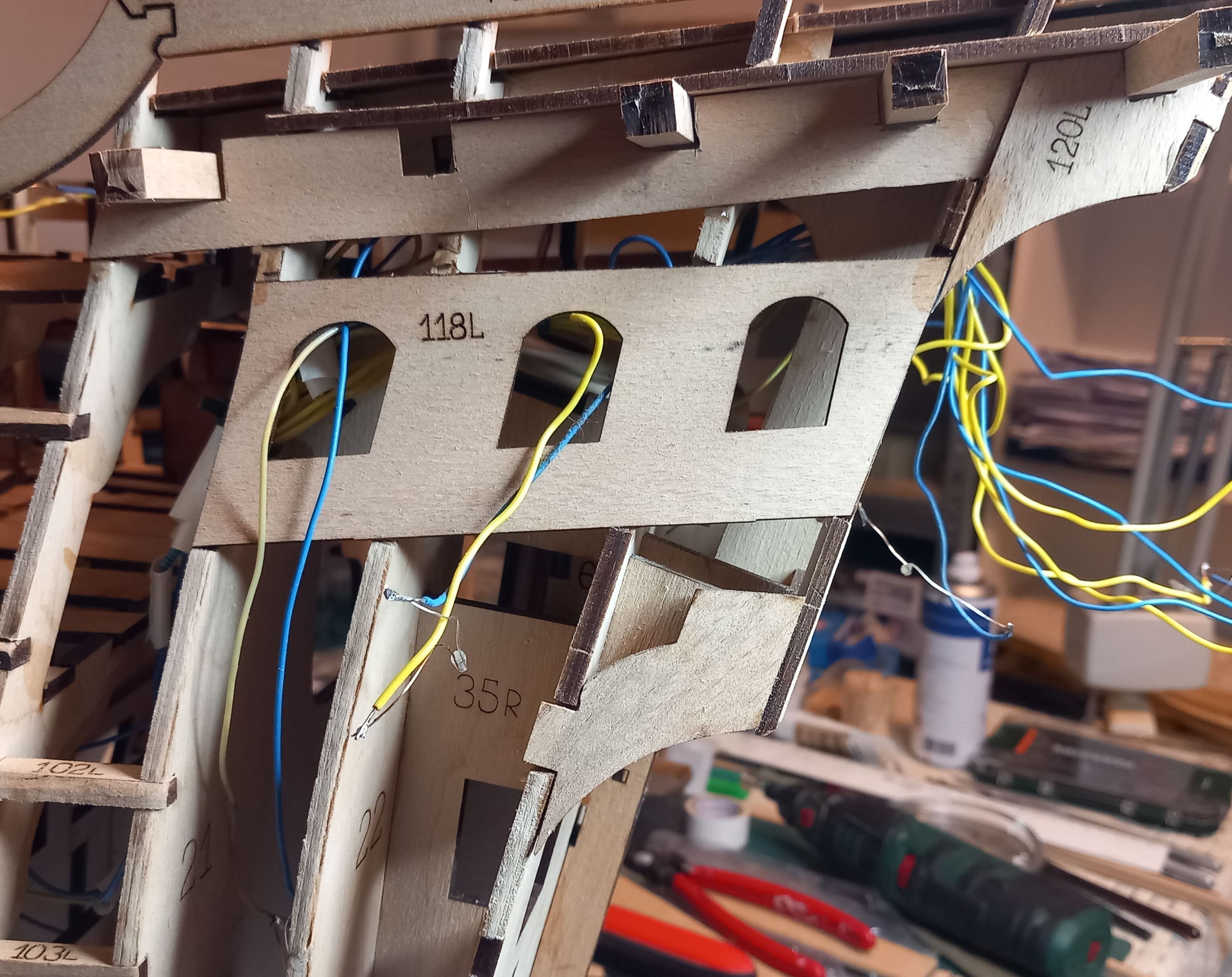 Moin zusammen. Die oberen Geschützpforten sind fertig. 6 auf jeder Seite, 2 nach links, zur Mitte und nach rechts ausgerichtet. Außerdem hat das Deck Farbe bekommen. Gruß Ingo