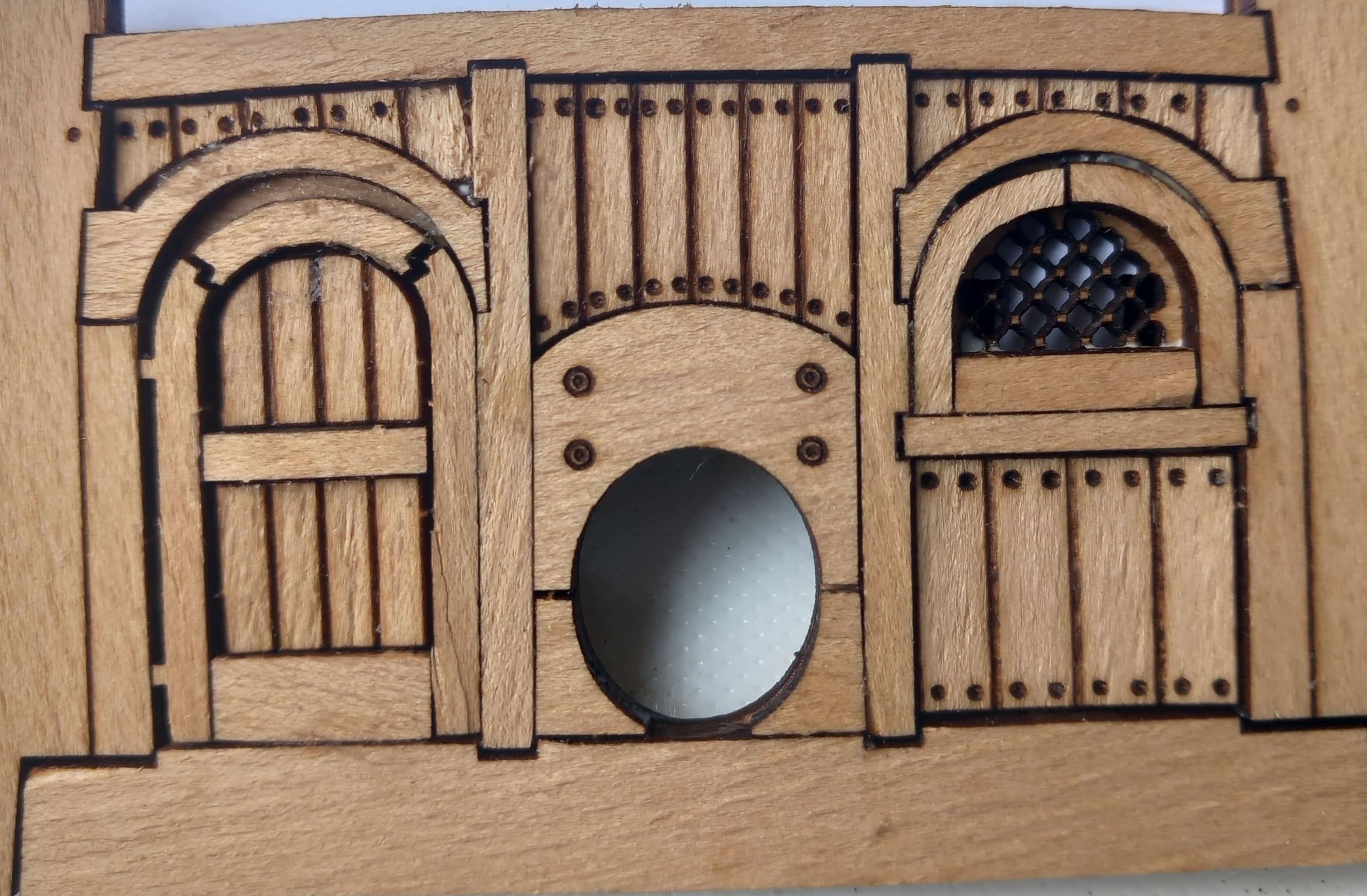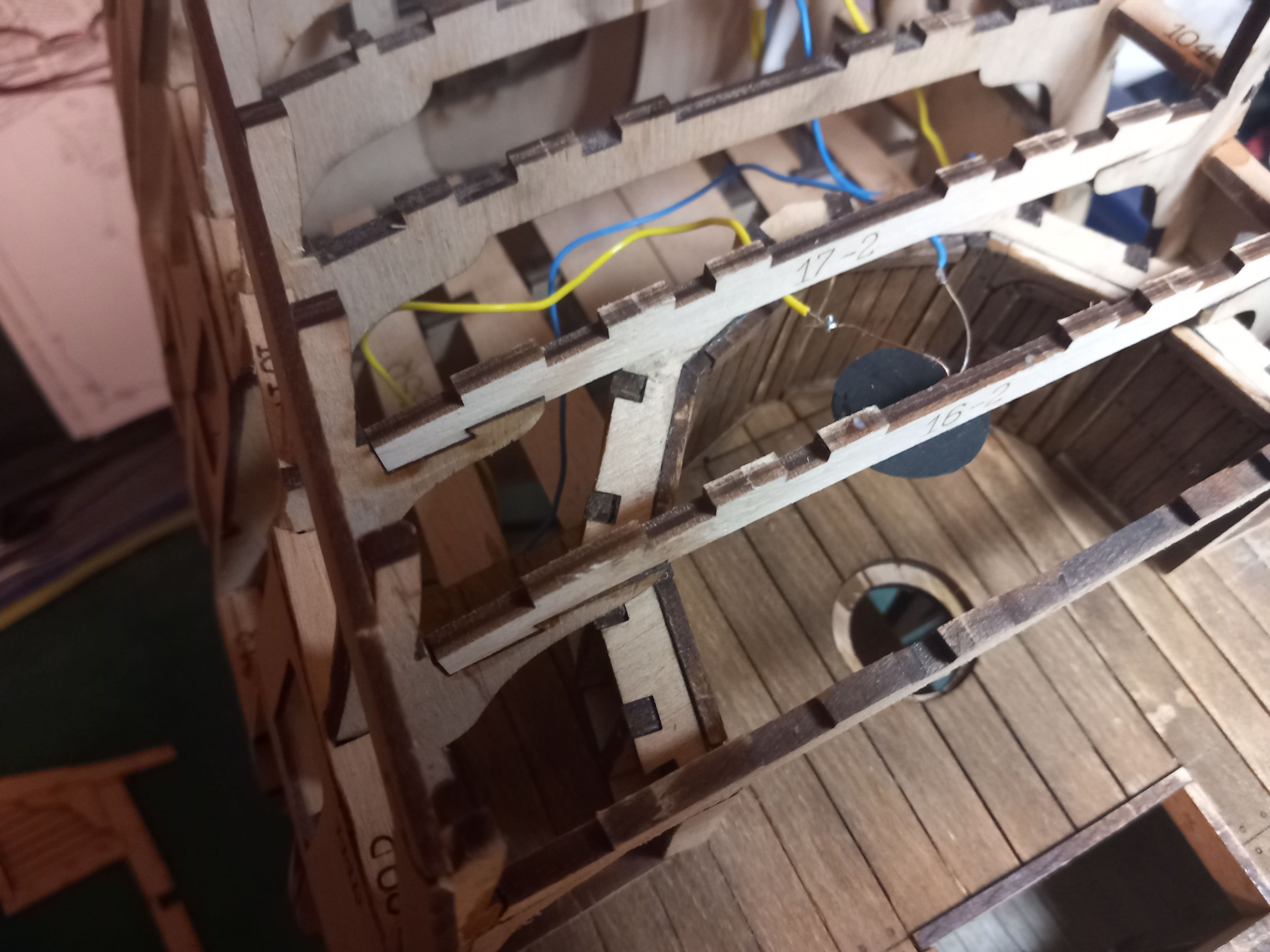 Danke schön. Da ist mir im letzten Post ein Fehler unterlaufen. Von den abgerundeten Geschützpforten existieren nur 10 nicht 12. 12 Stück sind es bei den eckigen Pforten. Aber es ging wieder voran. Zuerst wurde die erste Lampe fest installiert, im Vorraum des Rondels. Dann kamen die Längsbalken darüber und dann noch die vordere Abschlußwand zum Rondel. Diese musste zersägt werden, eingefügt, und wieder zusammengeklebt werden. Sonst hätte diese Wand nicht gepasst. Gruß Ingo