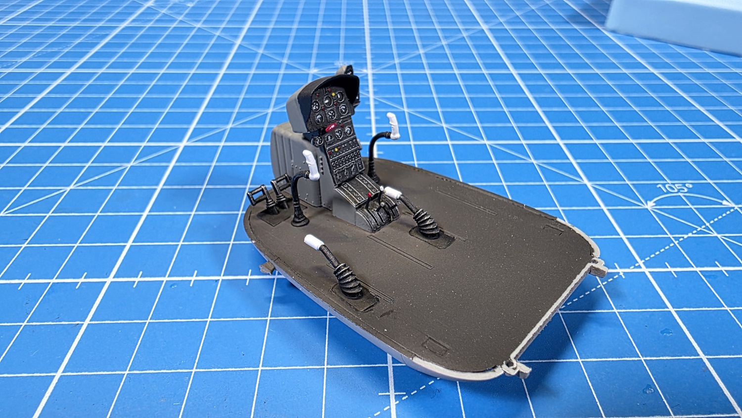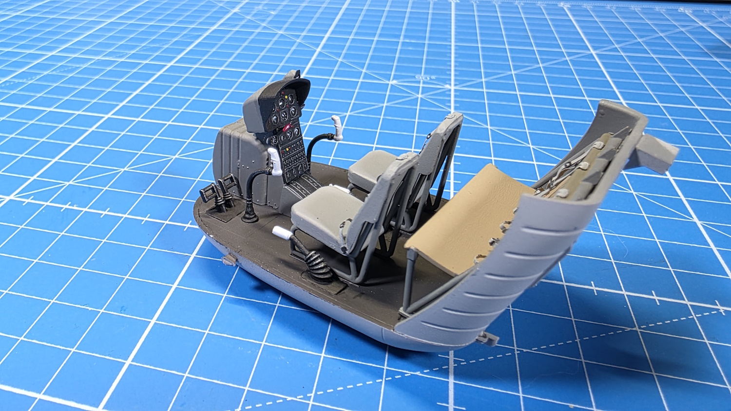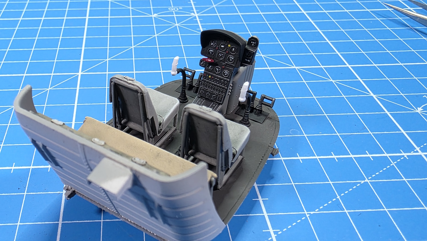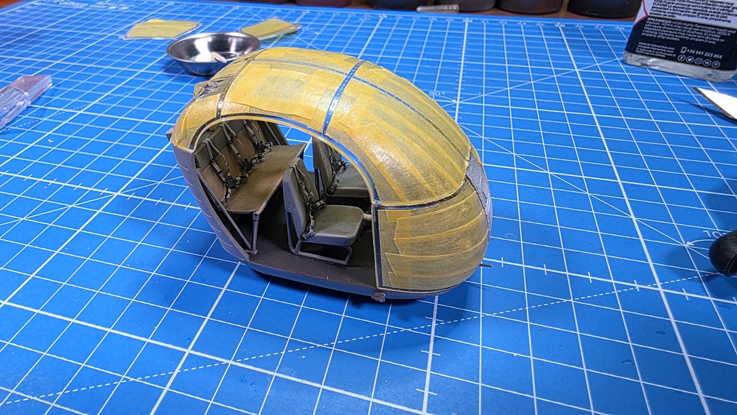 Das Cockpit wurde grundiert und in den Grundfarben lackiert. Für die Verglasung habe ich Masken angefertigt, damit später problemlos lackiert werden kann.