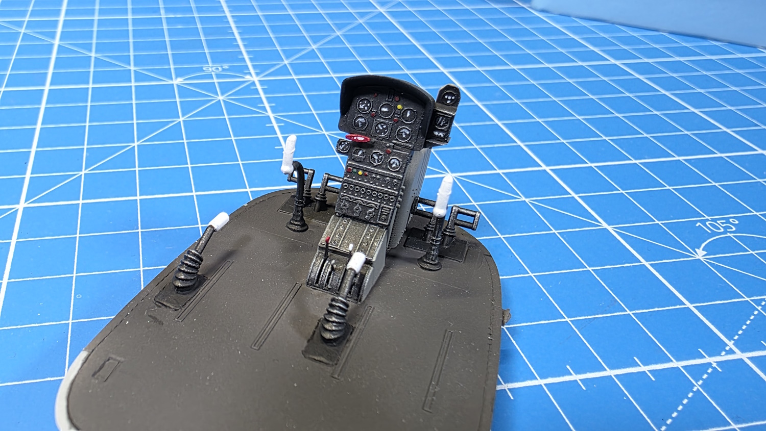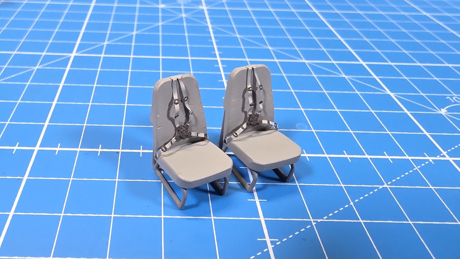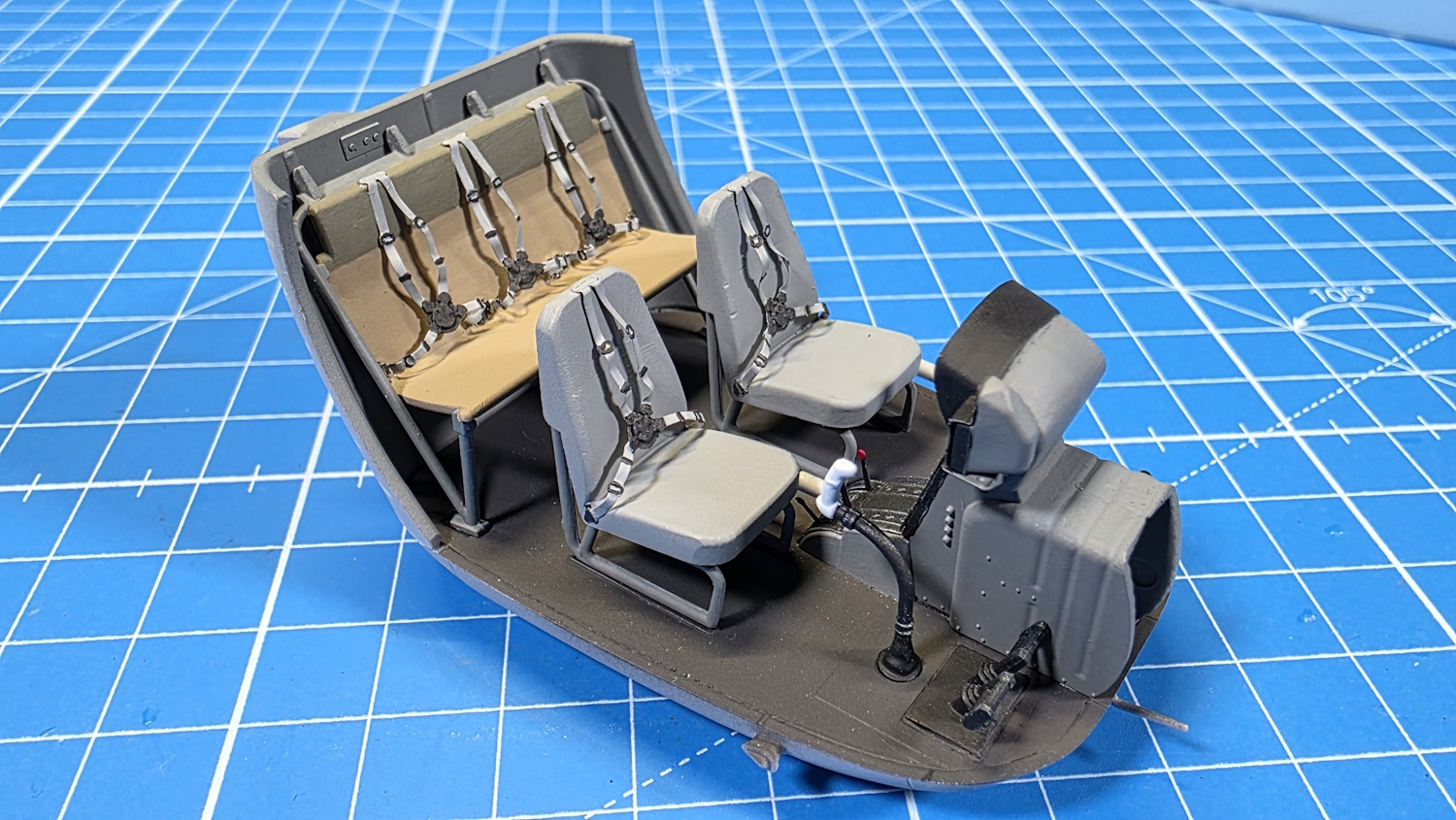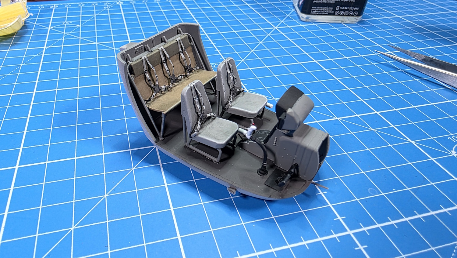 Die Sitze wurden mit einem Wash leicht verschmutzt und anschließend durch Trockenbürsten kontrastreicher ausgearbeitet. Danach wurde alles mit mattem Varnish versiegelt.