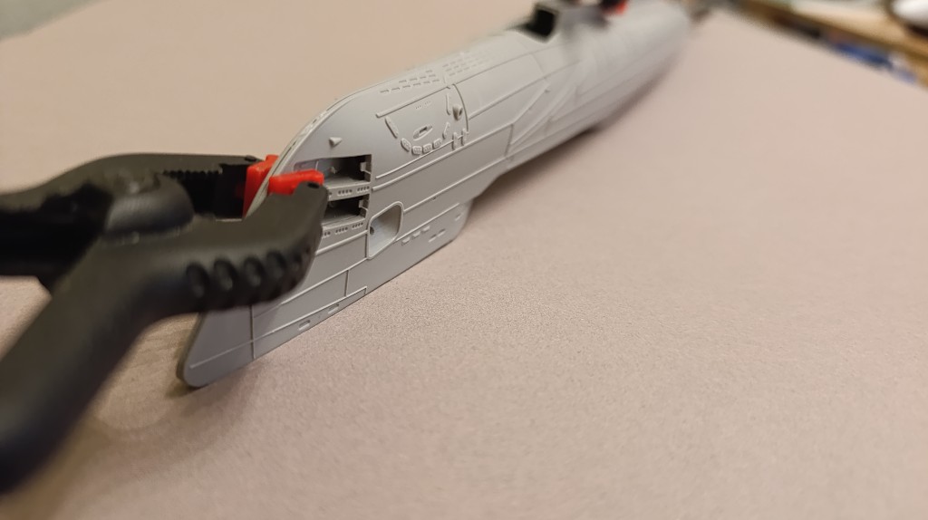Ich werde den Rumpf jetzt nicht öffnen, ich sehe hier einfach keinen Mehrwert und das Risiko den Rumpf zu zerstören. Desweiteren müsste ich die Flutschlitze von innen wieder abkleben, da ansonsten Licht in den Rumpf scheinen würde.